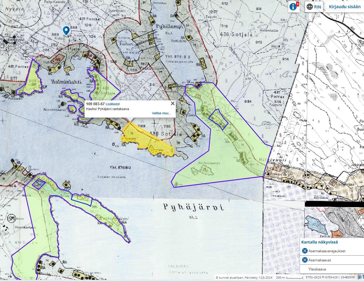 - Tieto Hämeenlinnan kaupungilta: Pyhäjärven ranta-asemakaavan mukaan rakennusoikeus olisi yhteensä enintään 100 k-m²/ RA-rakennuspaikka. Alue kuuluu vakituisen ranta-asumisen edullisuusvyöhykkeeseen, eli alueelle on mahdollista rakentaa okt:n lomamökin sijaan. Lupaprosessista vastaa rakennusvalvonta.