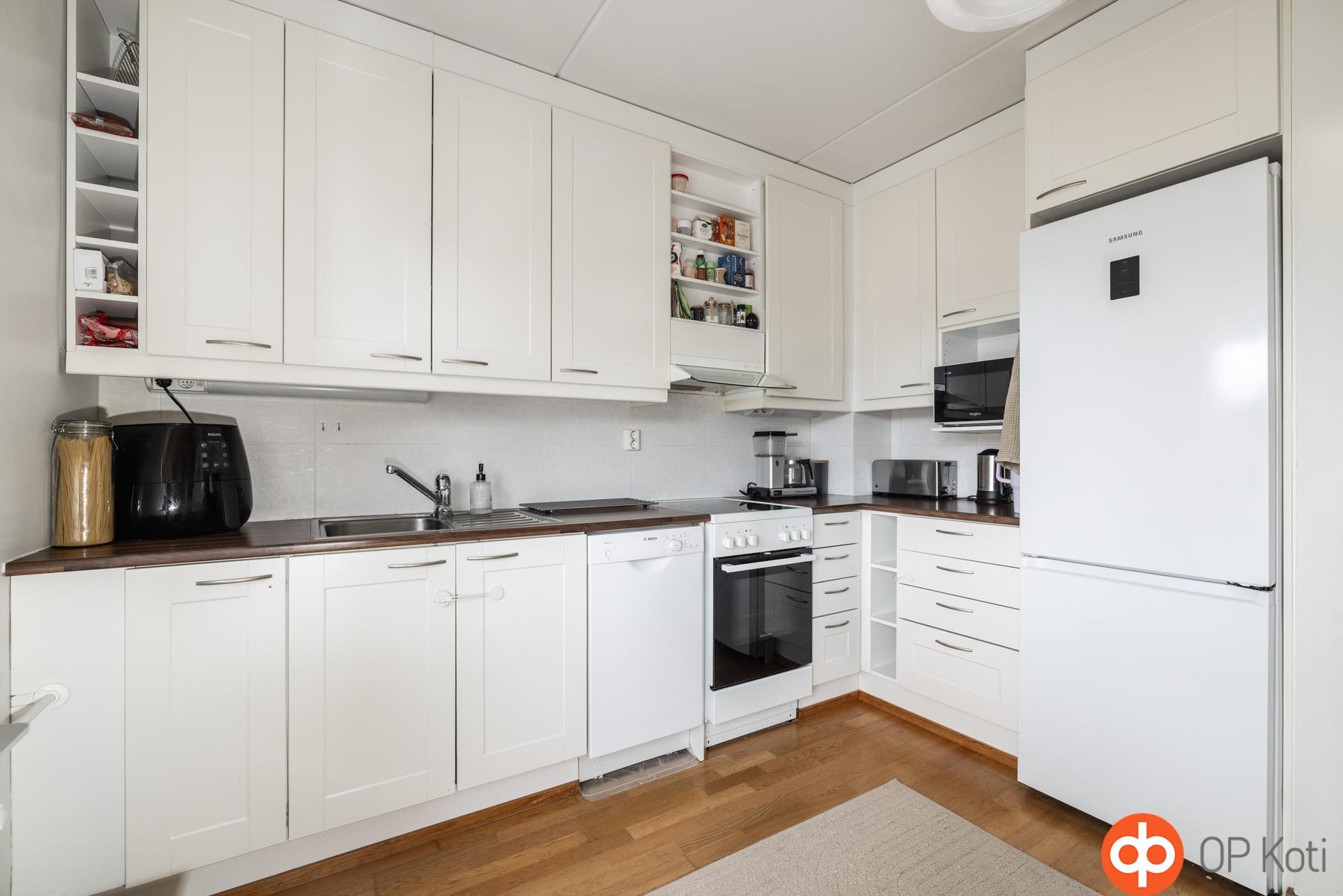 - Jääkaappipakastin, keraaminen liesi, astianpesukone, kaapistot, kiinteät valaisimet.