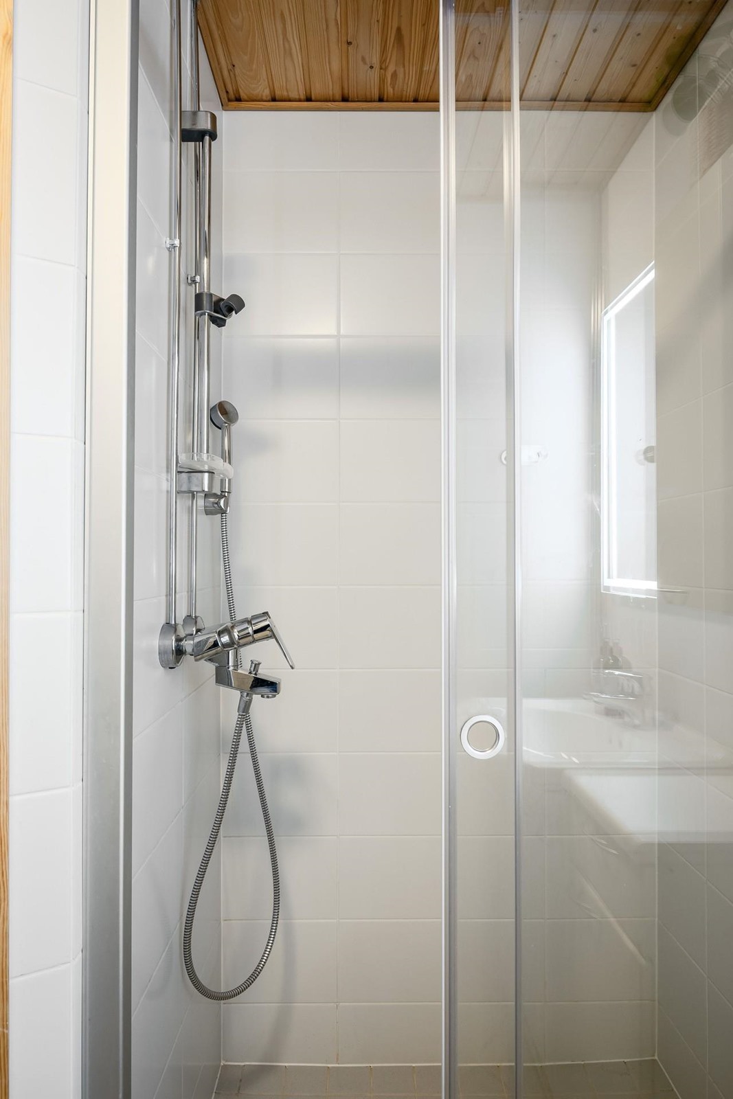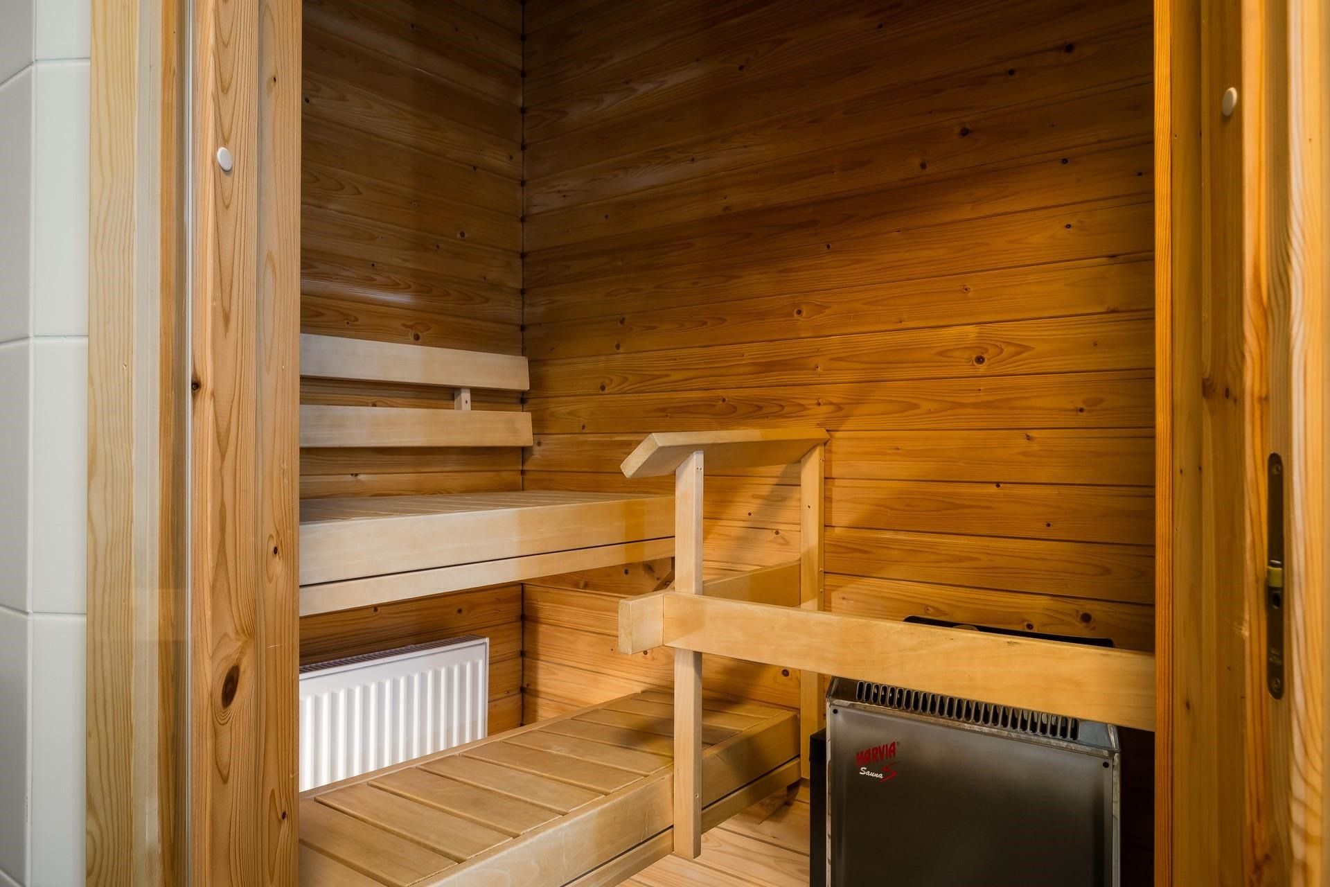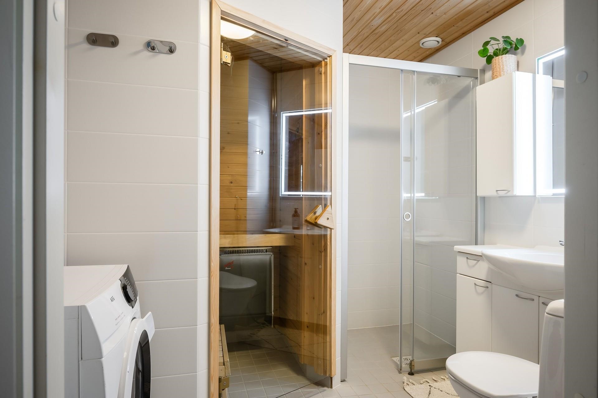 - Sauna, sähkökiuas, kylpyhuone, suihku, suihkuseinä lasinen, peilit valopeili, allaskaappi, pesukoneliitäntä, lattialämmitys, kiinteät valaisimet.