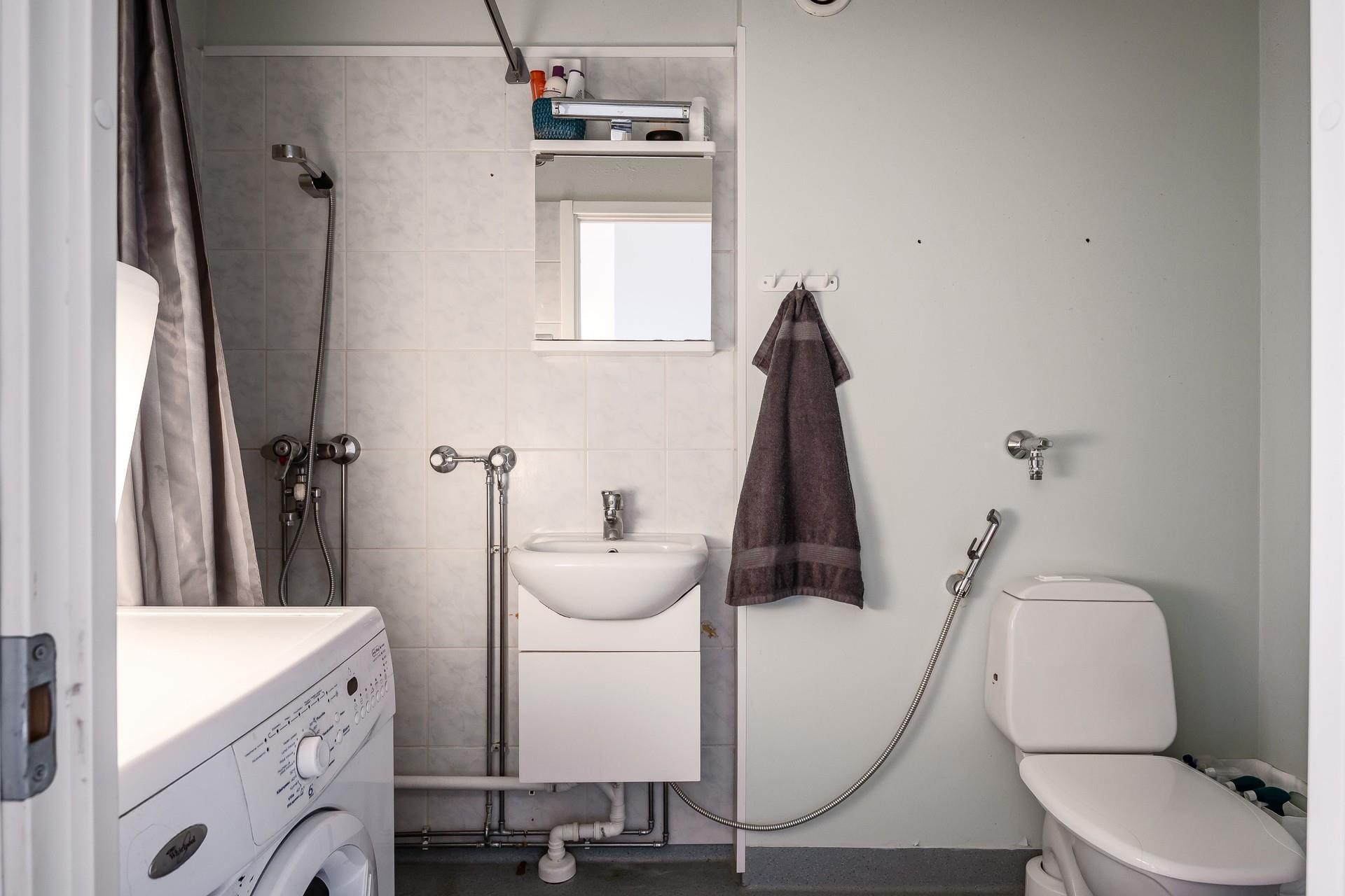- Kylpyhuone, suihku, peilikaappi, allaskaappi, pesukoneliitäntä. Kylpyhuone on tarkoitus remontoida kokonaan putkiremontin yhteydessä.