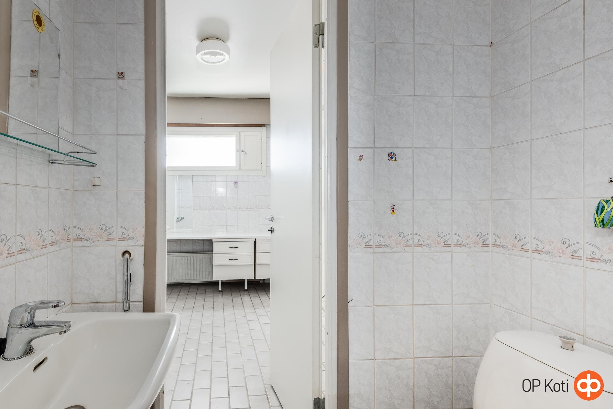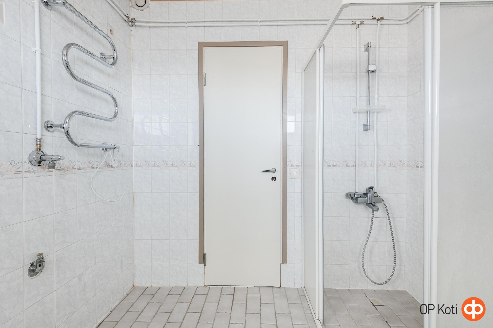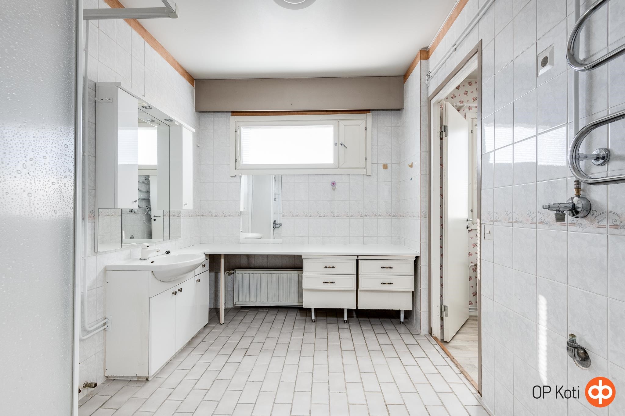 - Kylpyhuone, erillinen wc, suihku, suihkuseinä, peilit, allaskaappi, pesukoneliitäntä, kiinteät valaisimet.