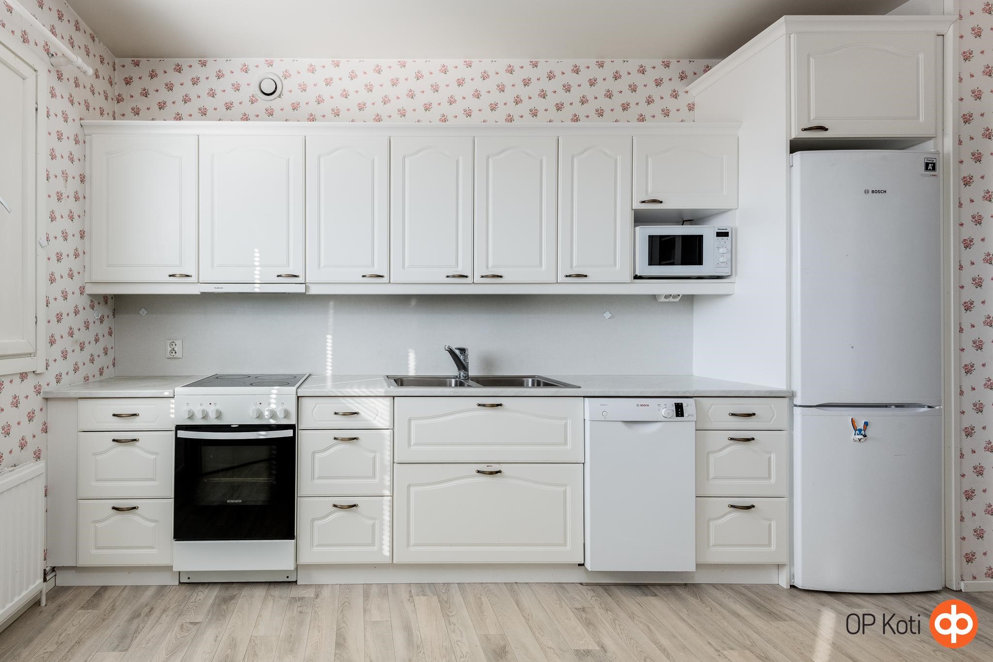- Jääkaappipakastin, keraaminen liesi, liesituuletin, astianpesukone, kiinteät valaisimet.