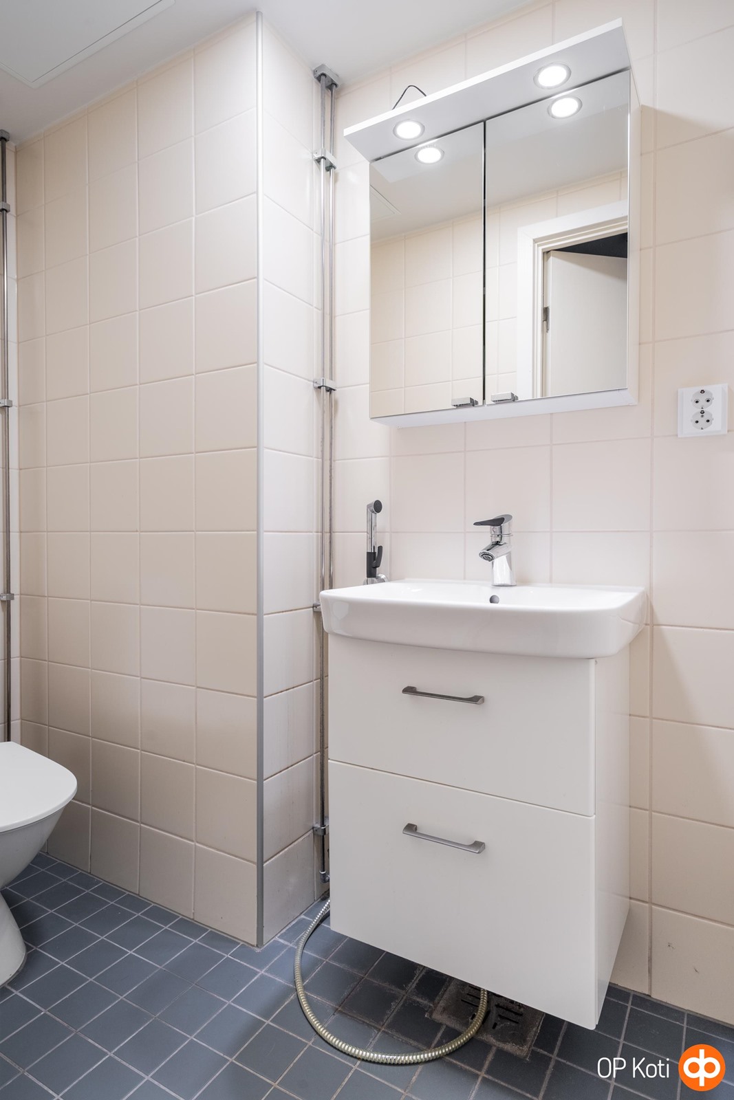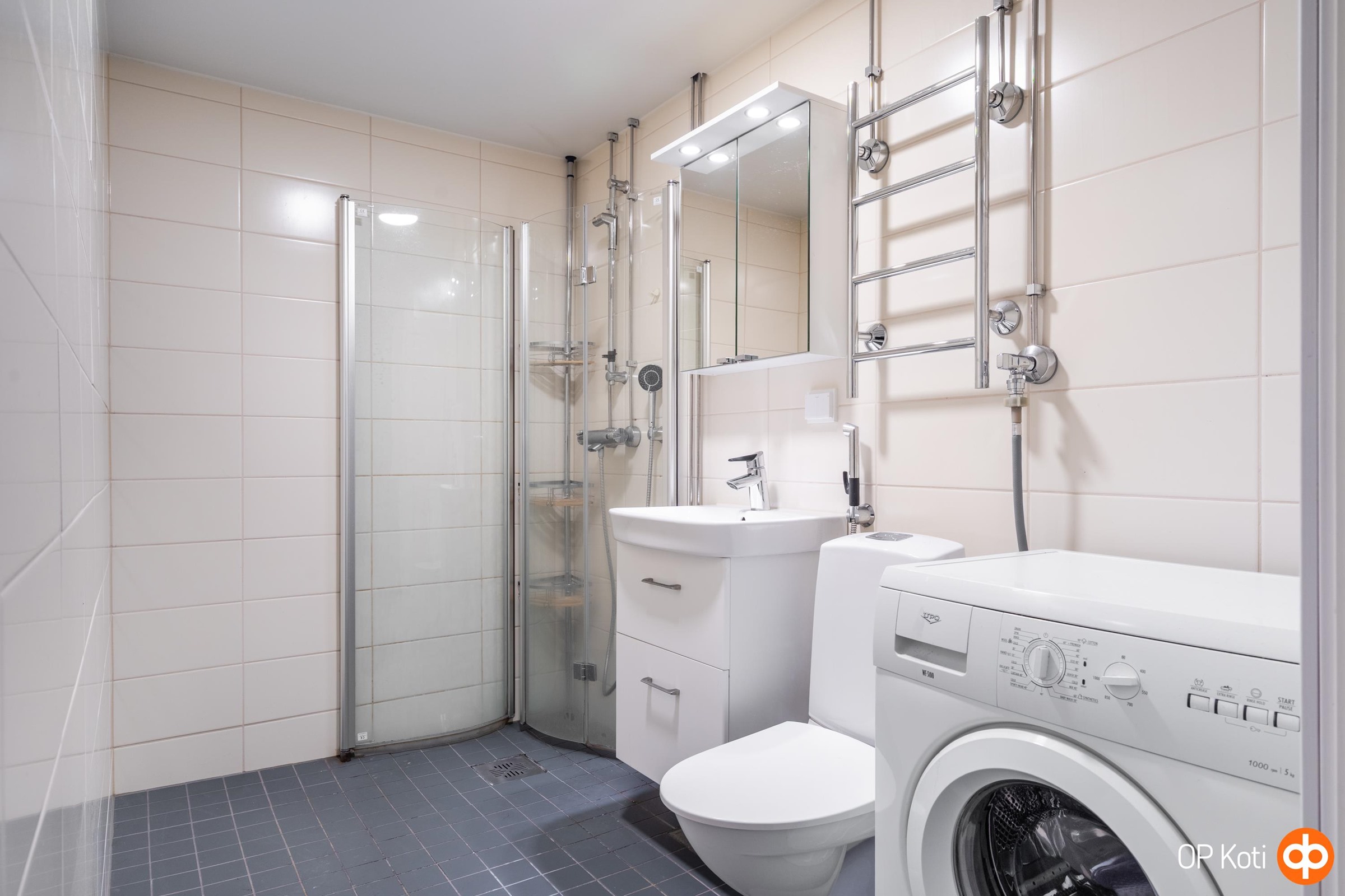 - Kylpyhuone (uusittu linjasaneerauksen yhteydessä), erillinen wc, suihku, suihkuseinä, peilikaappi, allaskaappi, pesukoneliitäntä, kiinteät valaisimet.