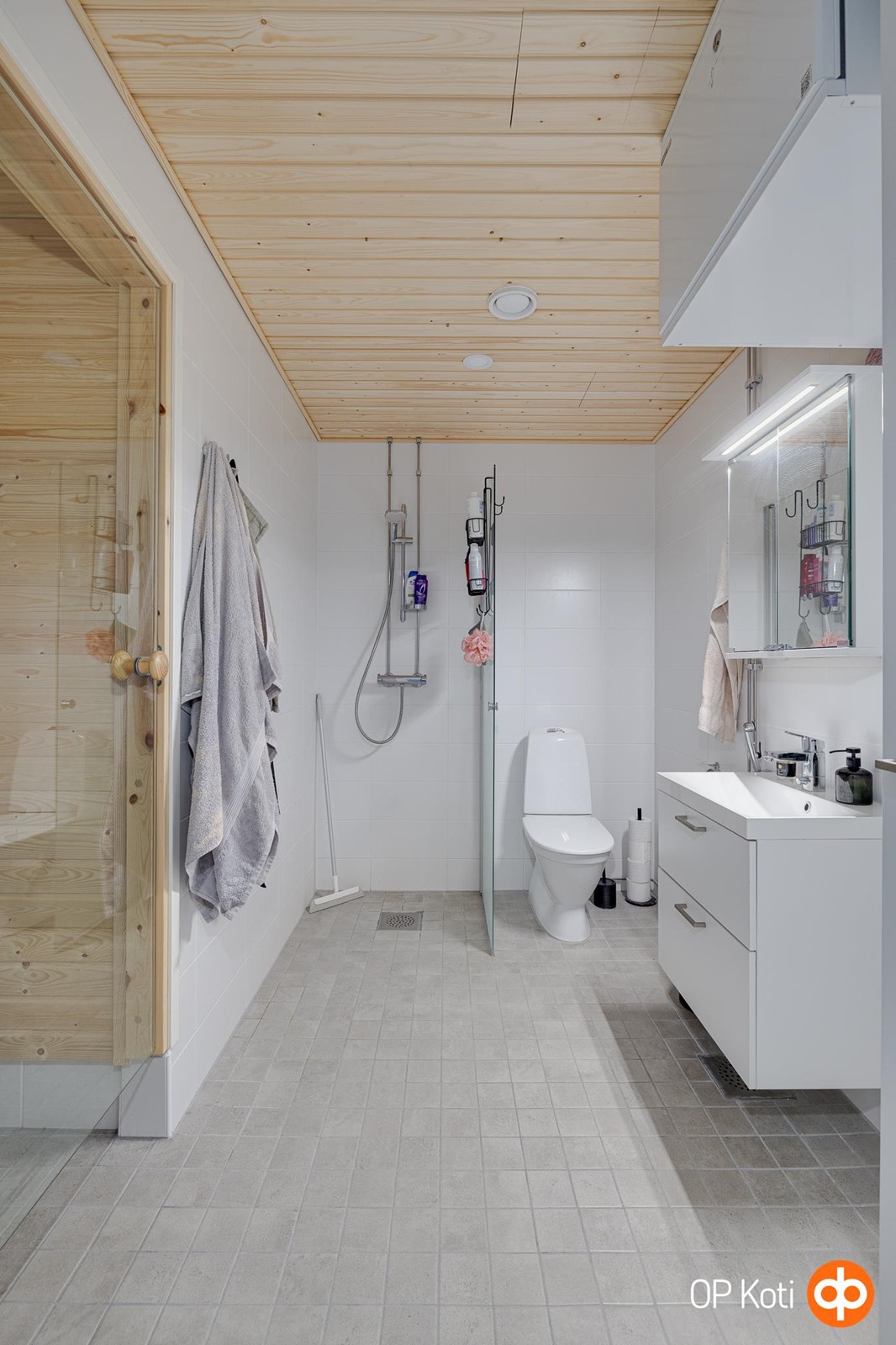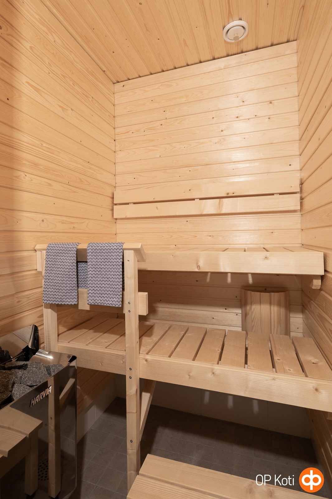- Sauna, sähkökiuas, kylpyhuone, suihku, suihkuseinä, peilikaappi, allaskaappi, pesukoneliitäntä, lattialämmitys, kiinteät valaisimet.