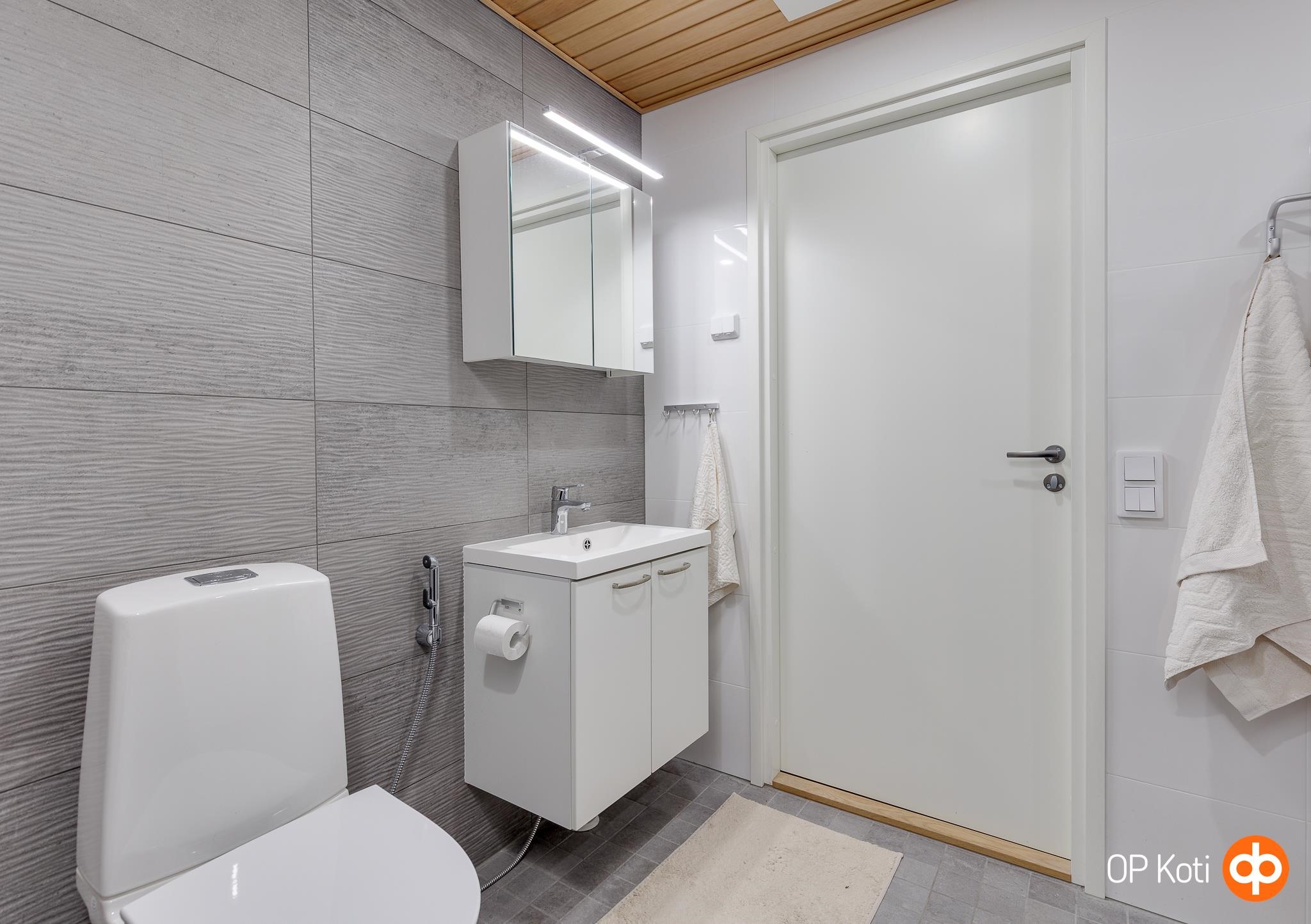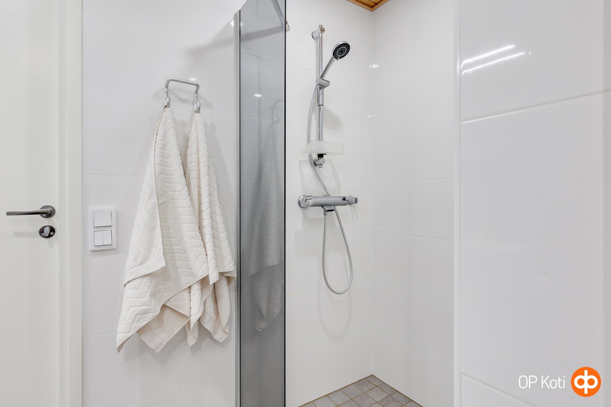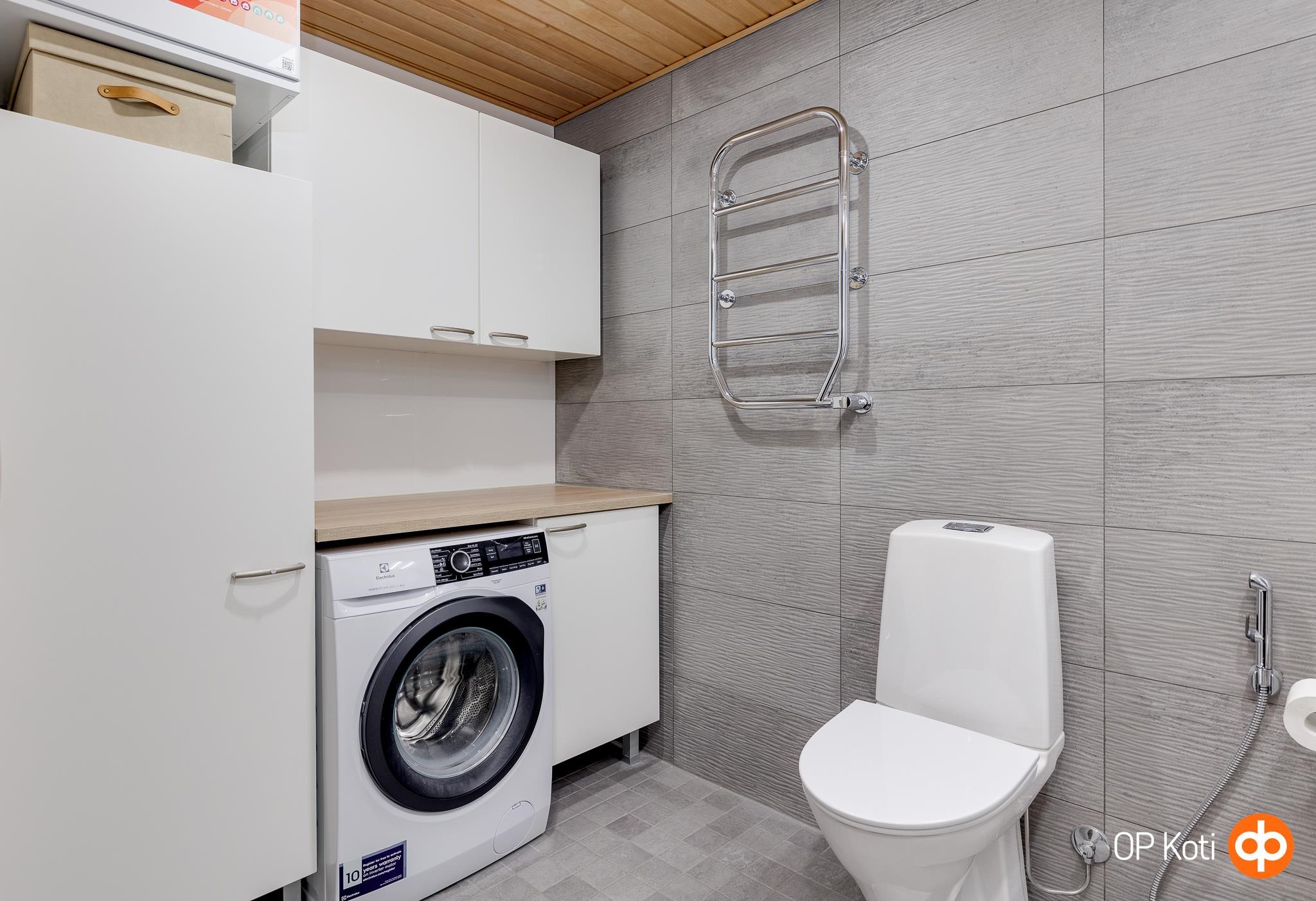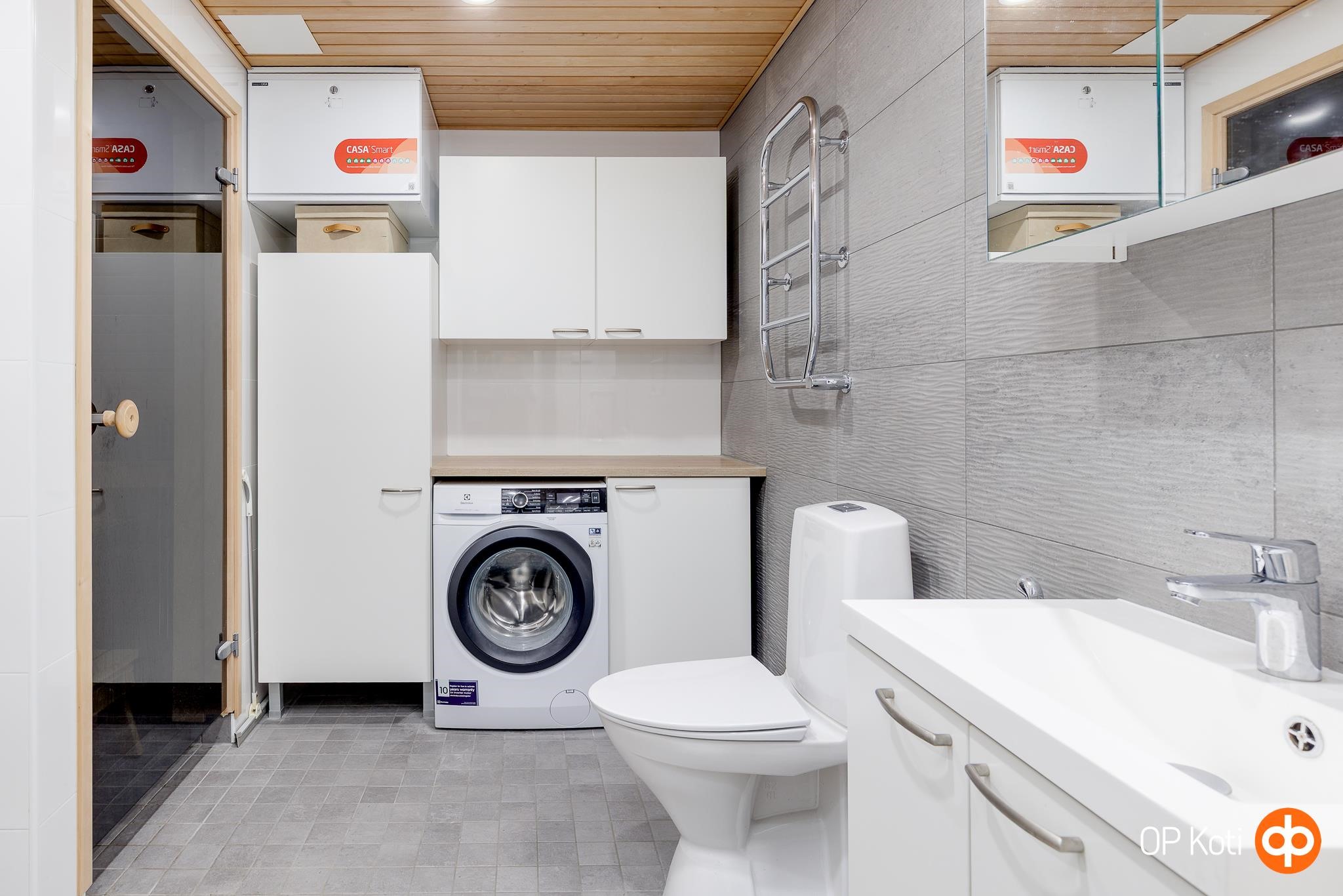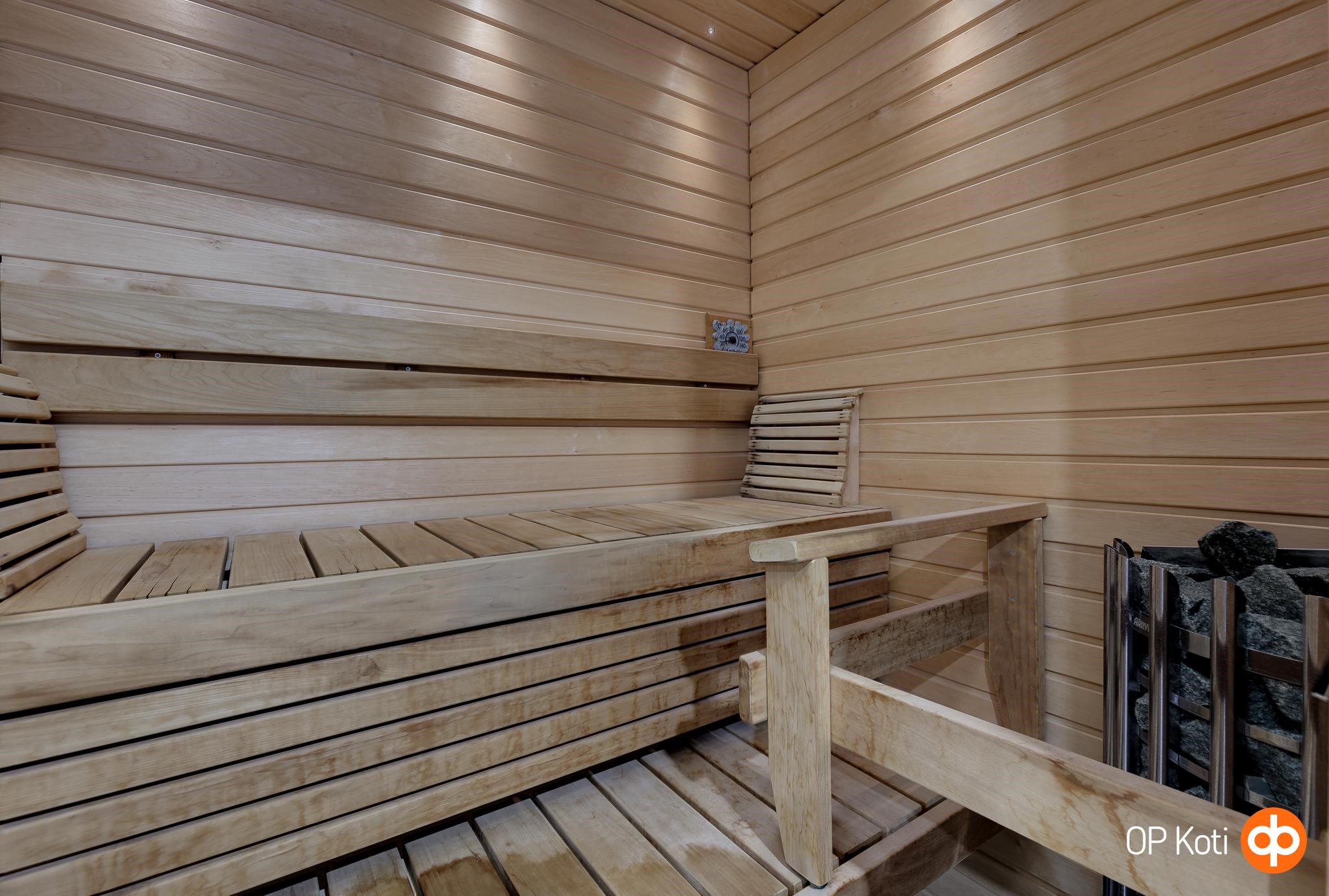 - Sauna, sähkökiuas, kylpyhuone, suihku, peilikaappi, allaskaappi, pesukoneliitäntä, lattialämmitys, kiinteät valaisimet.