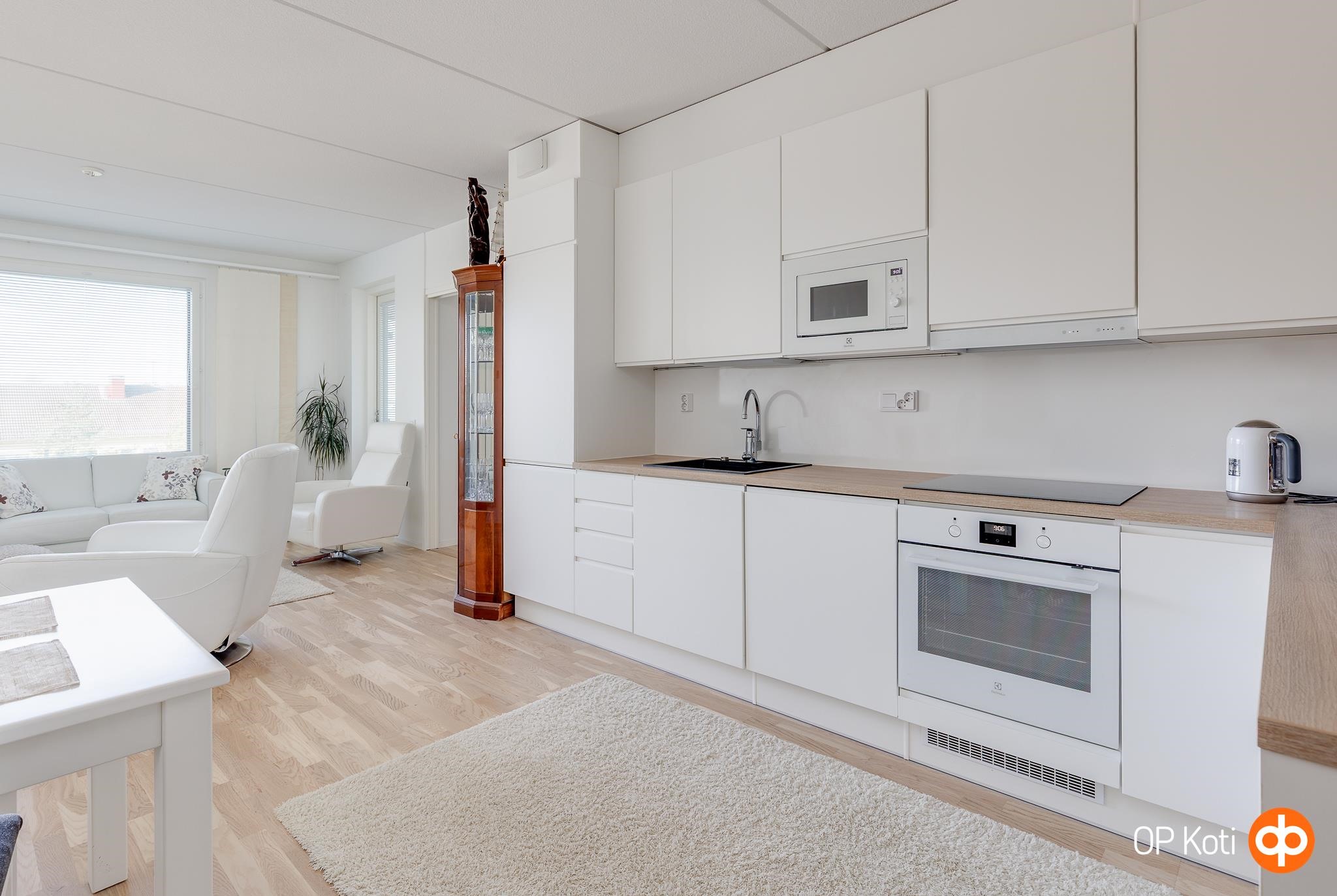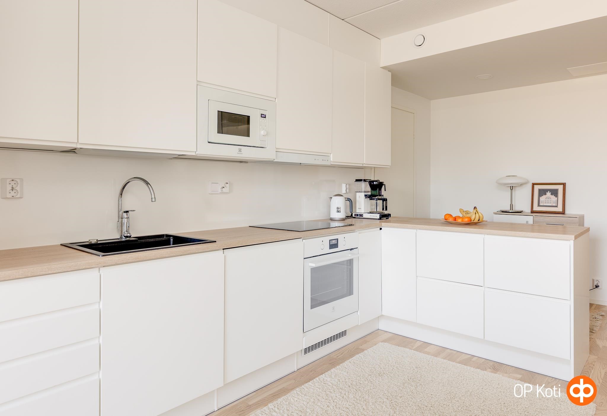 - Jääkaappipakastin, erillisuuni, induktioliesi, liesituuletin, mikroaaltouuni, astianpesukone, kaapistot, kiinteät valaisimet.