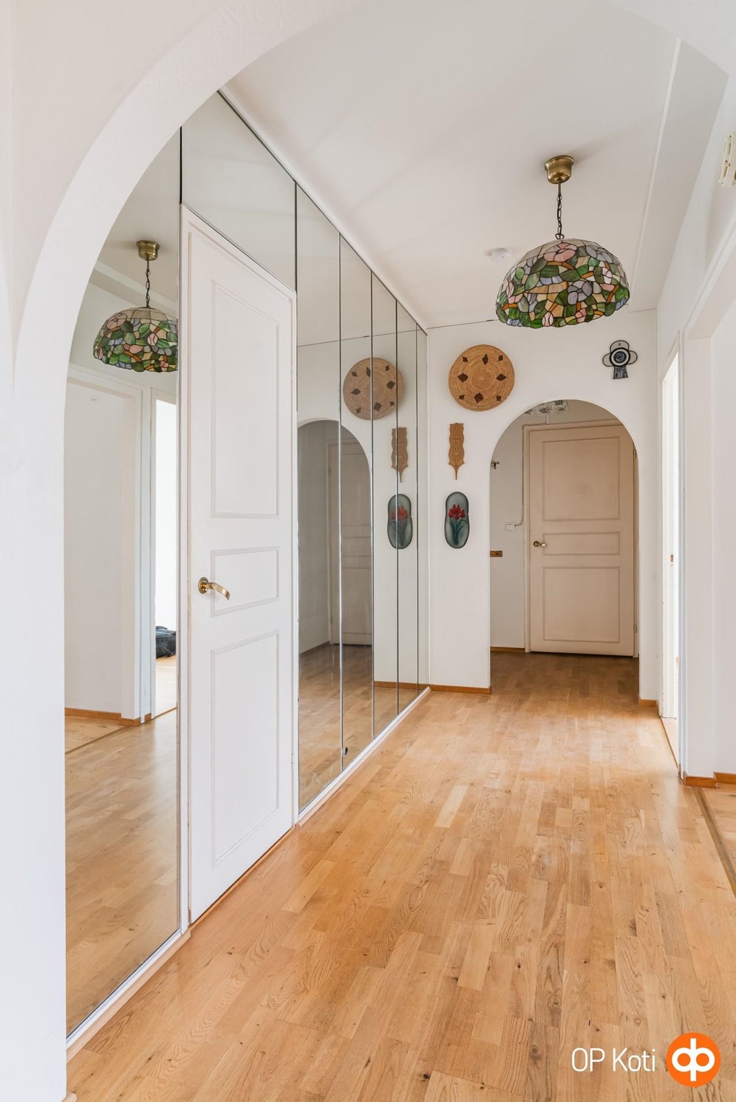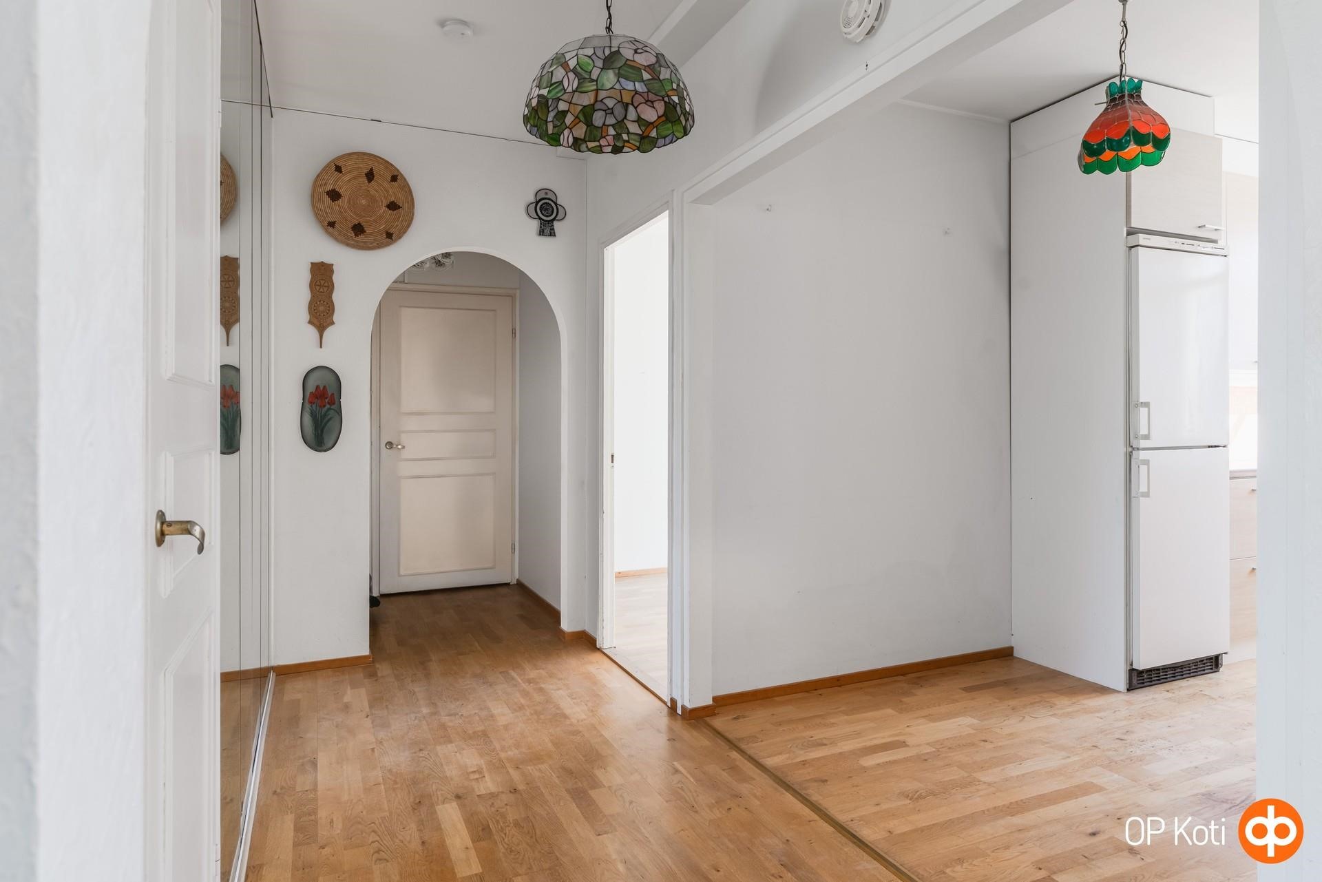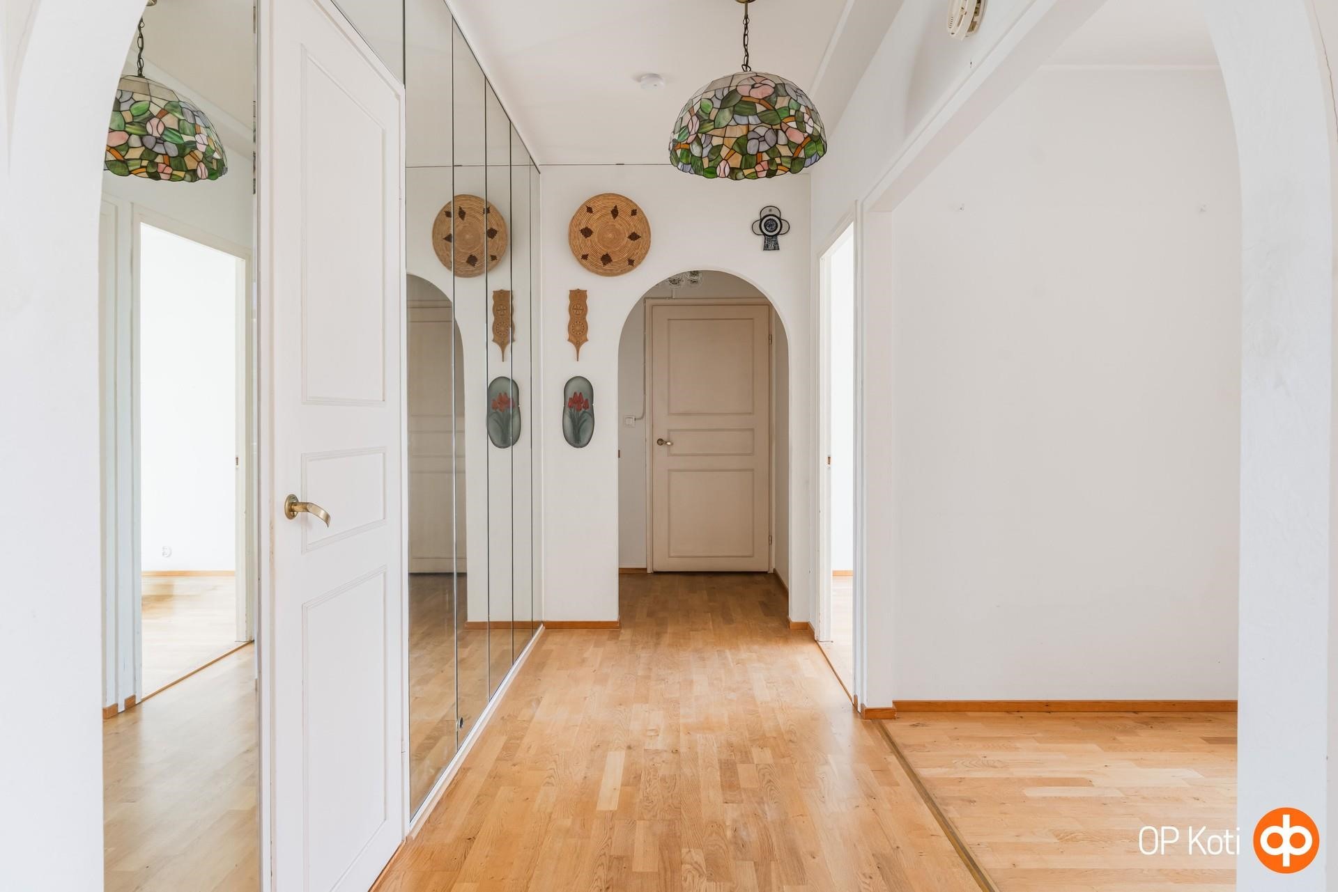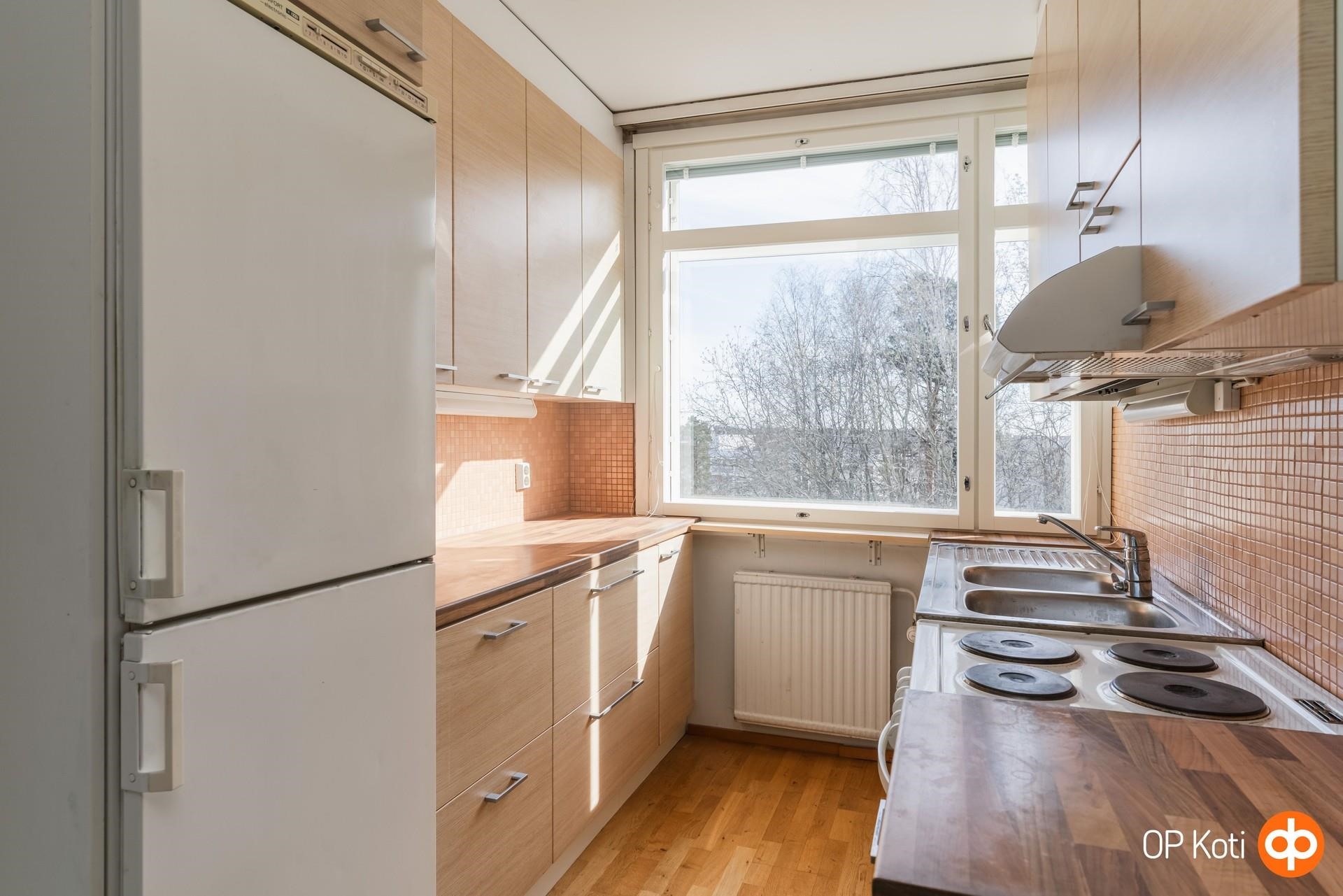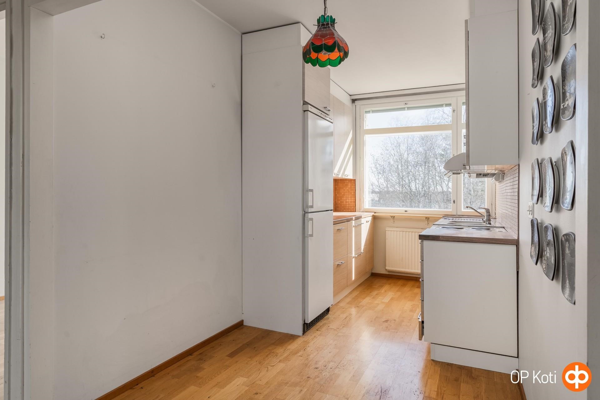 Asunto sijaitsee hissitalon neljännessä kerroksessa (4/5 krs). Asunnon pinnat ovat siistissä, käytetyssä kunnossa, ja läpitalon pohjaratkaisu yhdessä suurten ikkunoiden kanssa tuo kotiin runsaasti luonnonvaloa. Kaksi reilun kokoista makuuhuonetta tarjoavat toimivat ja mukavat puitteet asumiseen, ja niiden väliin sijoittuva keittiö on omana rauhallisena kokonaisuutenaan. Tilava olohuone avautuu vehreisiin maisemiin, ja olohuoneen yhteydessä oleva lasitettu parveke jatkaa oleskelutilaa pitkälle syksyyn. Kylpyhuone on uusittu yhtiön linjasaneerauksen yhteydessä vuonna 2014. Sisään tullessa vastassa on tilava eteinen sekä vaatehuone, jotka tarjoavat runsaasti käytännöllistä säilytystilaa.