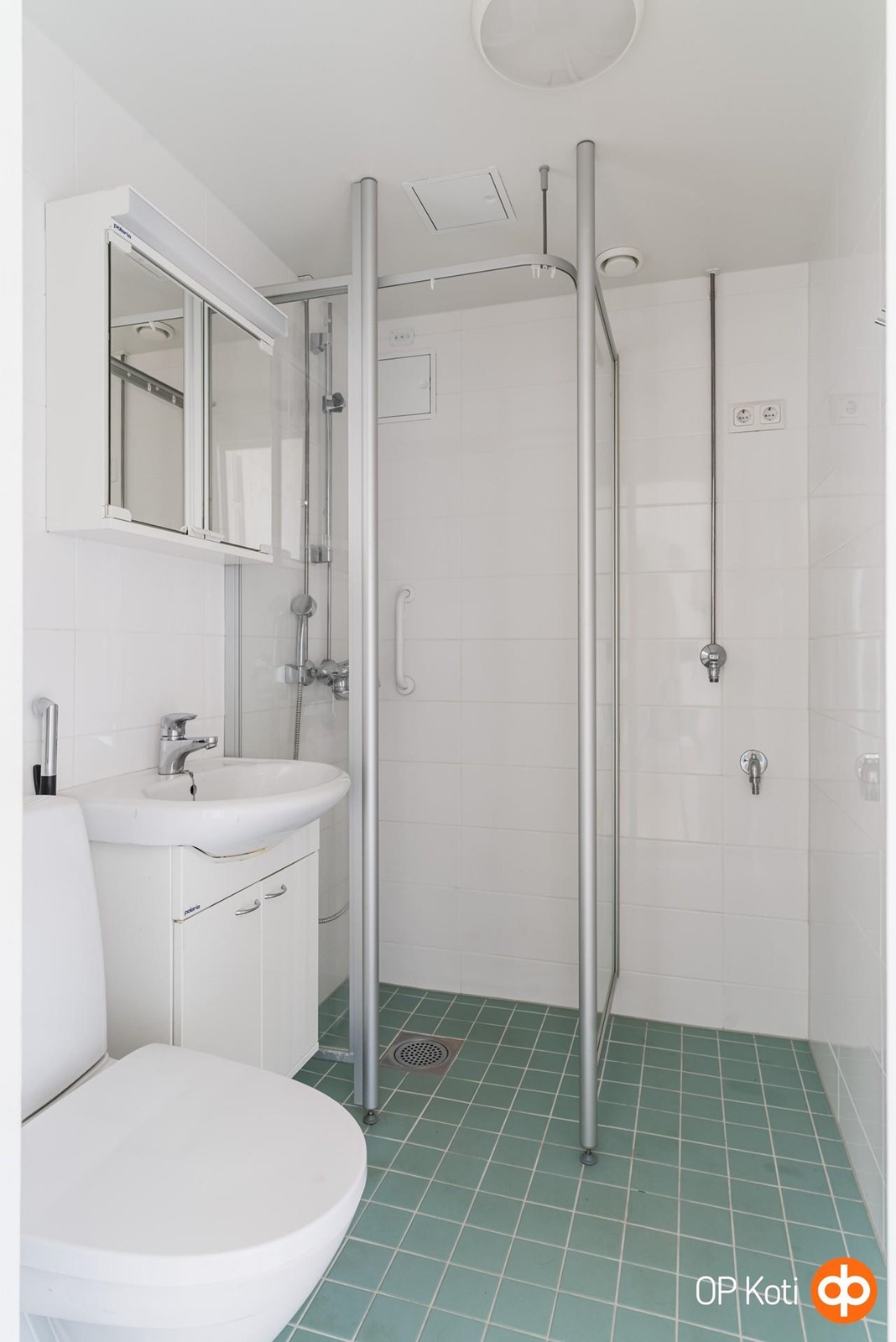 - Kylpyhuone, suihkuseinä 2 kpl, peilikaappi, kaapit, allaskaappi, pesukoneliitäntä, lattialämmitys, kiinteät valaisimet. Pyyhepatteri