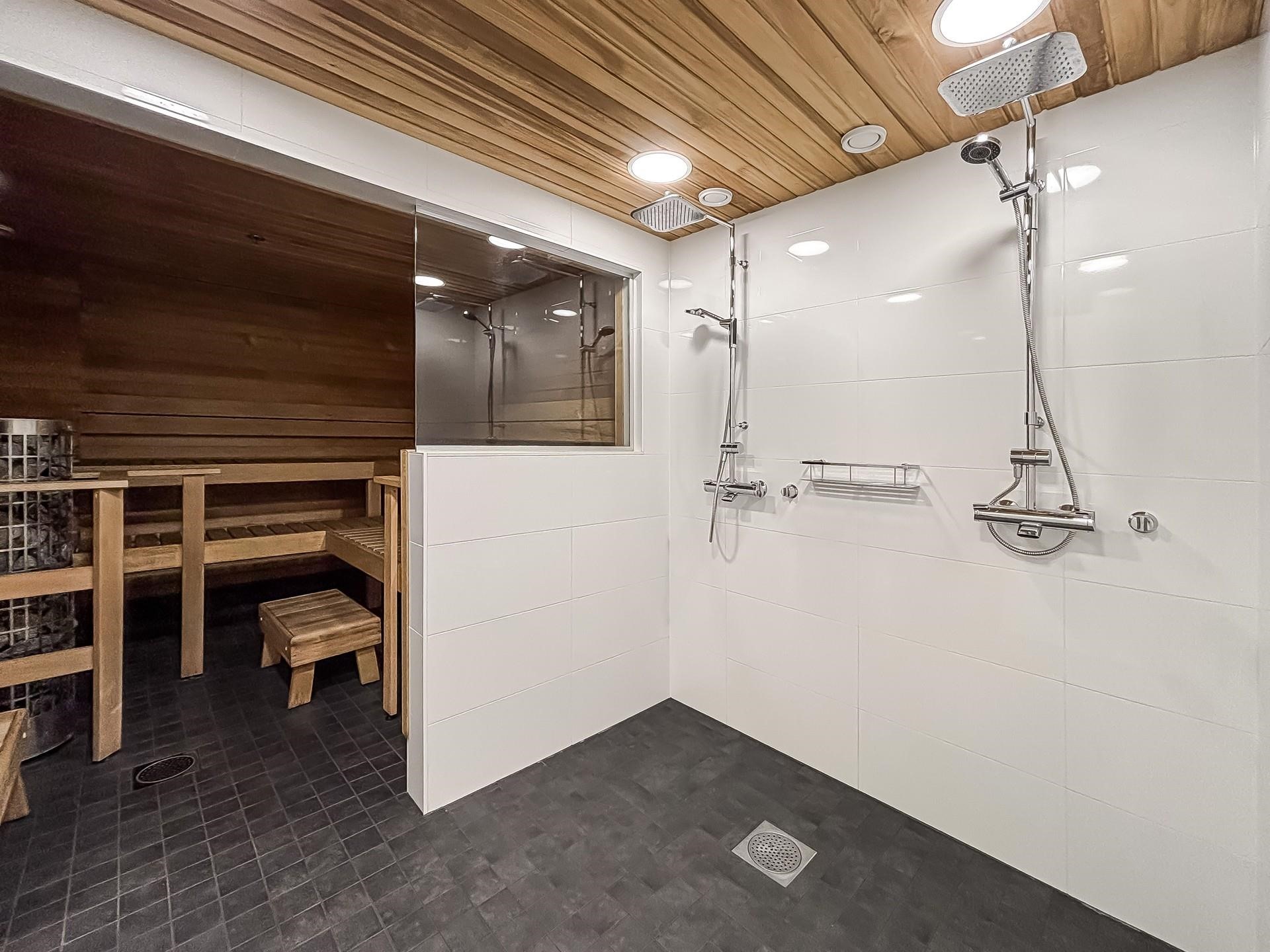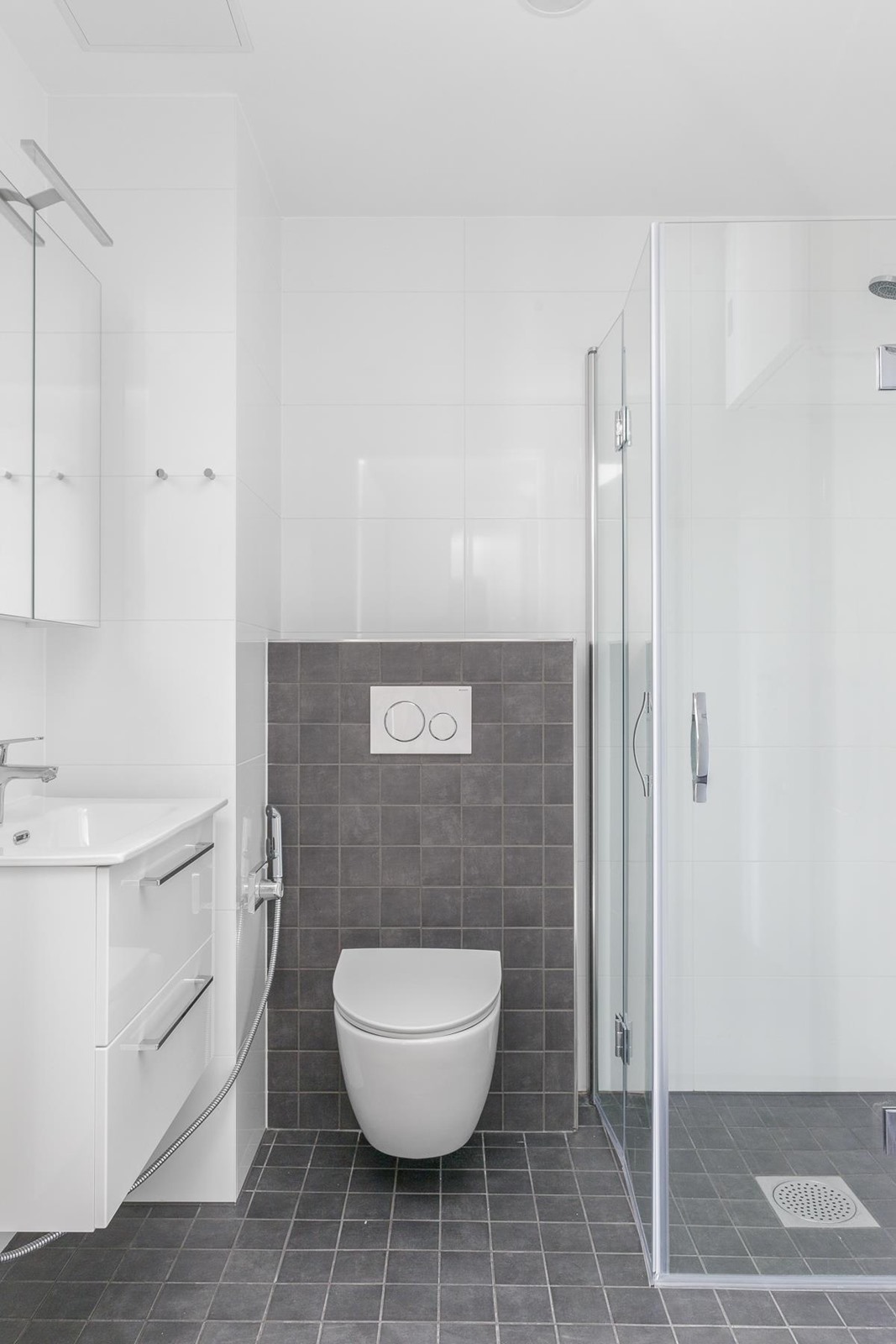 - Kylpyhuoneen varusteet: Valkoiset Olive- kaapistot, Oras Oras Optima suihkusetti, suihkuseinä, valaistu peilikaappi, allaskaappi integroidulla altaalla, Oras Vega Bidetta -bidesuihku, Oras Vega ekonappihana, pesukoneliitäntä omalla poistoputkella Oras/Faluplast. Wc -istuin IDO Seven D/Glow. Osassa huoneistoissa on seinään integroitu wc- istuin. Sähkötoiminen lattialämmitys.