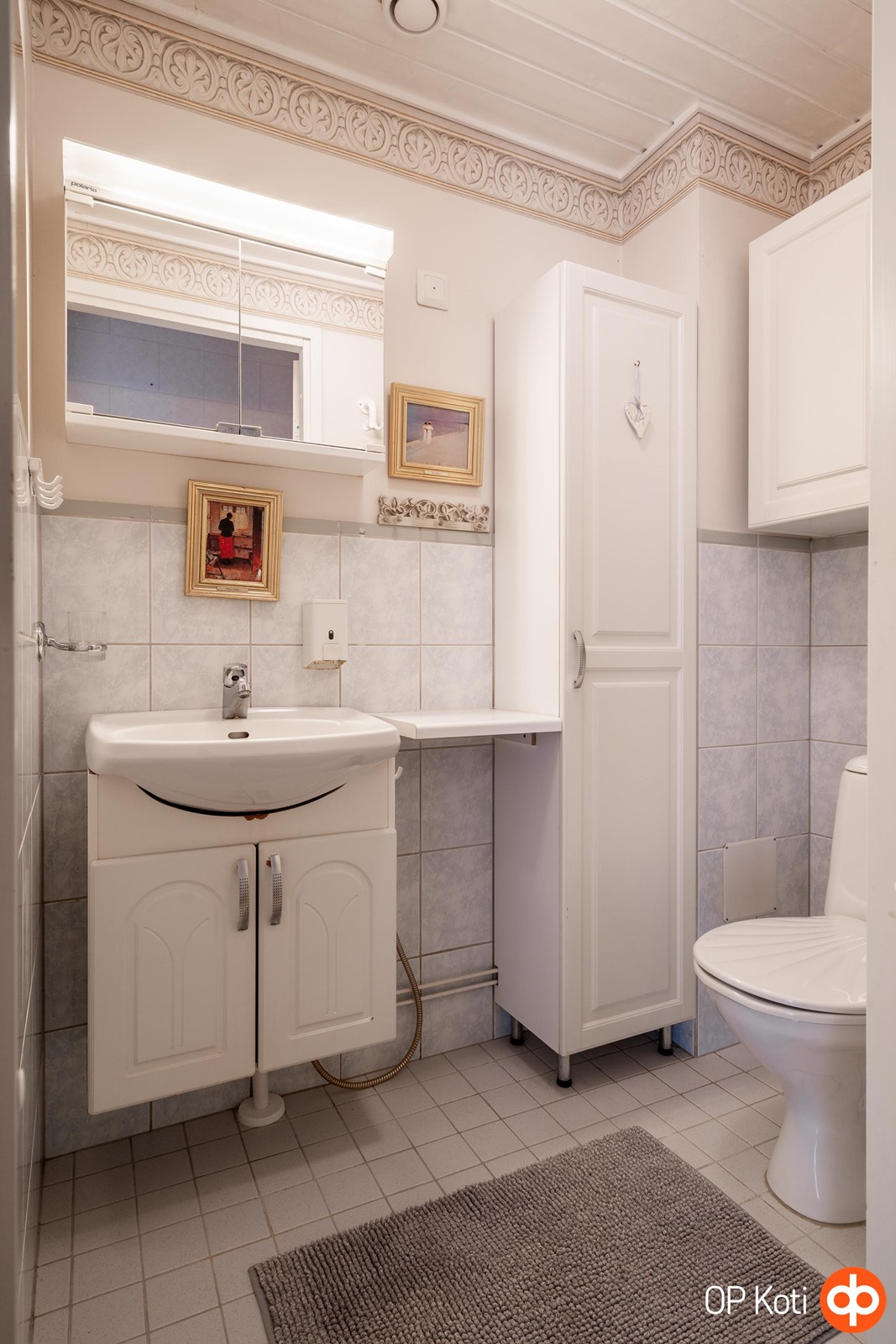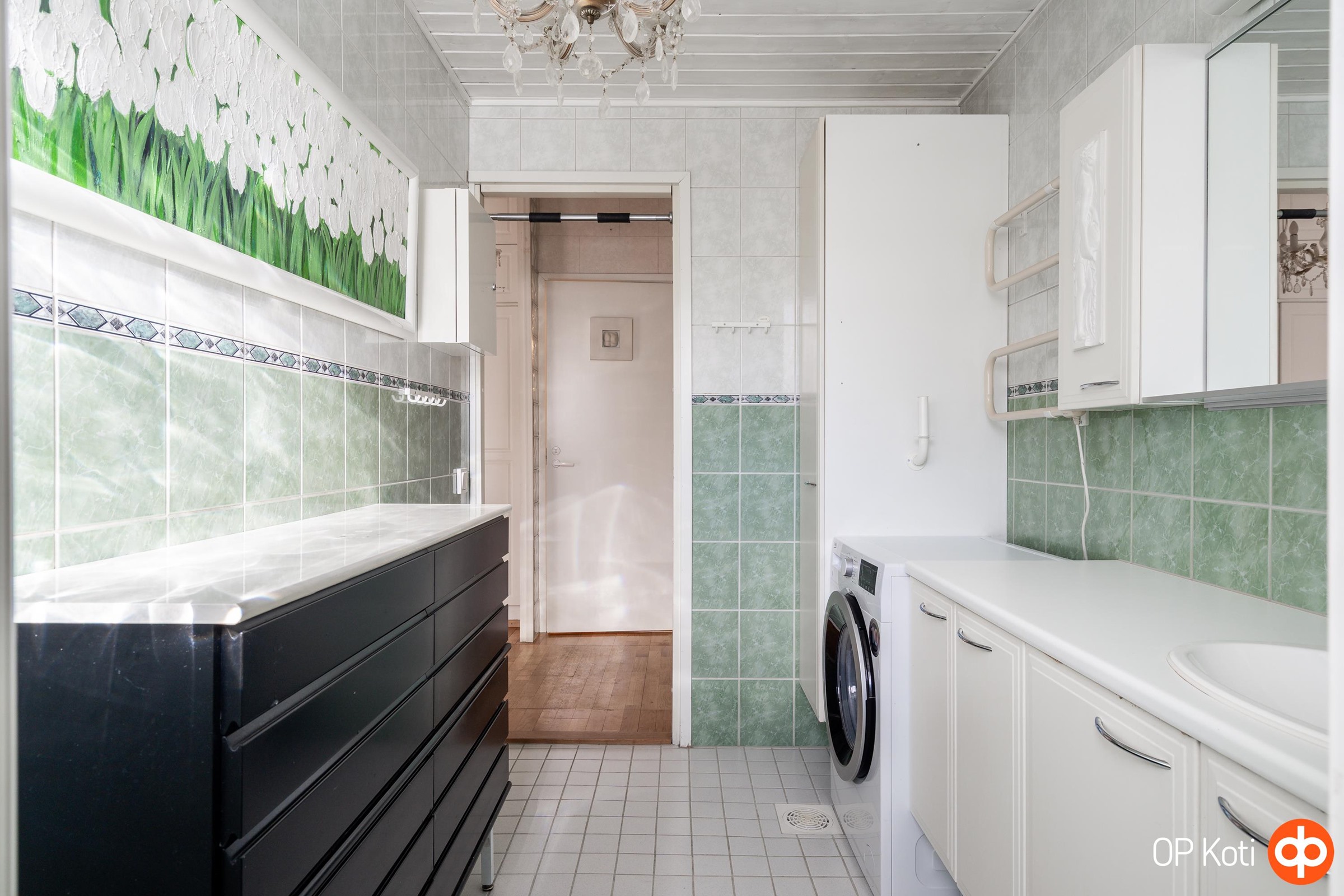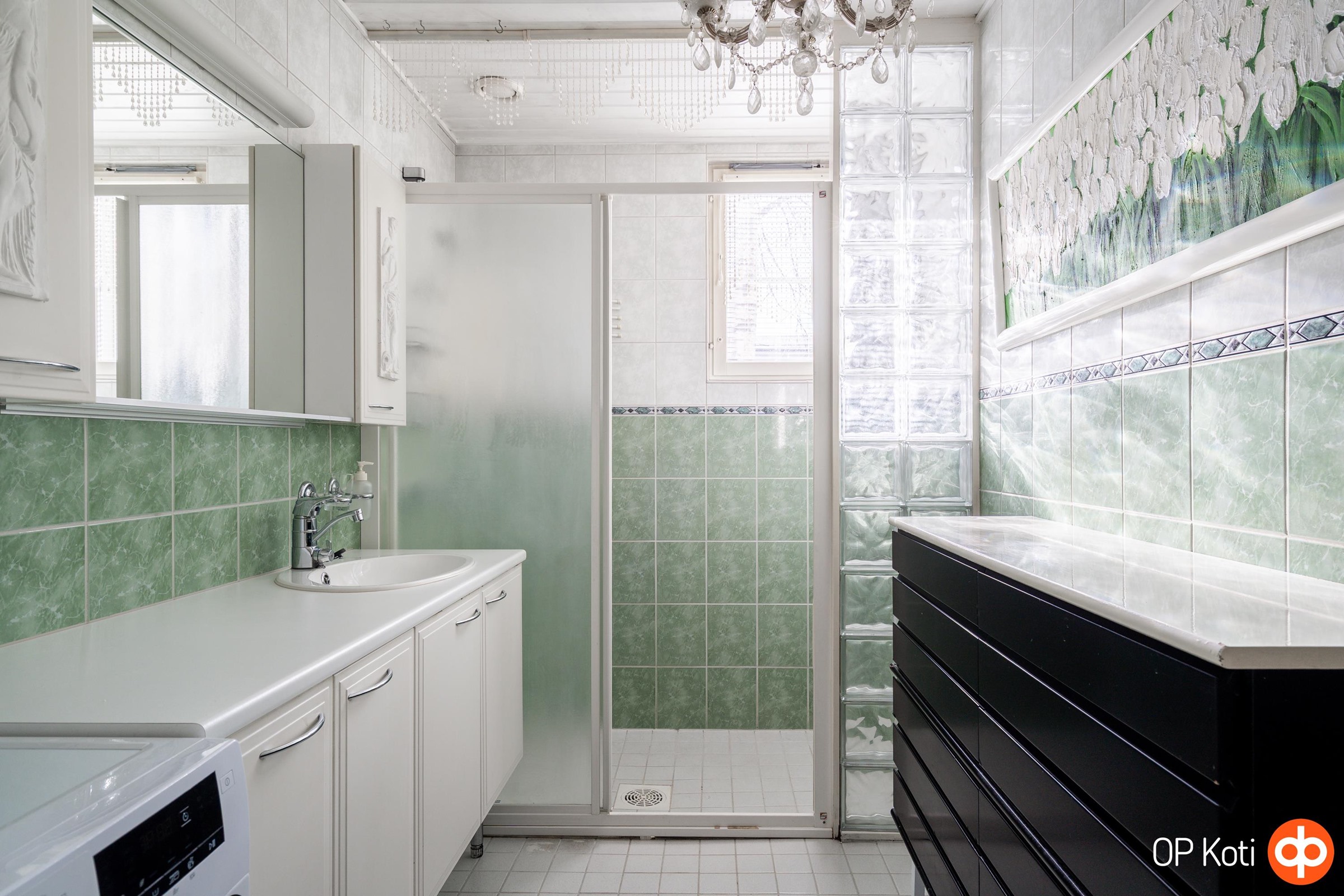 - Kylpyhuone, erillinen wc, suihku, suihkuseinä, peilit, peilikaappi, kaapit, allaskaappi, pesukoneliitäntä, kiinteät valaisimet.