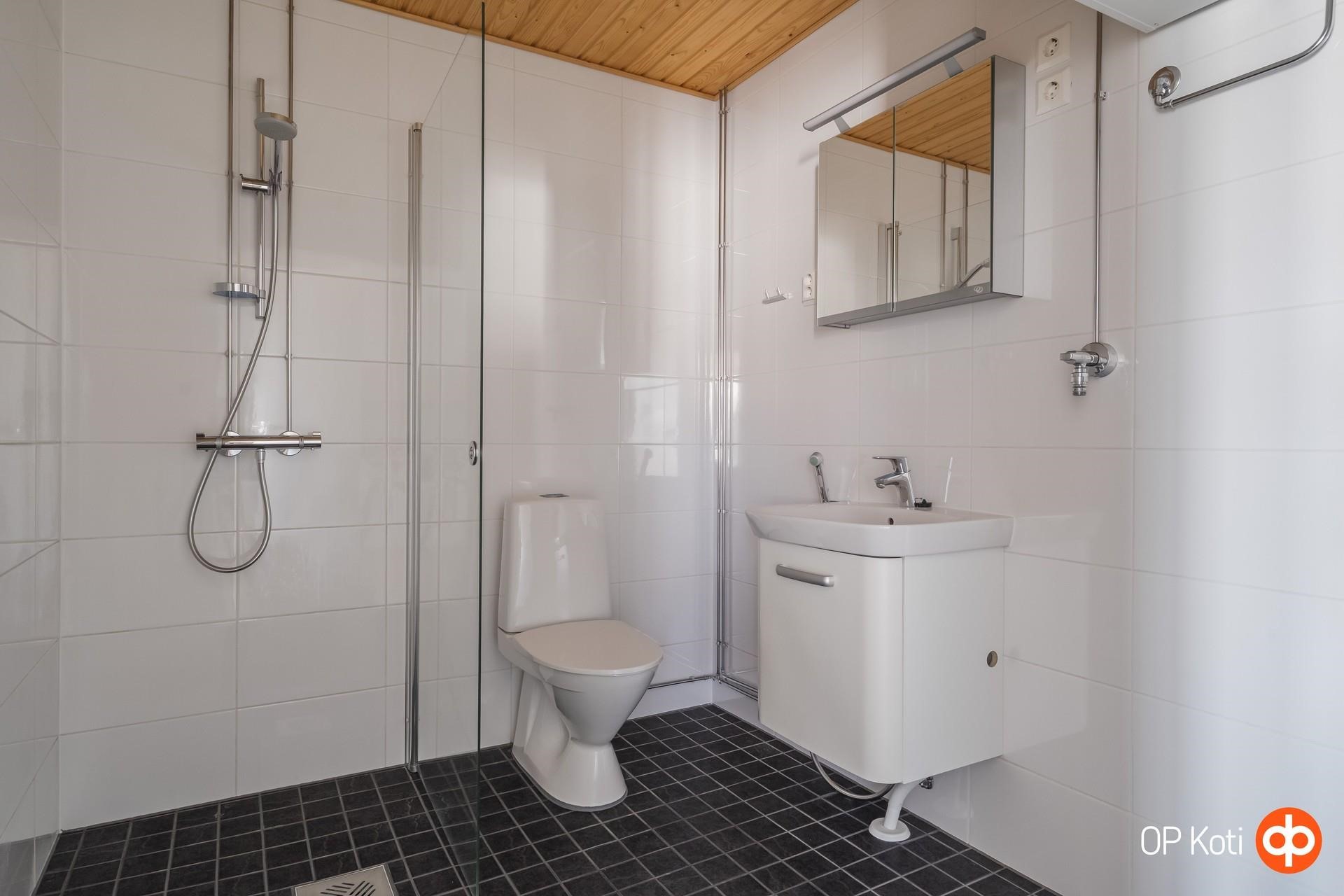 - Suihku, suihkuseinä, peilikaappi, allaskaappi, pesukoneliitäntä, lattialämmitys (mukavuuslattialämmitys sähköllä), kiinteät valaisimet.