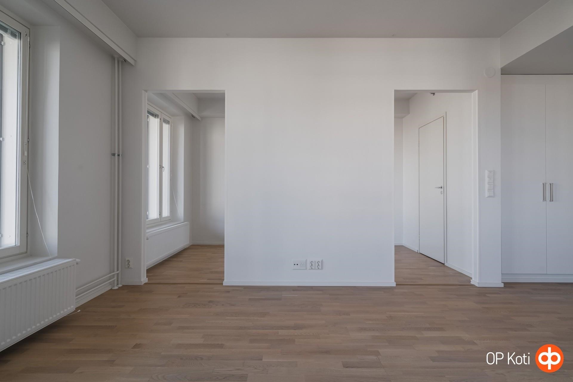 Keittiö: Seinäpinnat valkea maali, lattiat tammiparkettia. Olohuone: Seinäpinnat valkea maali, lattiat tammiparkettia. Makuuhuone 1: Seinäpinnat valkea maali, lattiat tammiparkettia. Kylpyhuone: Laatoitettu.