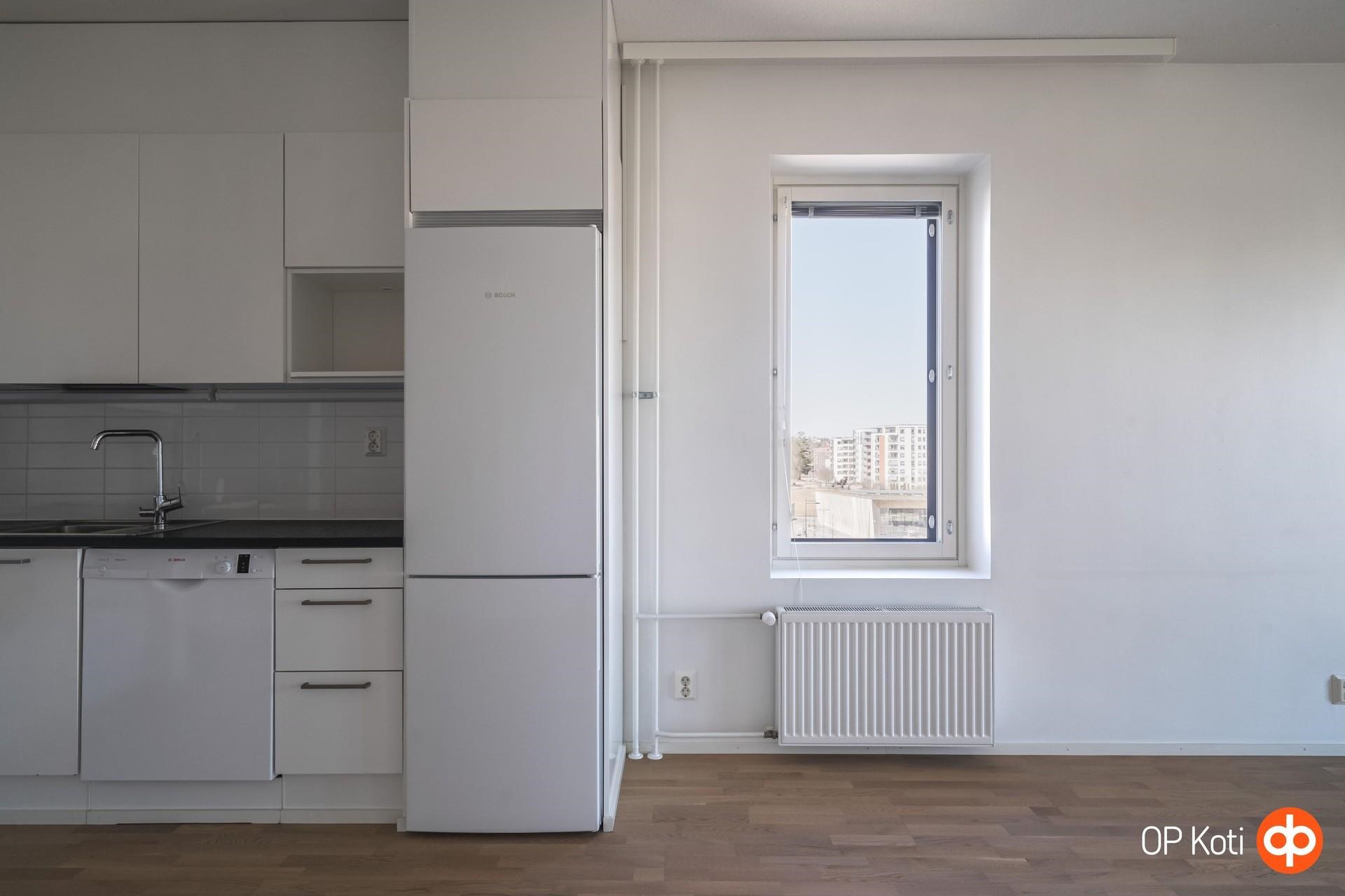- Jääkaappipakastin, erillisuuni, liesitaso, liesituuletin, astianpesukone, kaapistot, kiinteät valaisimet.