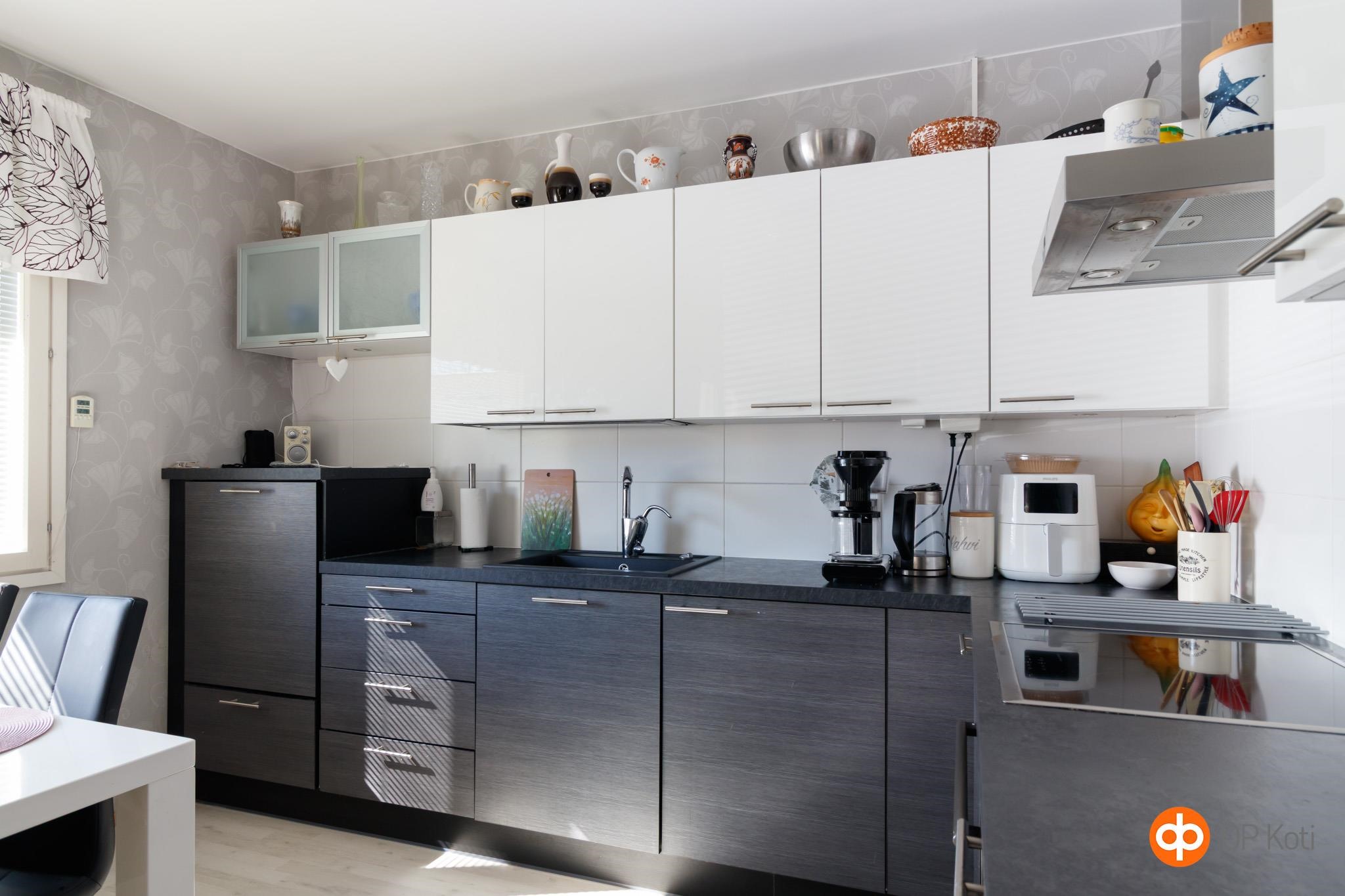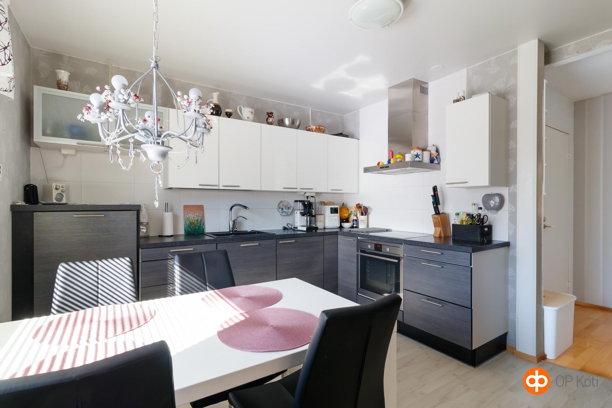 - Jääkaappipakastin, erillisuuni, liesitaso induktio, liesituuletin, astianpesukone integroitu, kaapistot, kiinteät valaisimet.