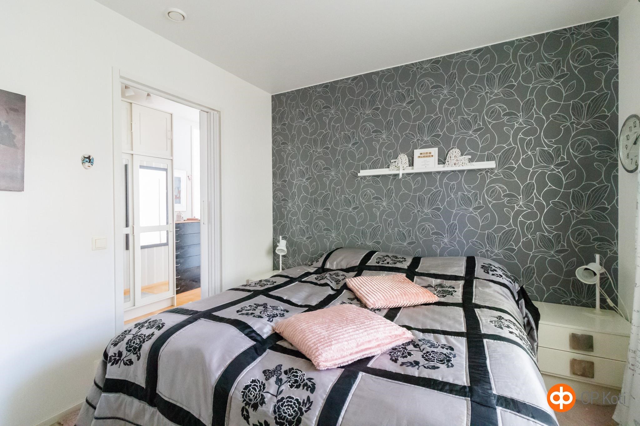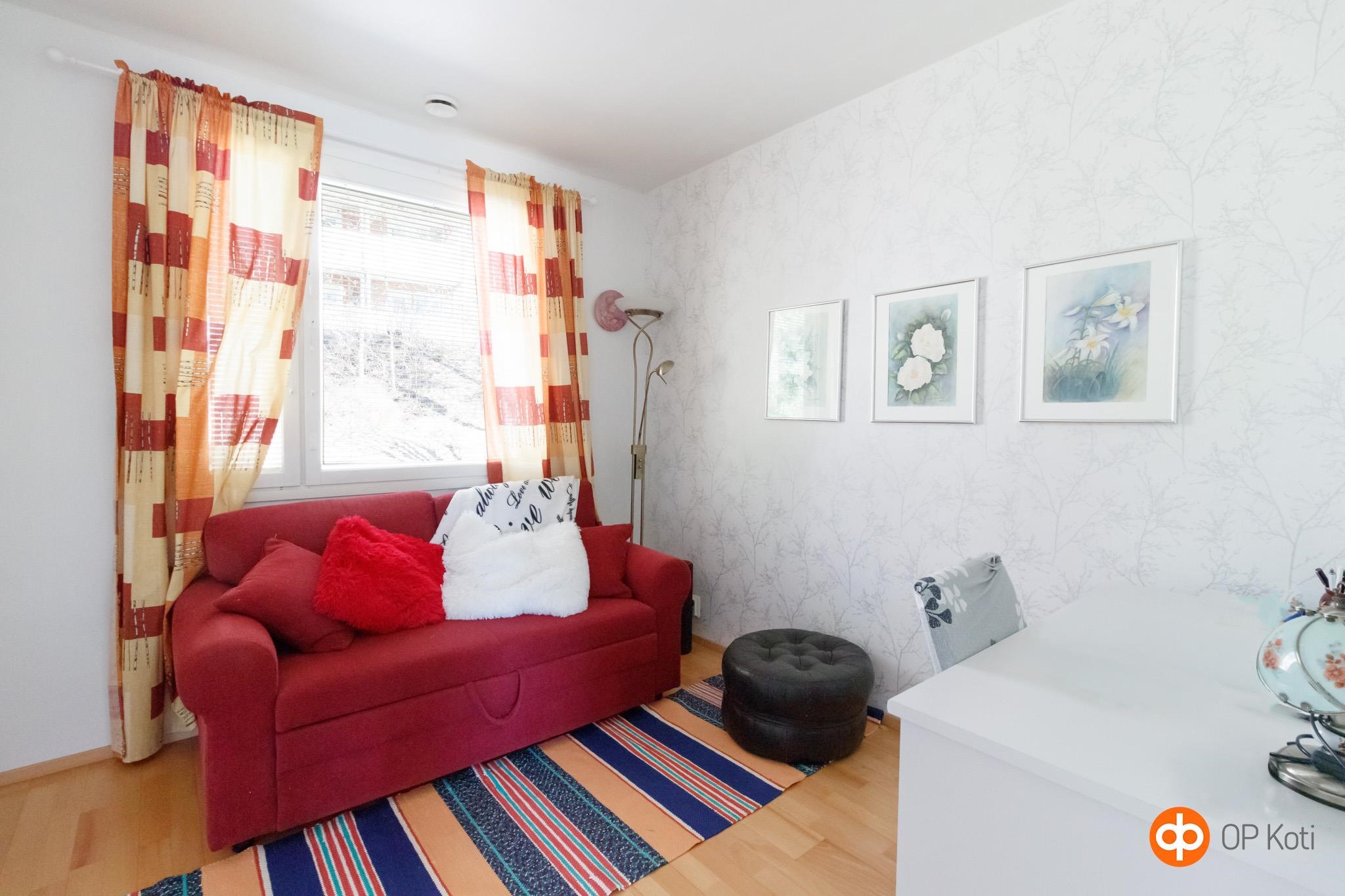 Keittiö: lattiassa laminaatti, seinät tapetti. Olohuone: lattiassa parketti, seinät tapetoidut. Makuuhuone 1: lattiassa parketti, seinät tapetoidut. Komeroita. Makuuhuone 2: lattiassa laminaatti, seinät tapetoidut. Sauna: lattia laatoitettu, seinät paneloidut. Kylpyhuone: lattia ja seinät laatoitetut. WC-istuin. Eteinen: lattiassa parketti, seinät maalatut. Vaatehuone/työhuone: lattiassa laminaatti, seinät maalatut. Ovi ulos ja makuuhuoneeseen.