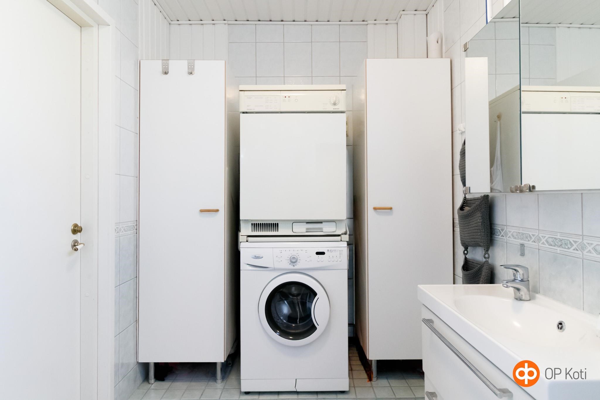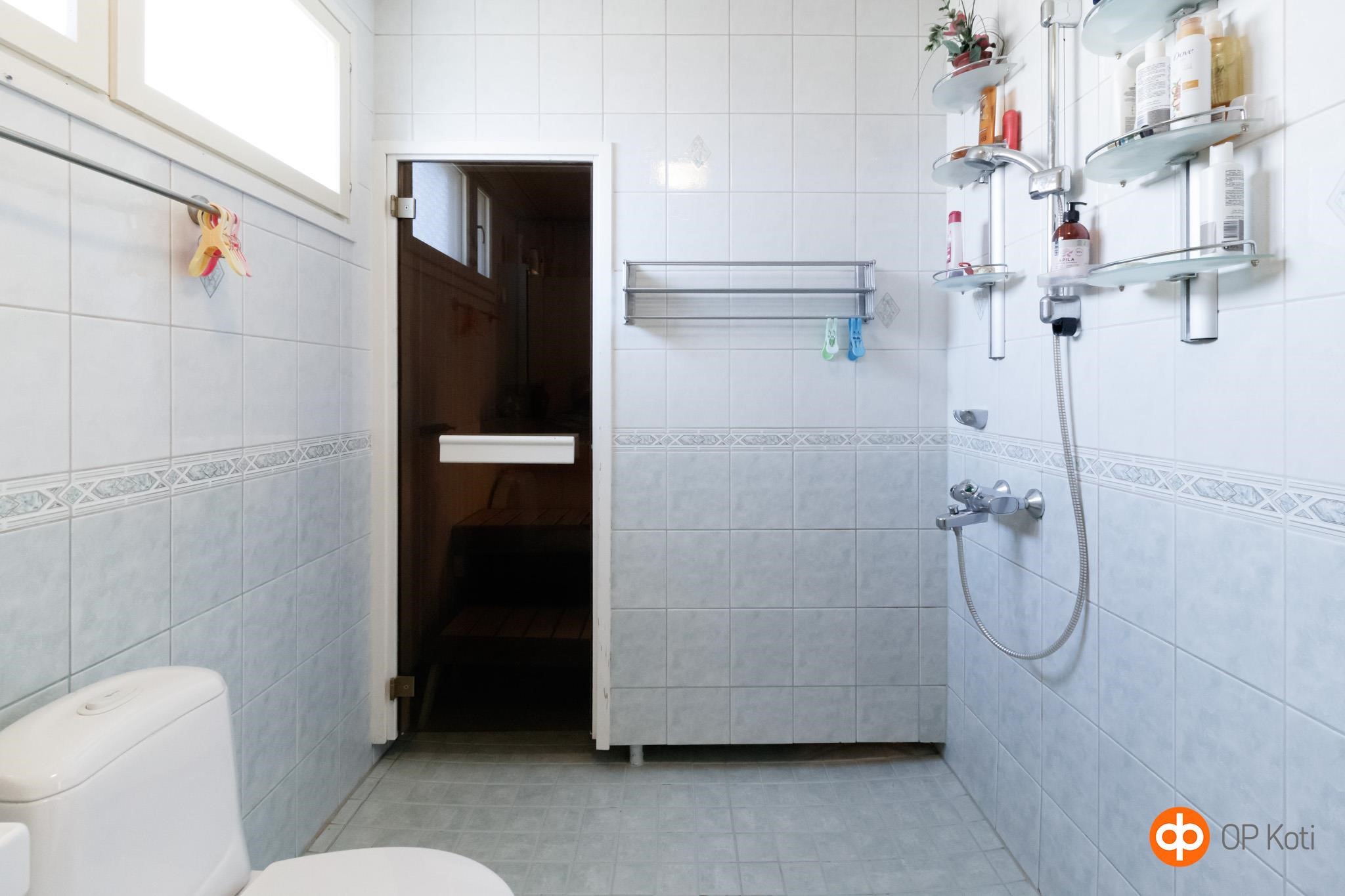 - Sauna, sähkökiuas, kylpyhuone, suihku, allaskaappi, pesukoneliitäntä, lattialämmitys pesutilat ja tuulikaappi, kiinteät valaisimet.