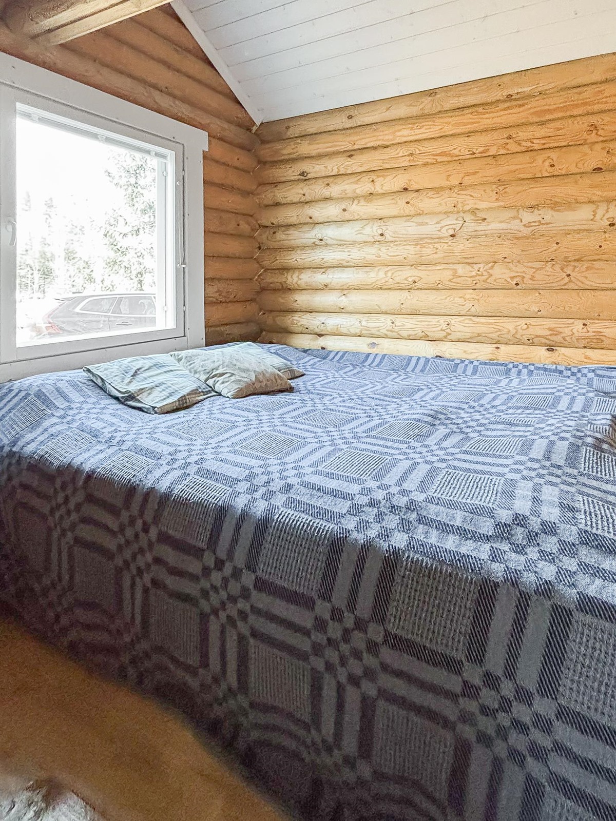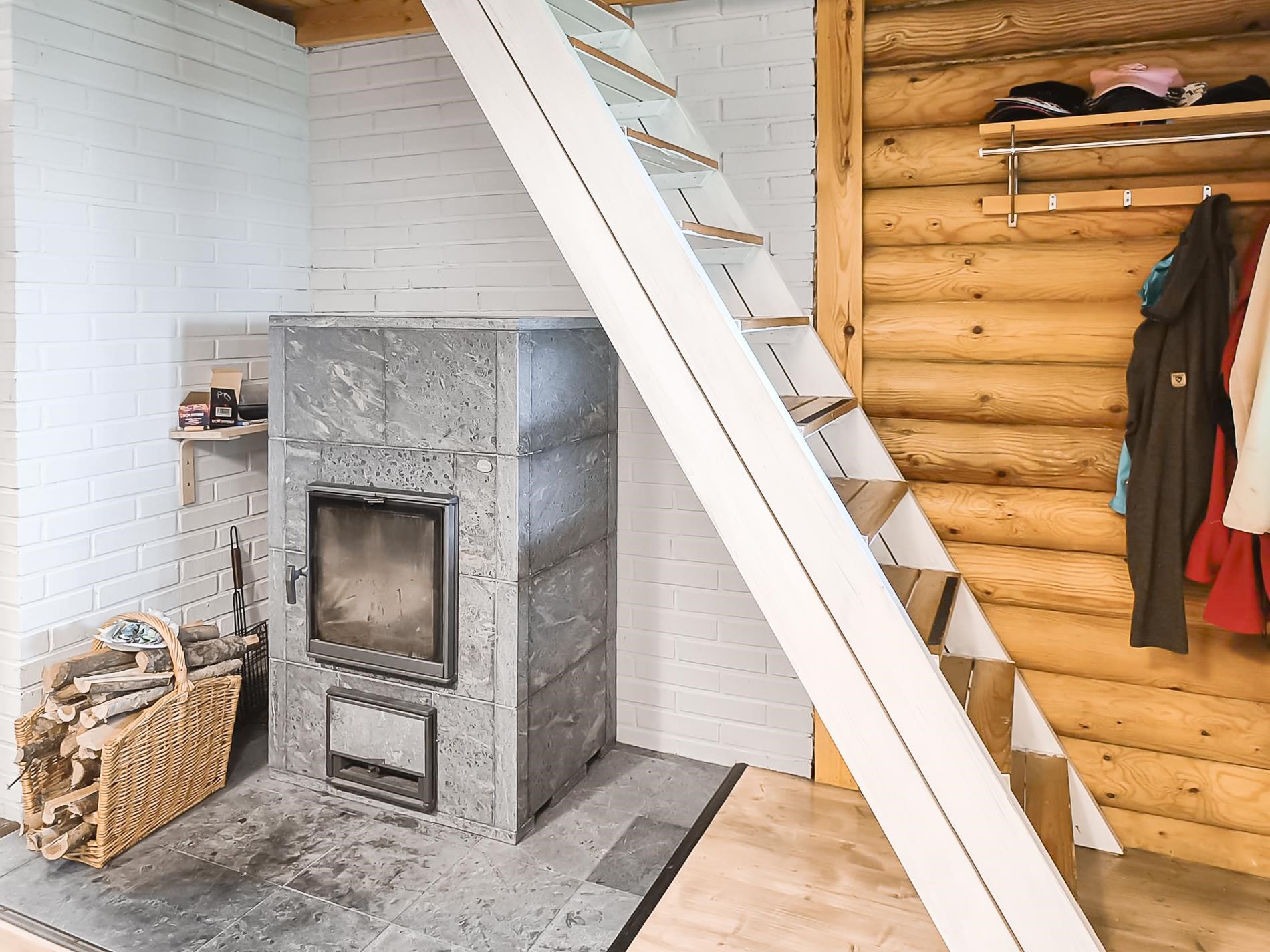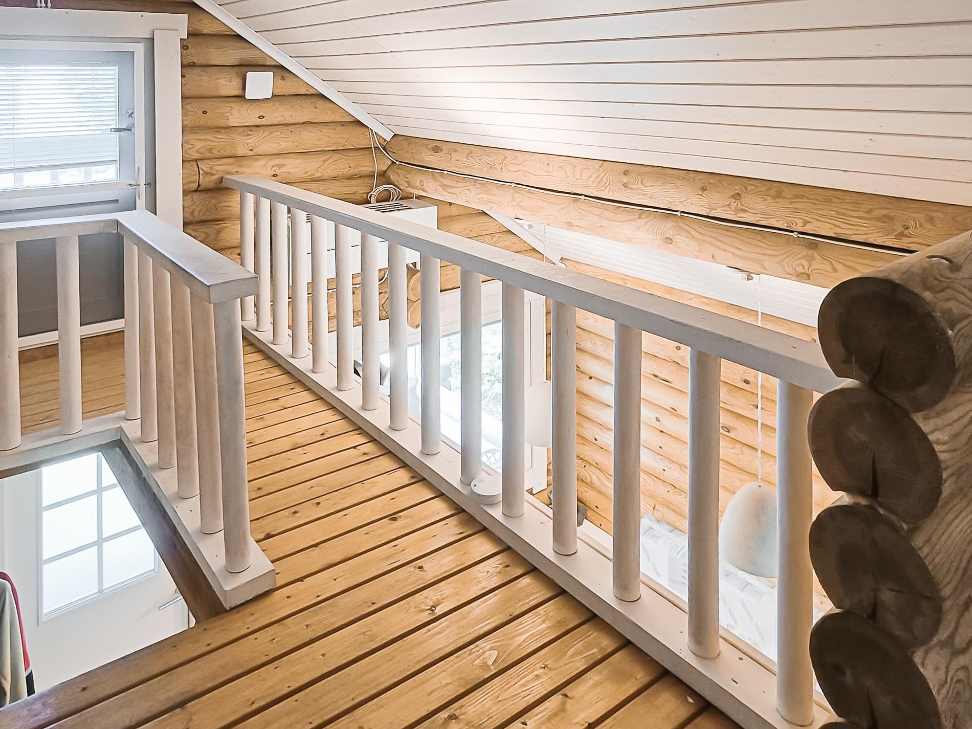 Keittiö: lautalattia / hirsi. Olohuone: parvella: lautalattia / hirsi. Sauna: laatta / paneeli.