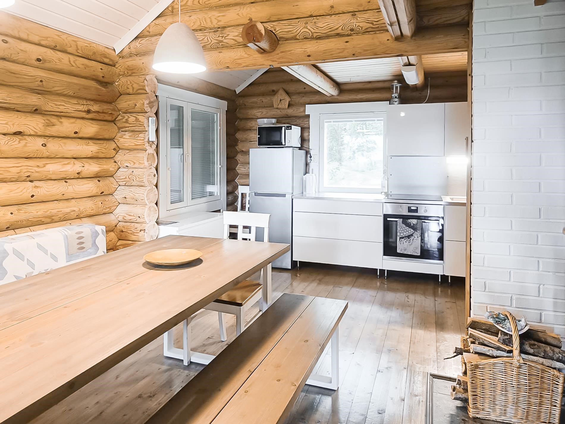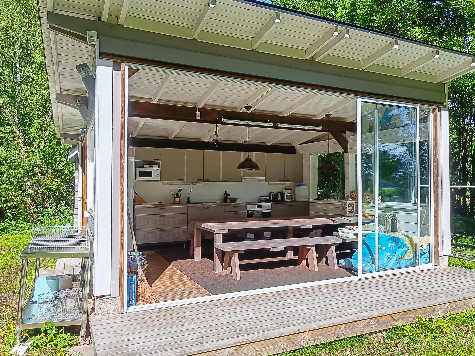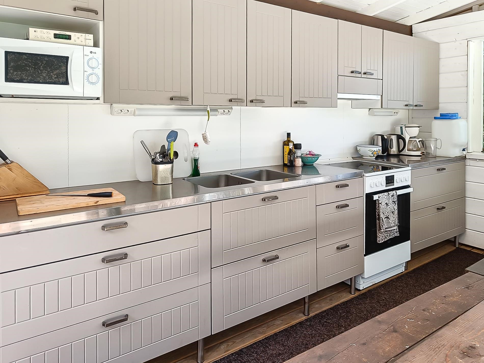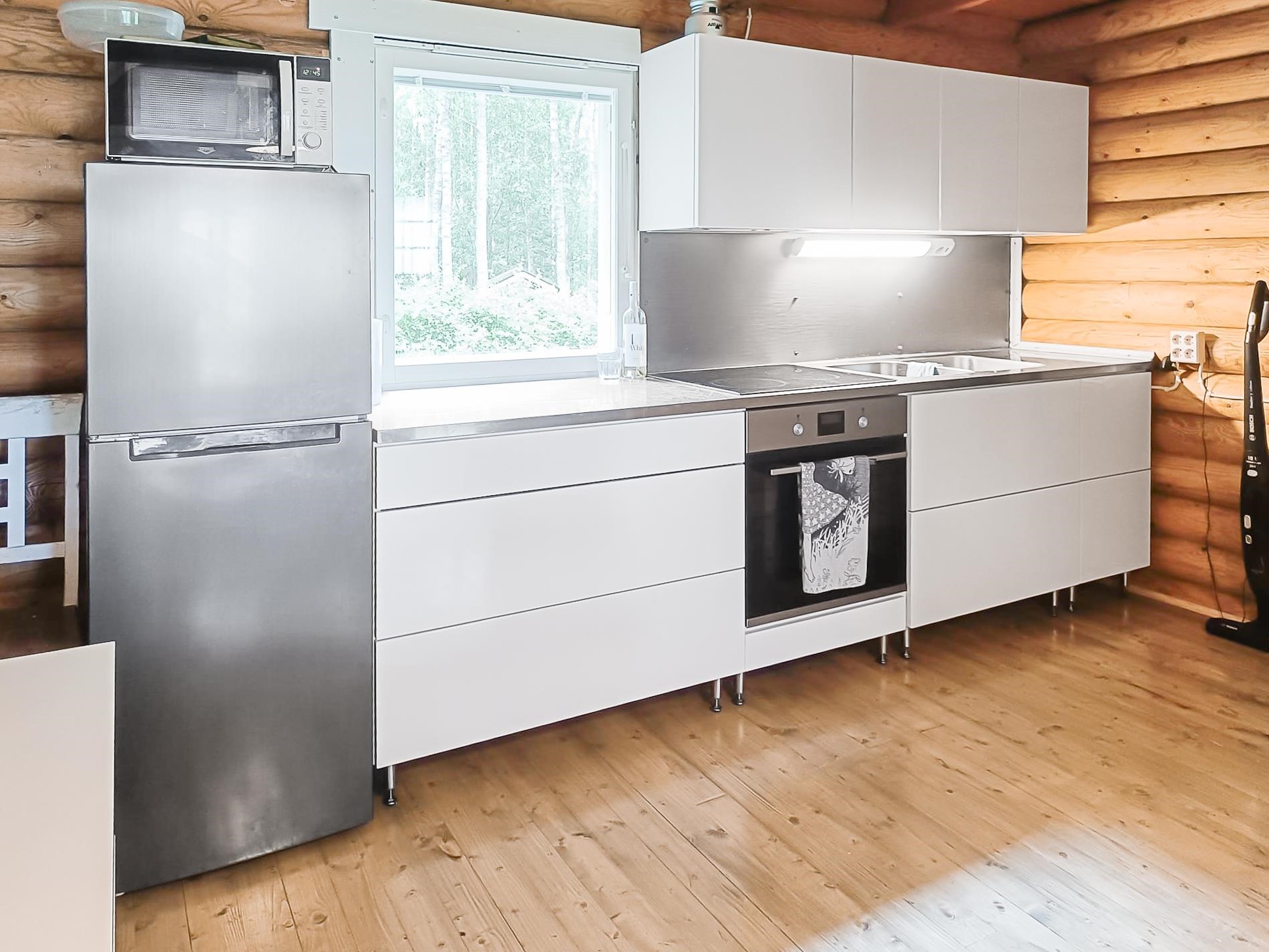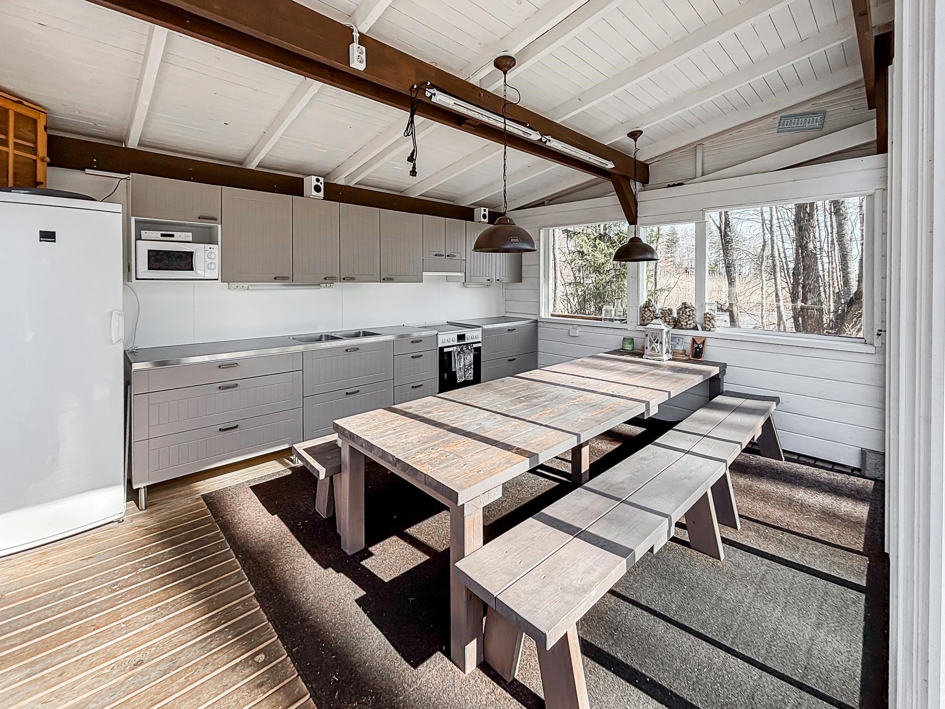 - Jääkaappi kesäkeittiössä, jenkkikaappi päämökissä, erillisuuni päämökissä, keraaminen liesi kesäkeittiössä ja päämökissä, liesituuletin kesäkeittiössä ja päämökissä, kaapistot.