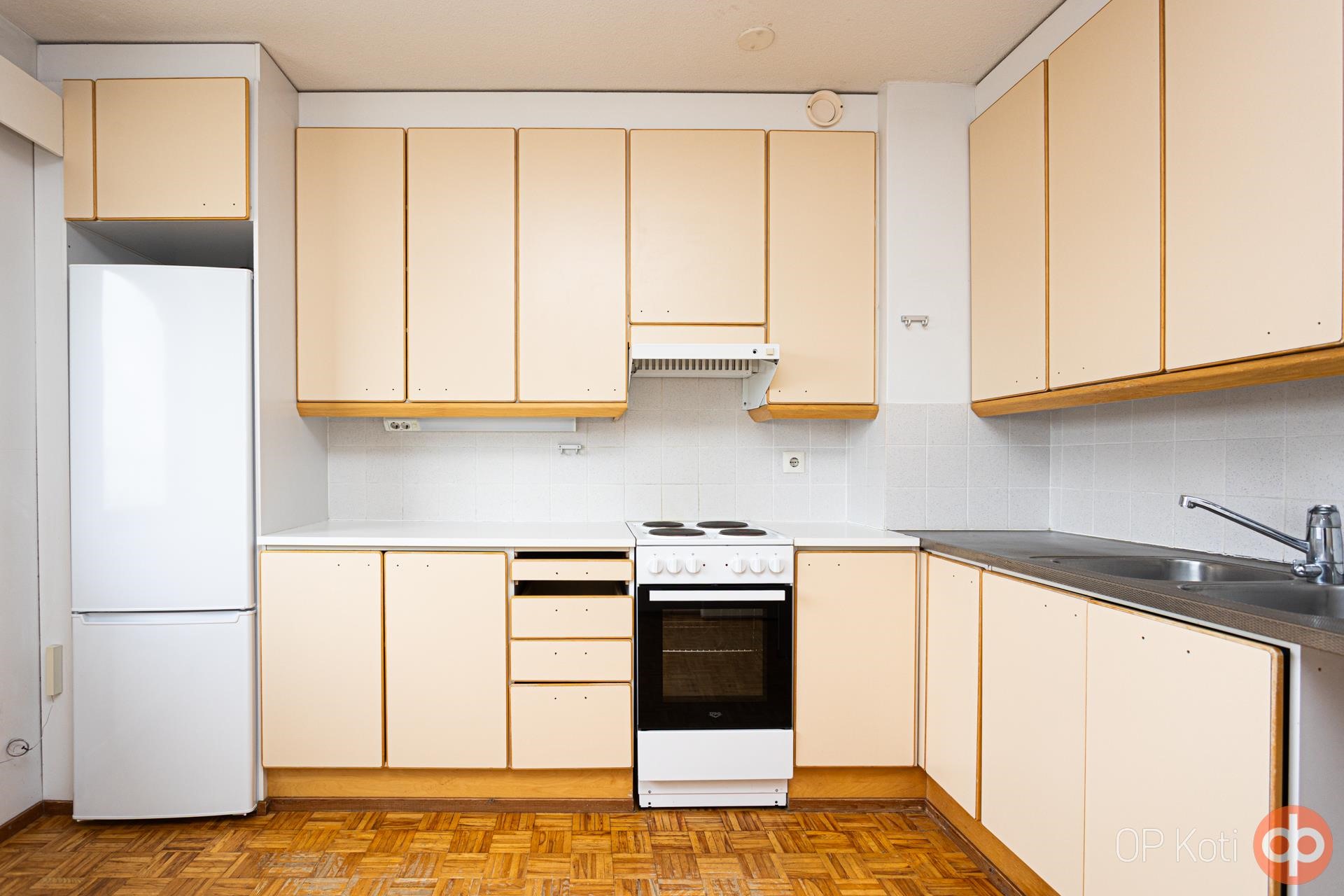 - Jääkaappi, lattialiesi, liesituuletin, kaapistot, kiinteät valaisimet.