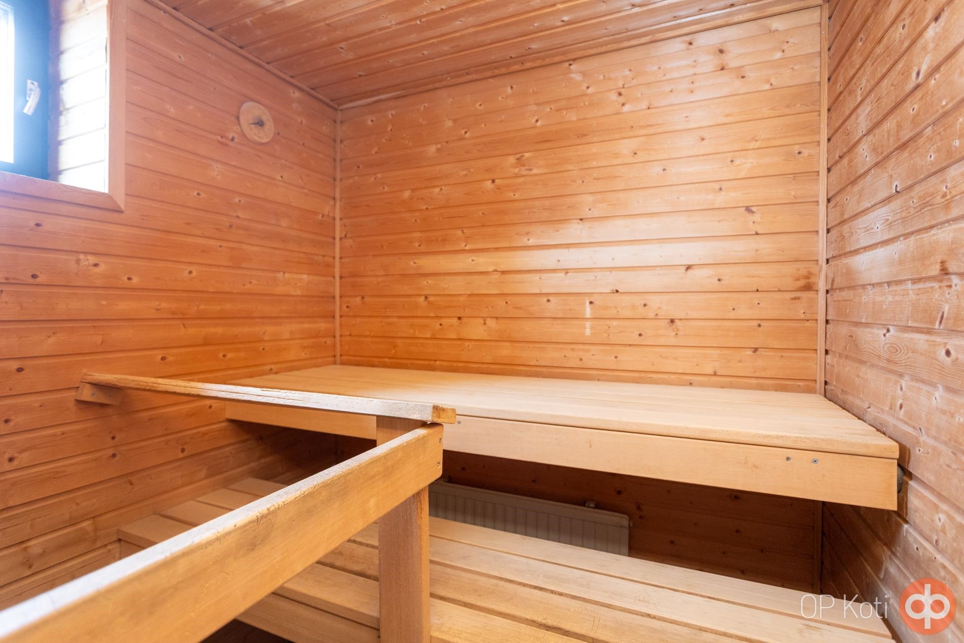 - Sauna, sähkökiuas, suihku, peilit, pesukoneliitäntä, kiinteät valaisimet.