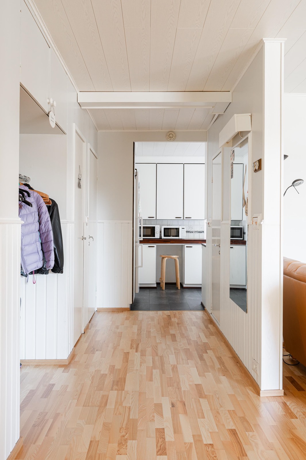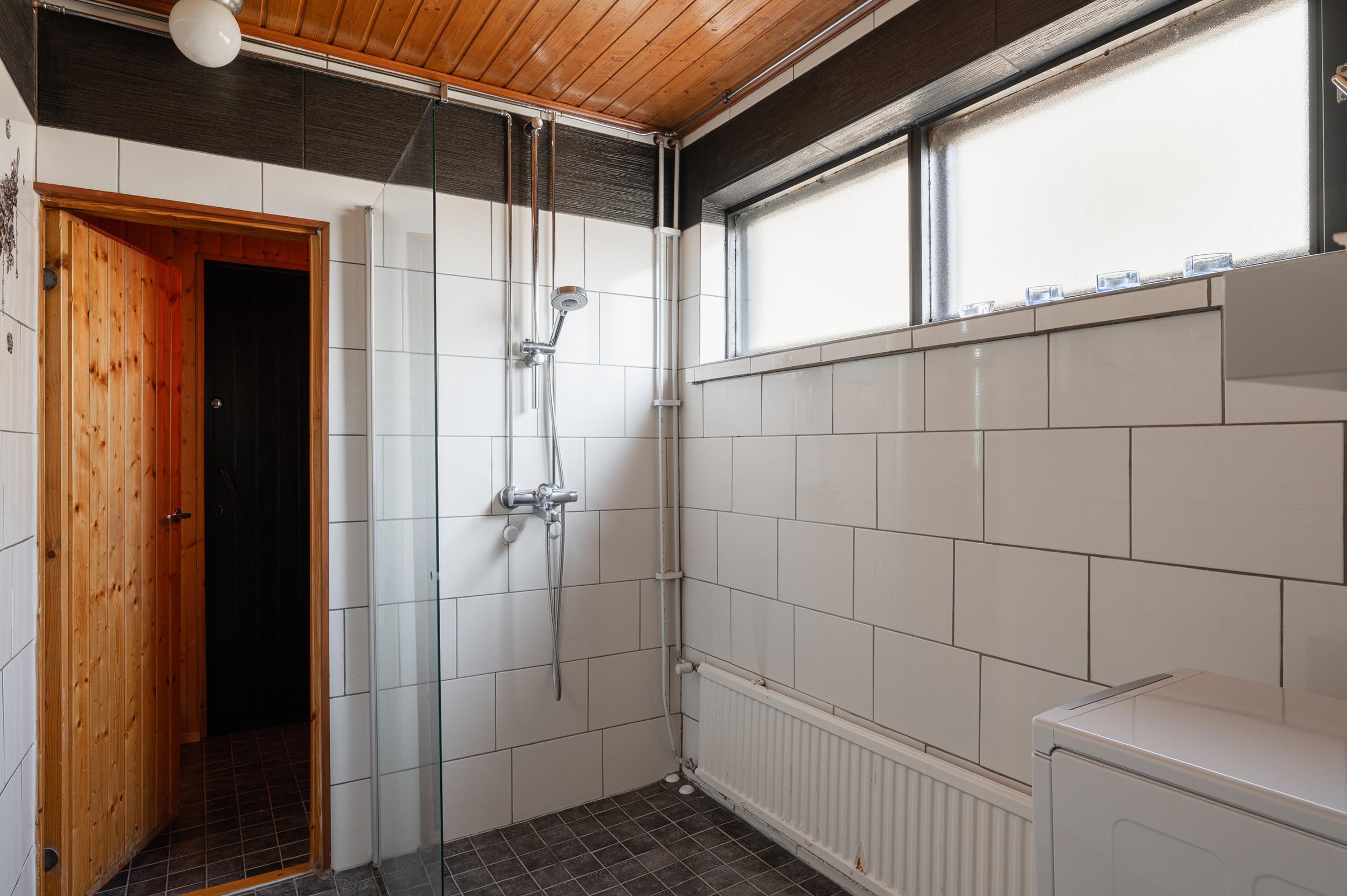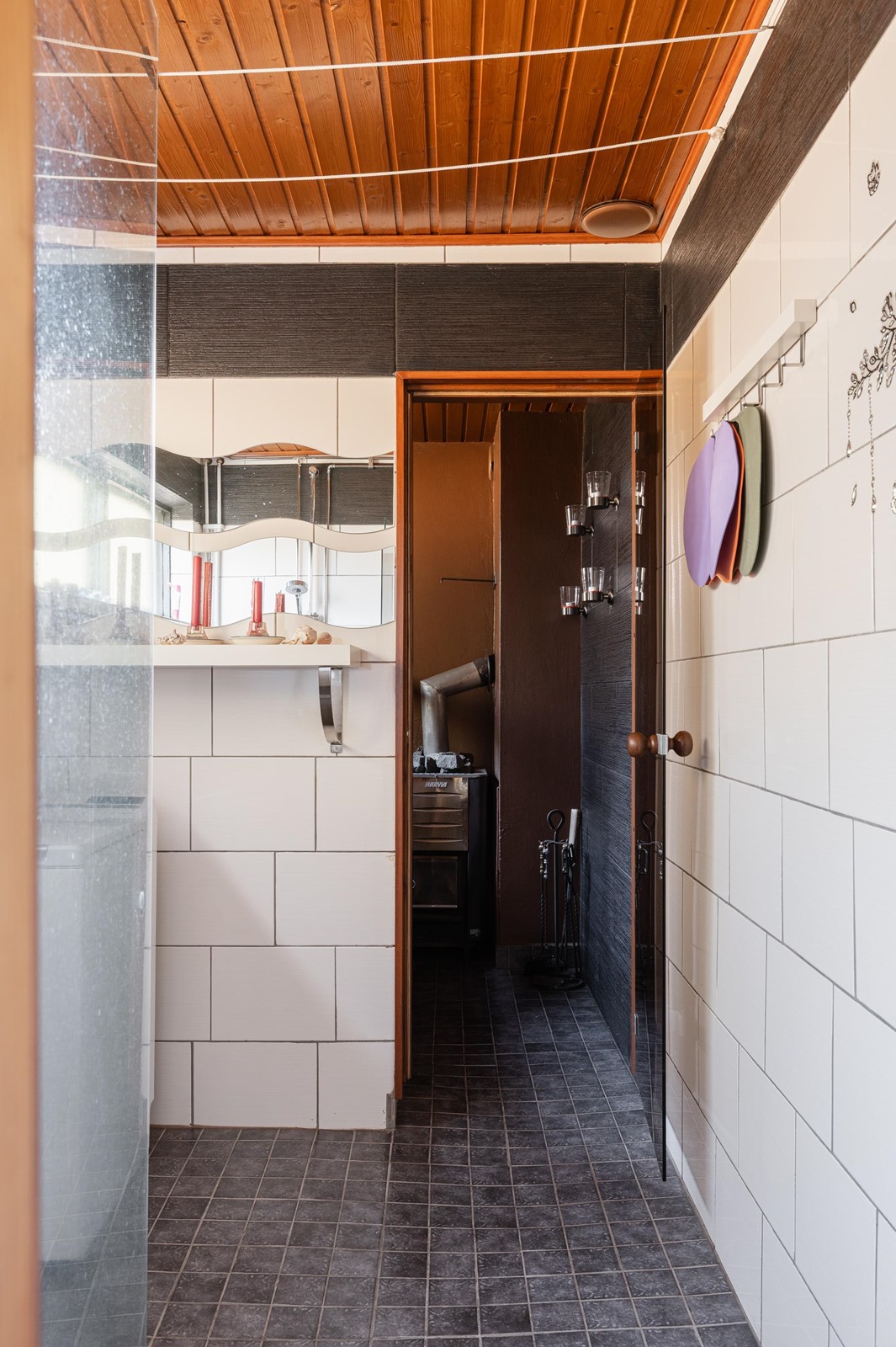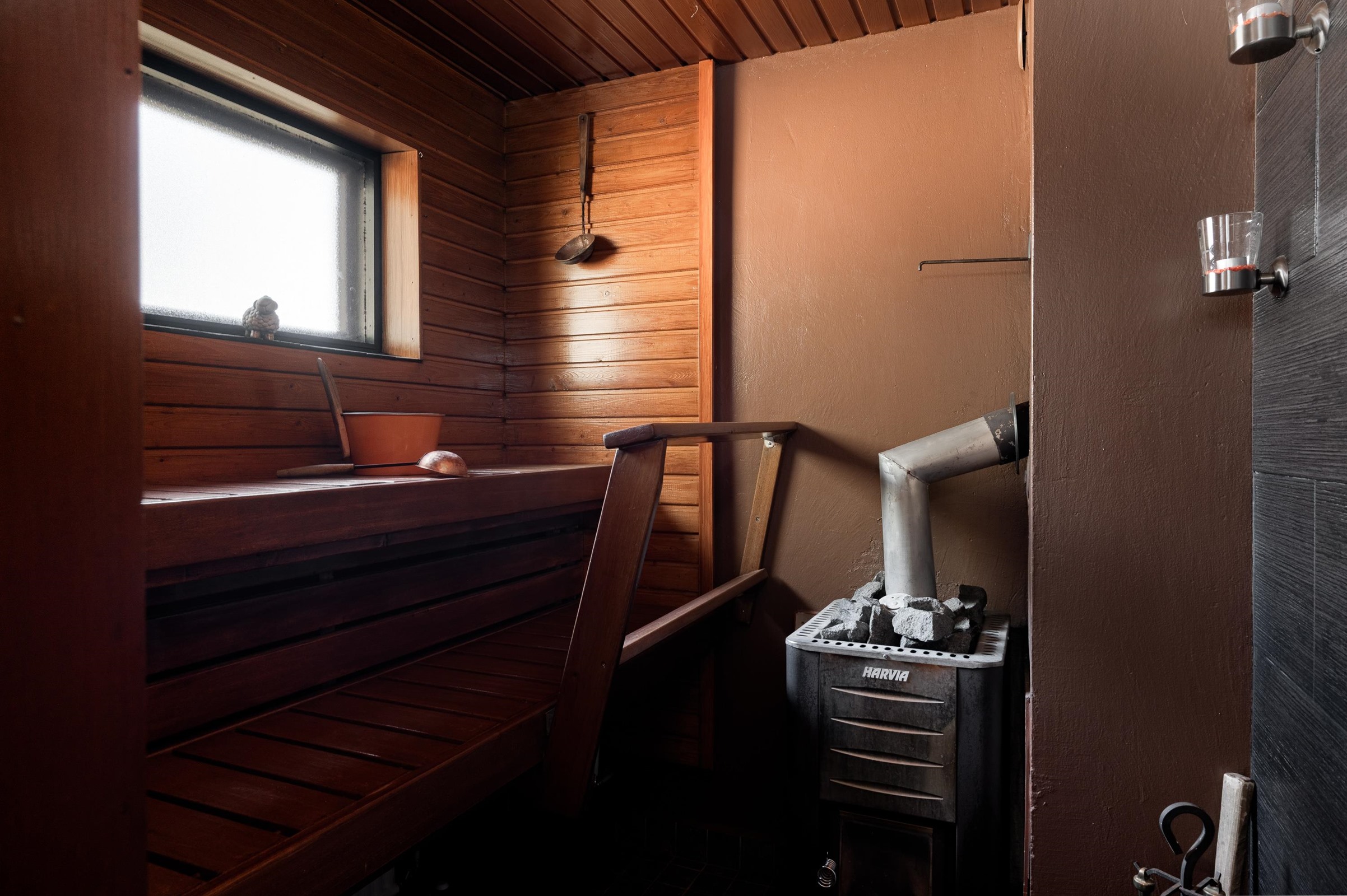 - Sauna, puukiuas, kylpyhuone suihku, suihkuseinä, erillinen wc peili, lavuaari, pesukoneliitäntä, kiinteät valaisimet.