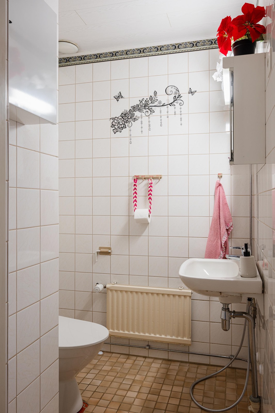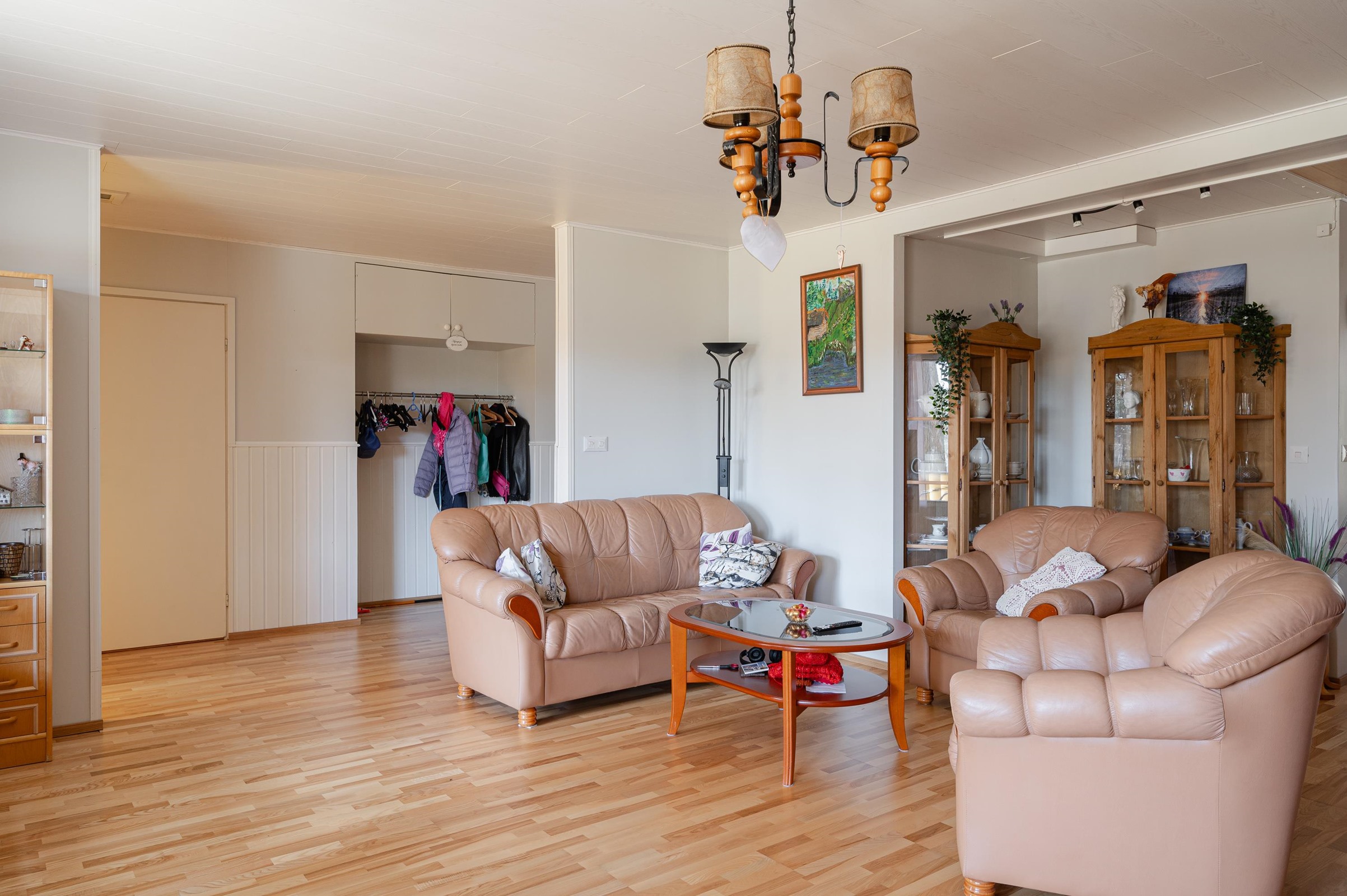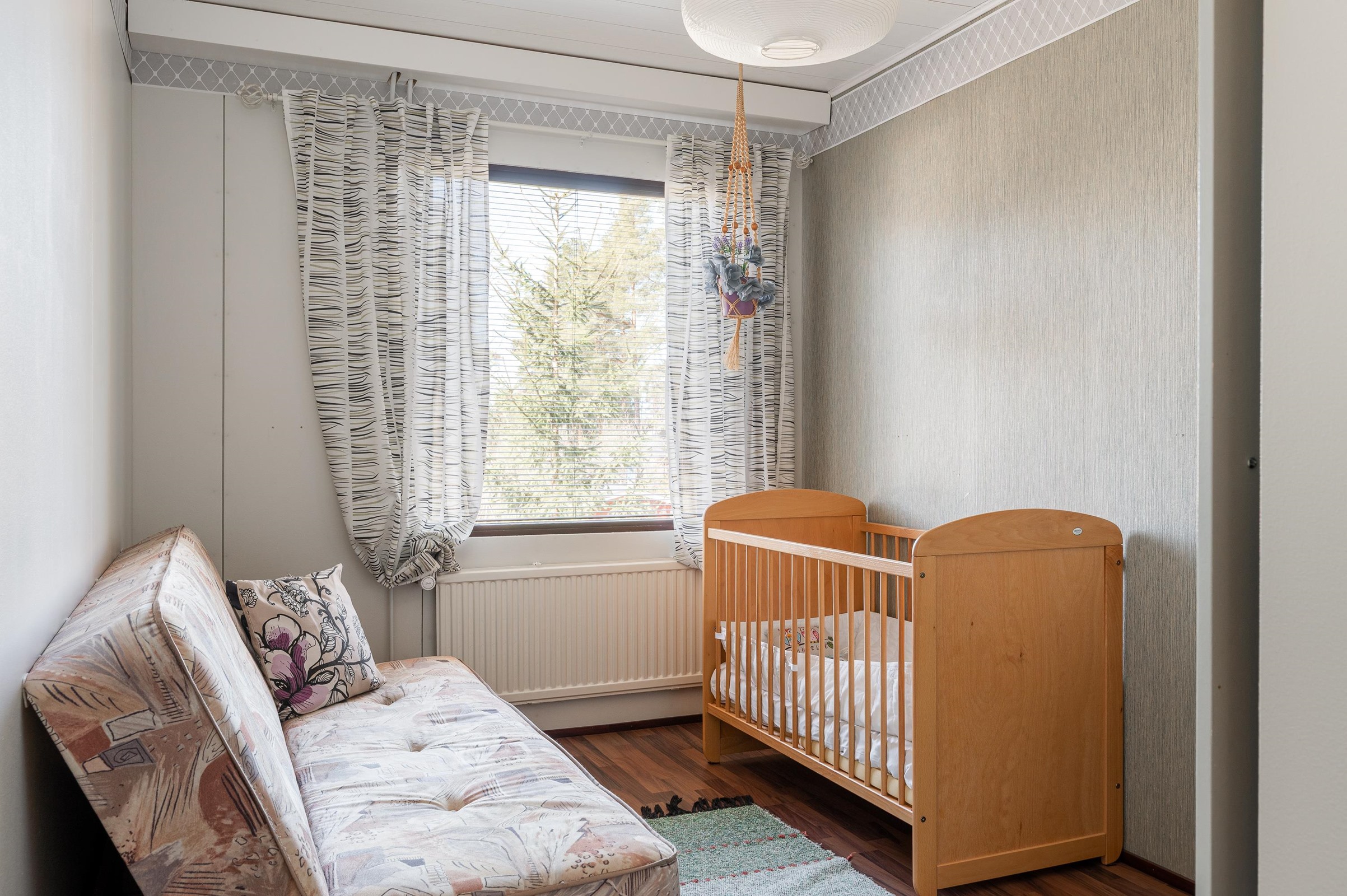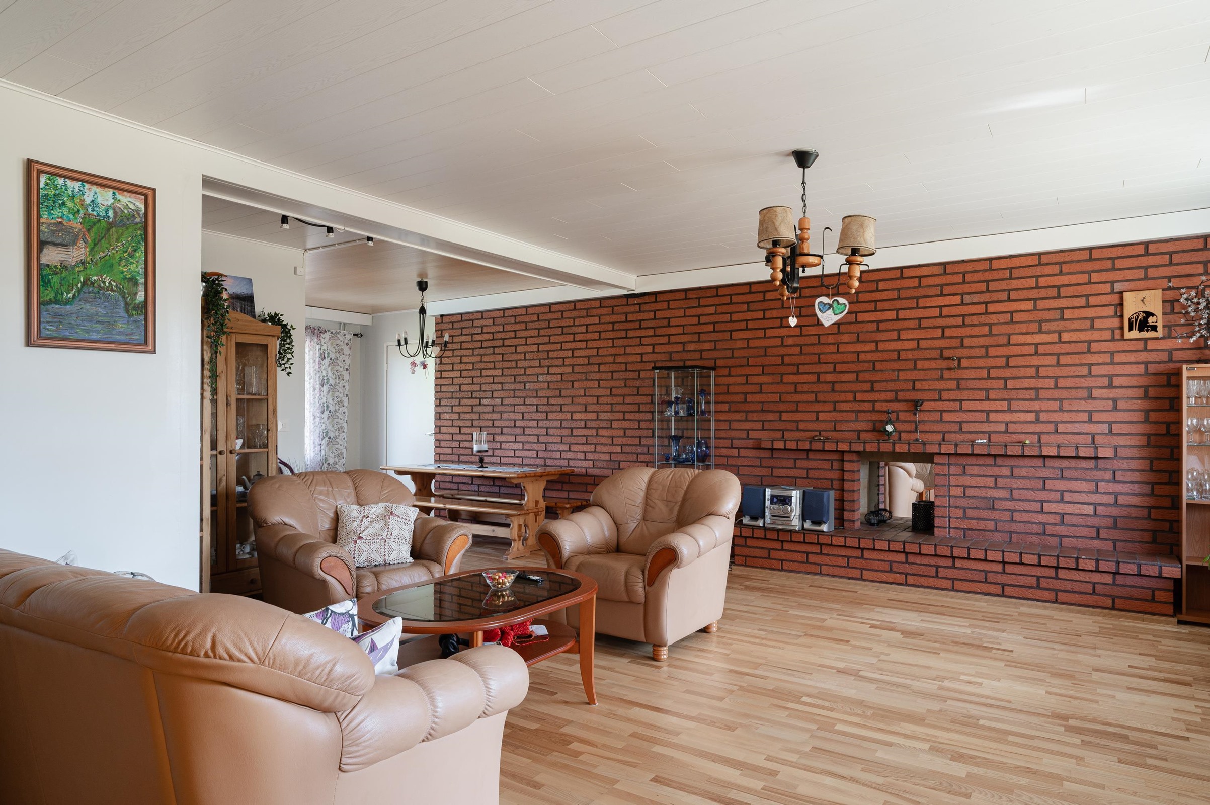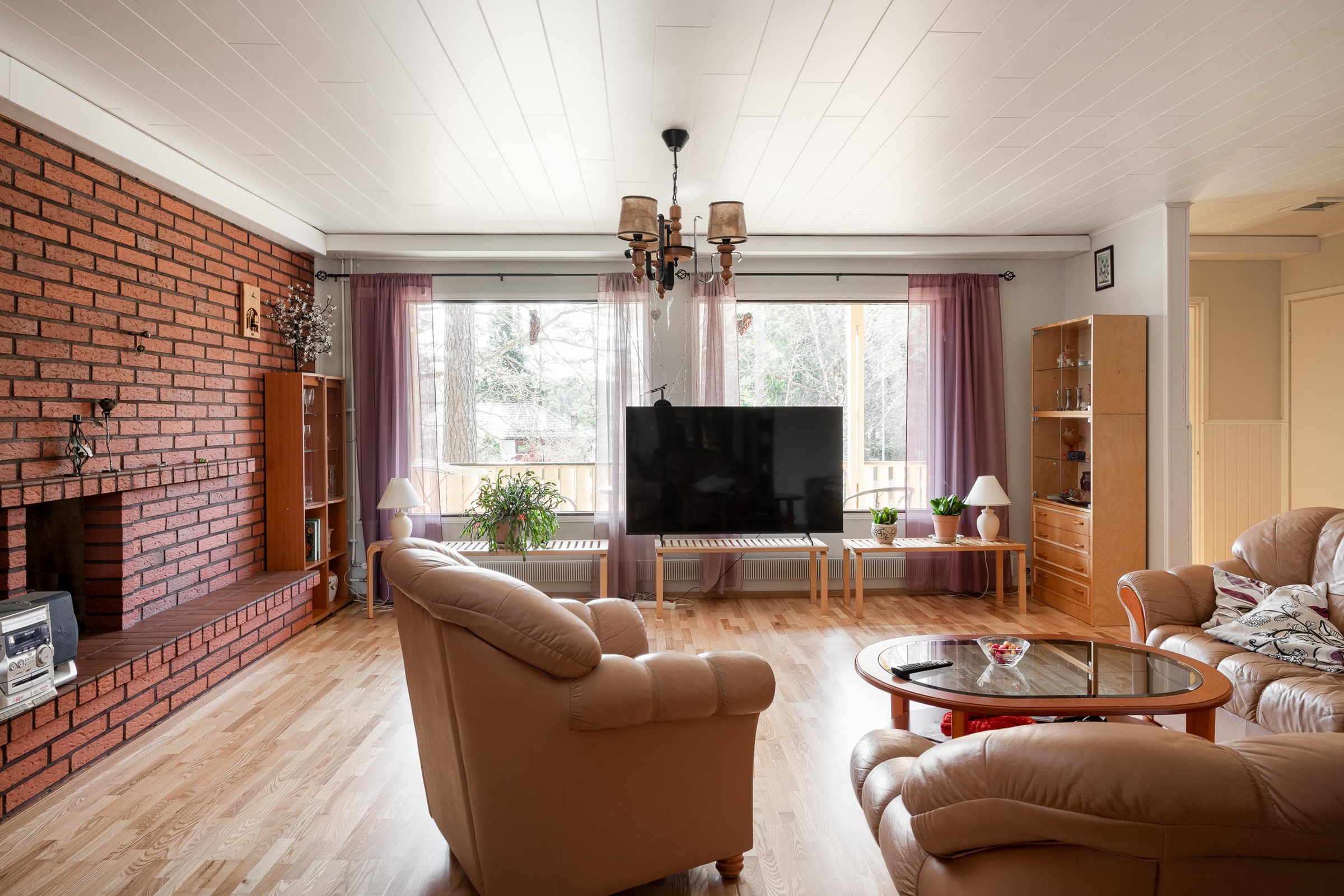 Keittiö: Lattia laminaattia, seinät maalattu, välitila laatoitettu. Olohuone: Lattia parketti, seinät maalattu / tiilimuuria. Makuuhuone 1: Lattia laminaattia, seinät tapetoitu / maalattu. Makuuhuone 2: Lattia laminaattia, seinät tapetoitu. Makuuhuone 3: Lattia muovimattoa, seinät tapetoitu. Sauna: Lattia laatoitettu, seinät puupaneelia. Kylpyhuone: Lattia ja seinät laatoitettu. Wc: Lattia ja seinät laatoitettu.