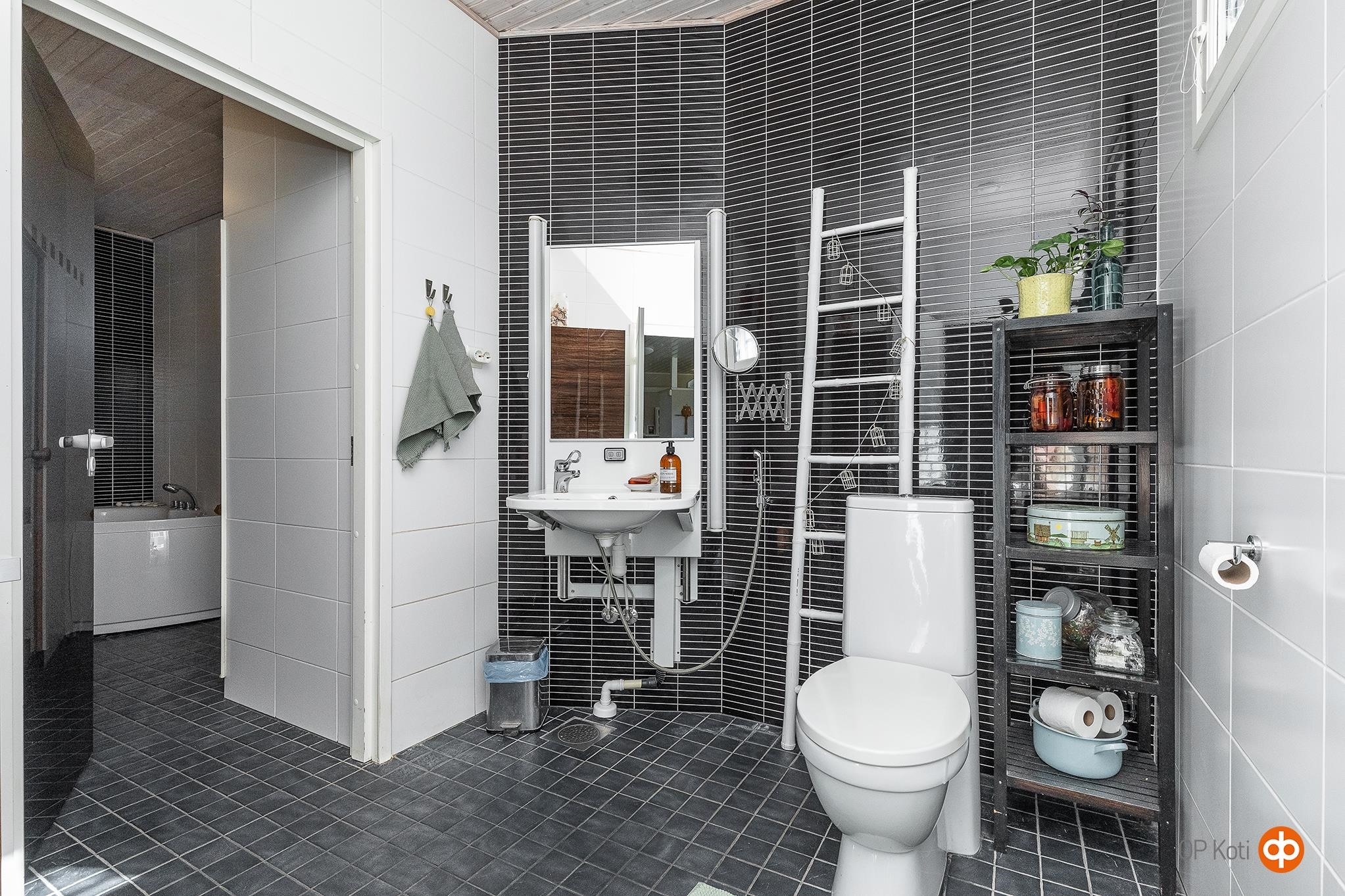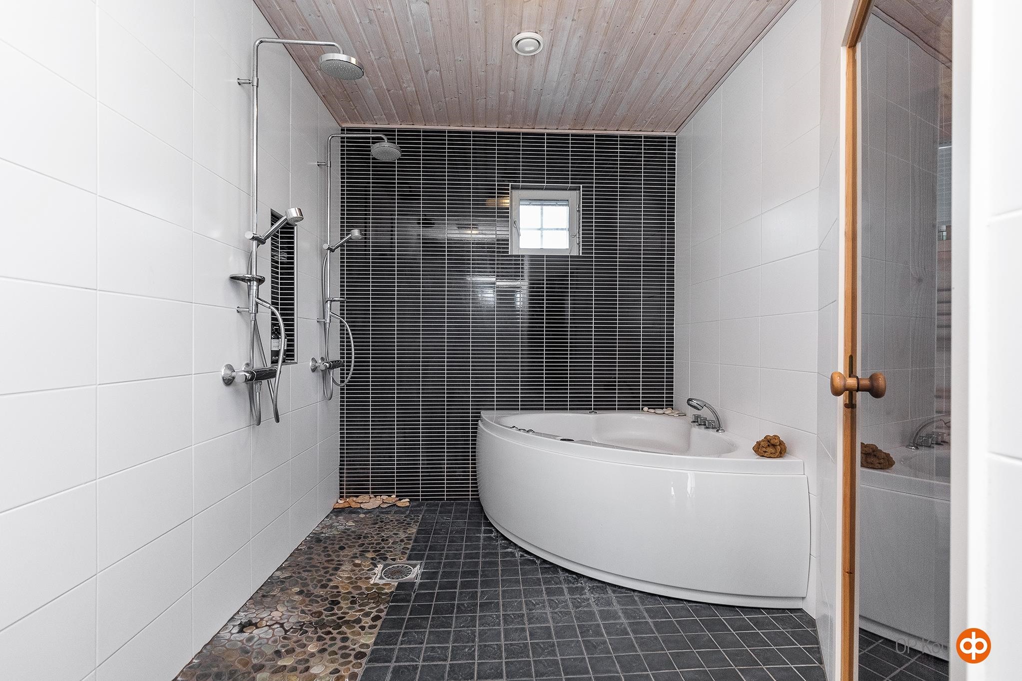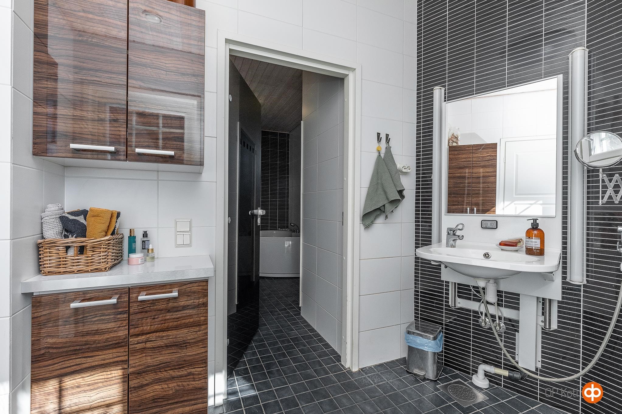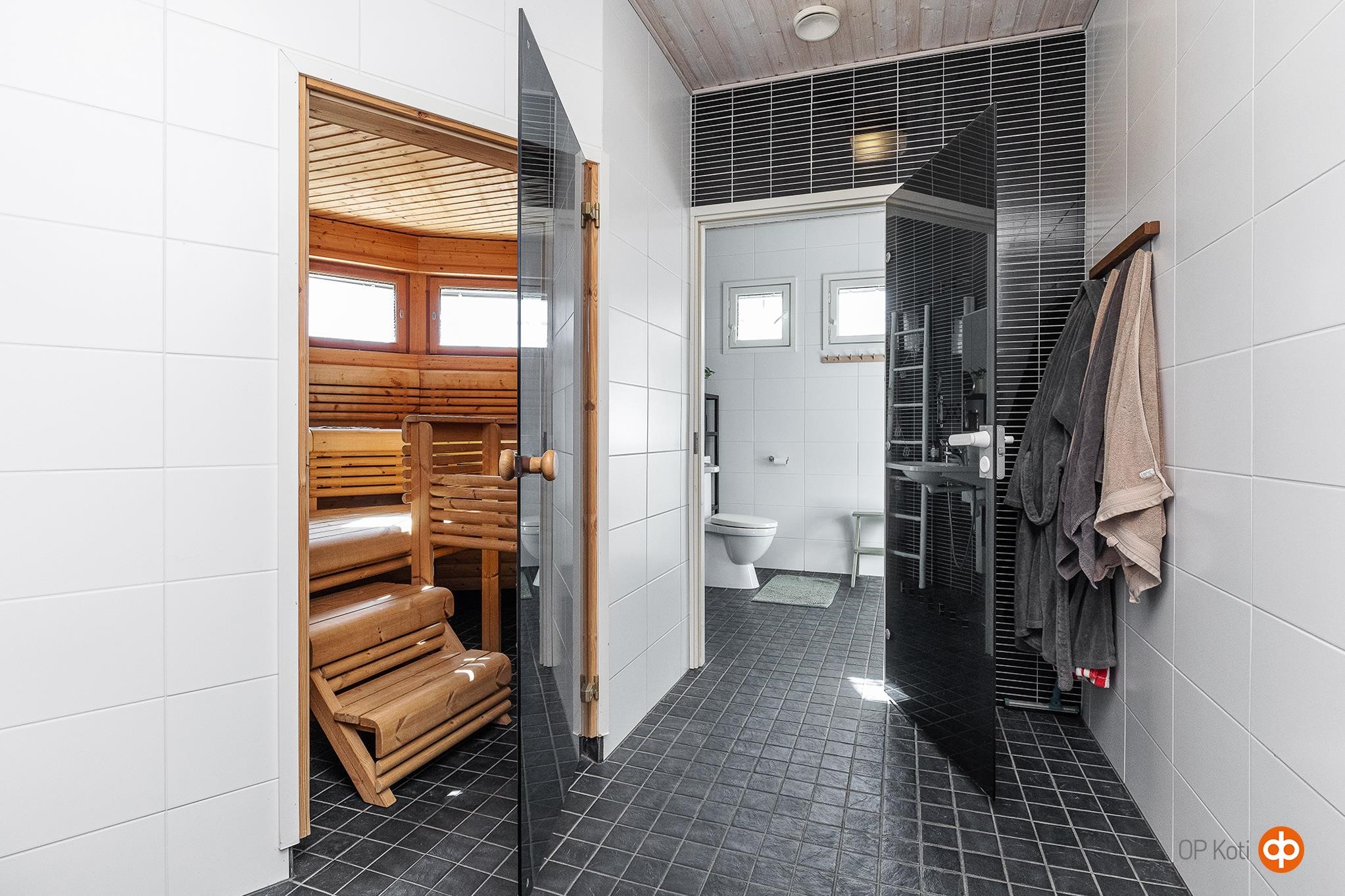 - Sauna, sähkökiuas, kylpyhuone, erillinen wc 2 kpl, suihku 2 kpl, poreallas, peilit, kaapit kodinhoitohuone, allaskaappi kodinhoitohuone, pesukoneliitäntä kodinhoitohuone, lattialämmitys kaikissa pesutiloissa, kiinteät valaisimet, käsienpesuallas kodinhoitohuoneessa. Hieno kylpyhuone kokonaisuus, jossa todella suuri sauna tornikiukaalla, tilava pesuhuone porealtaalla ja kahdella suihkulla sekä erillinen wc. Pesutiloista käynti ulos takapihan vilvoitteluterassille. Toinen erillinen wc eteistilan yhteydessä. Mukavan lisän antaa tontin takareunaan rakennettu pihasauna. Kodinhoitohuone kaapistoineen ja vesipisteineen omana erillisenä tilana, poissa saunavieraiden katseilta. Aikuisten makuuhuoneesta käynti pukeutumishuoneen kautta kodinhoitohuoneeseen. Kodinhoitohuoneesta käynti ulos, autokatokseen.
