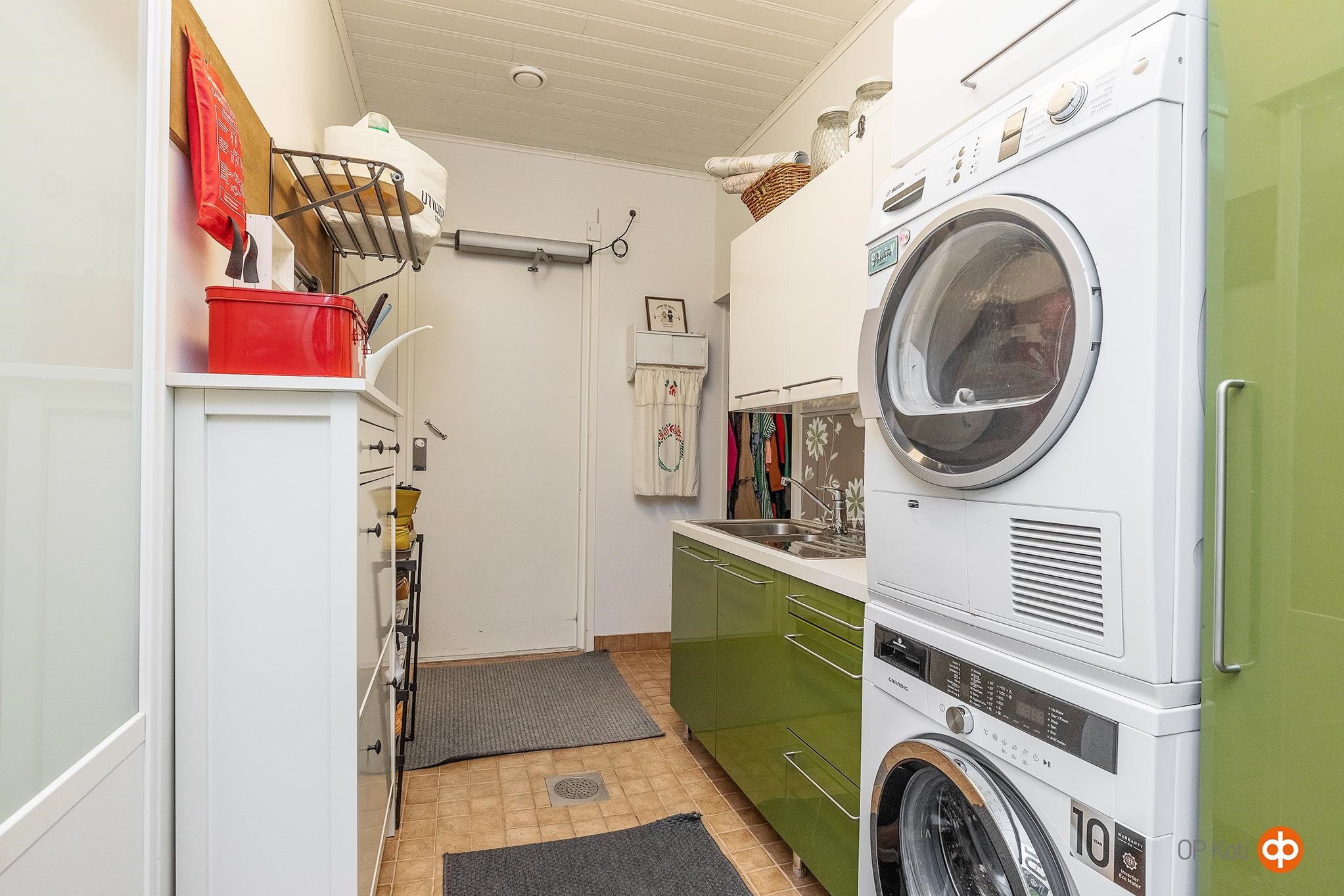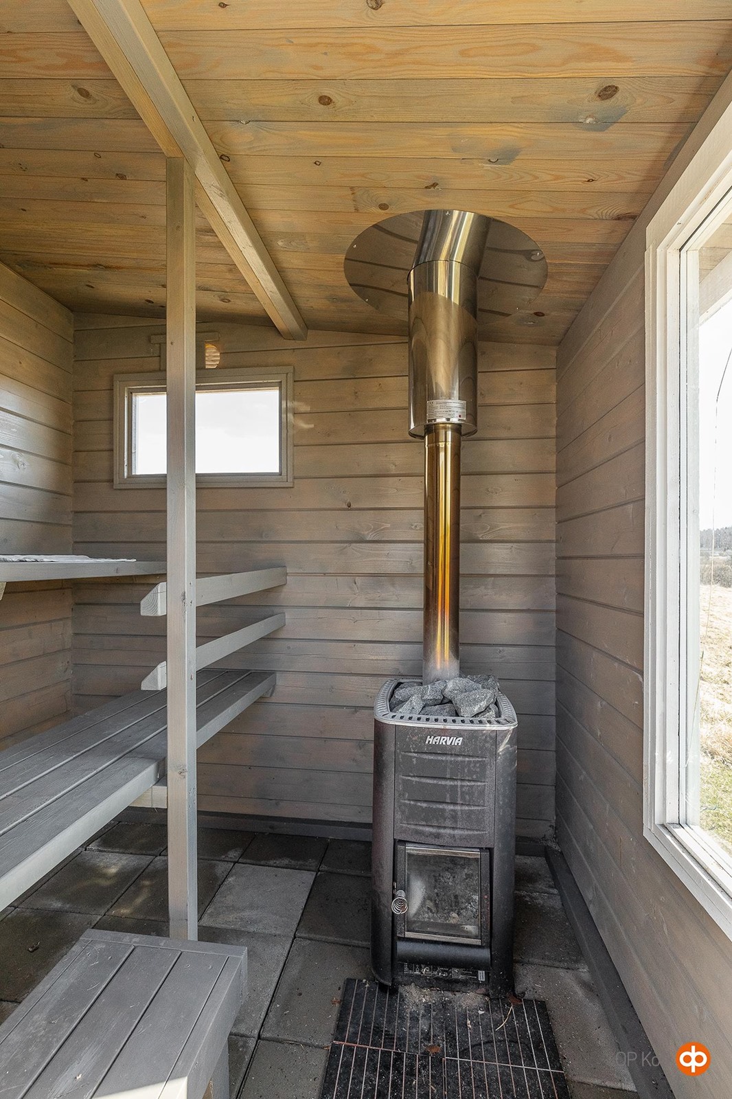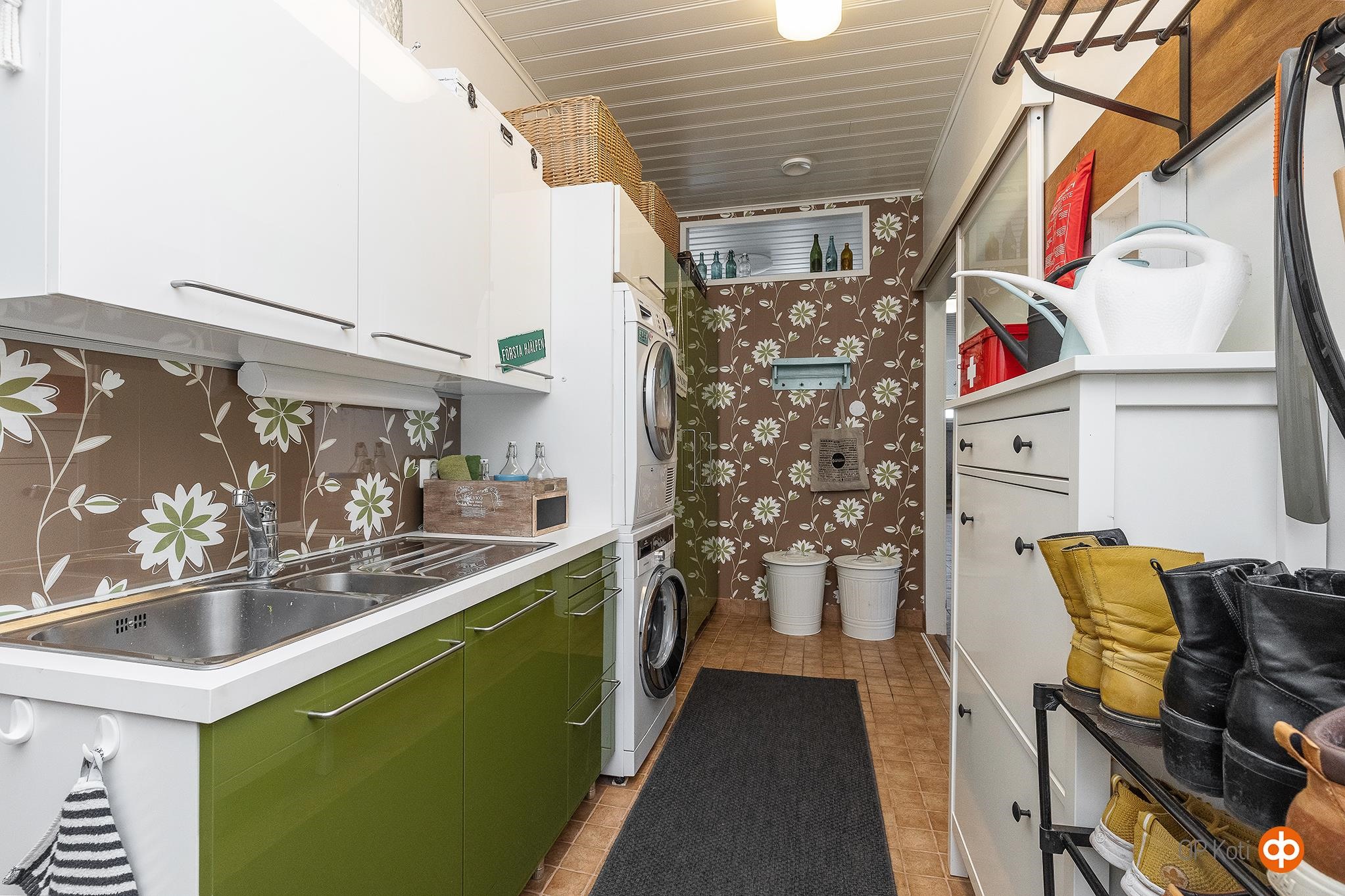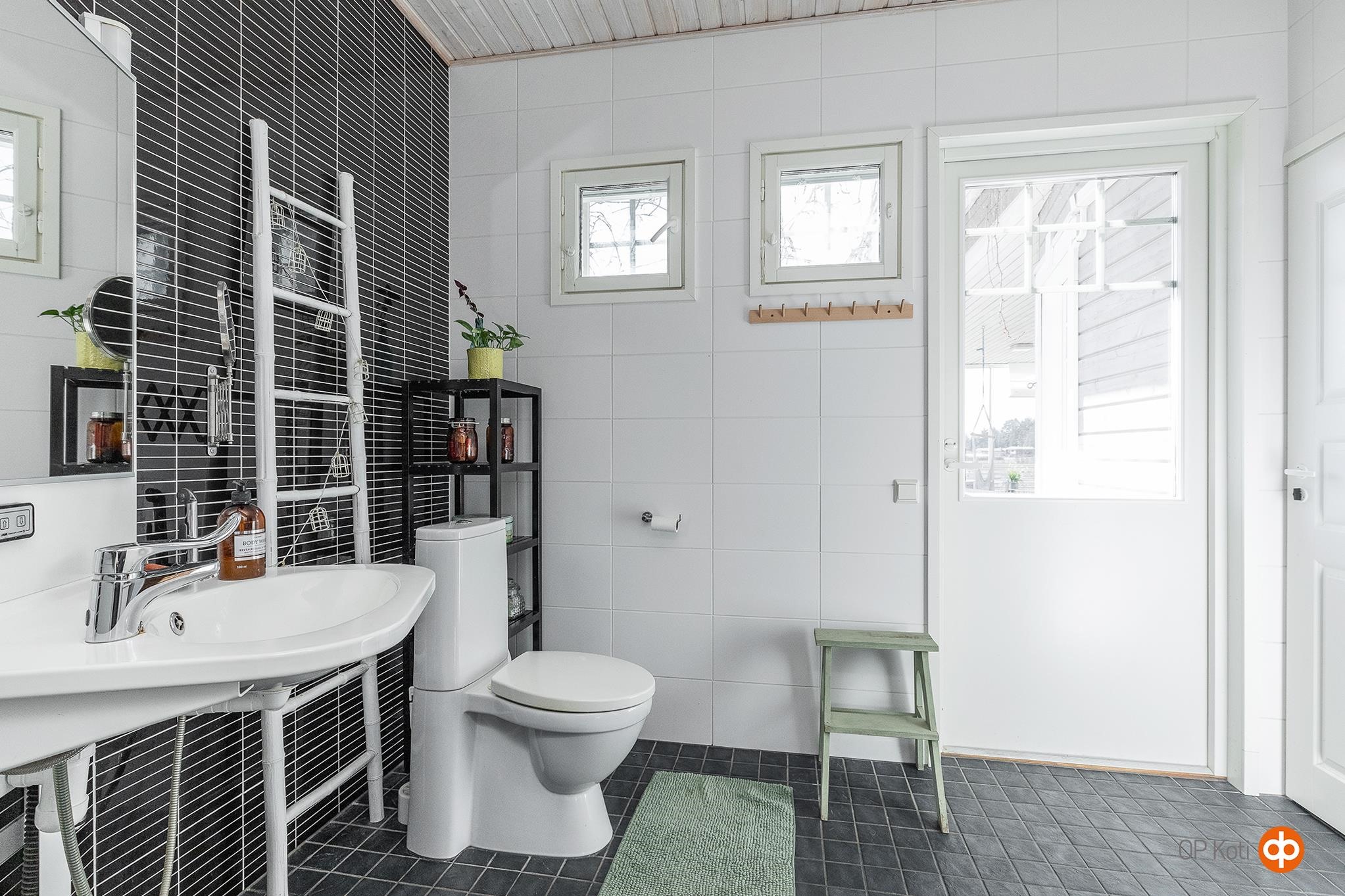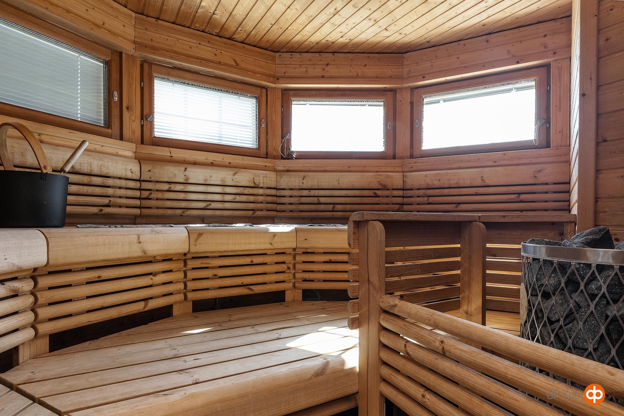- Sauna, sähkökiuas, kylpyhuone, erillinen wc 2 kpl, suihku 2 kpl, poreallas, peilit, kaapit kodinhoitohuone, allaskaappi kodinhoitohuone, pesukoneliitäntä kodinhoitohuone, lattialämmitys kaikissa pesutiloissa, kiinteät valaisimet, käsienpesuallas kodinhoitohuoneessa. Hieno kylpyhuone kokonaisuus, jossa todella suuri sauna tornikiukaalla, tilava pesuhuone porealtaalla ja kahdella suihkulla sekä erillinen wc. Pesutiloista käynti ulos takapihan vilvoitteluterassille. Toinen erillinen wc eteistilan yhteydessä. Mukavan lisän antaa tontin takareunaan rakennettu pihasauna. Kodinhoitohuone kaapistoineen ja vesipisteineen omana erillisenä tilana, poissa saunavieraiden katseilta. Aikuisten makuuhuoneesta käynti pukeutumishuoneen kautta kodinhoitohuoneeseen. Kodinhoitohuoneesta käynti ulos, autokatokseen.