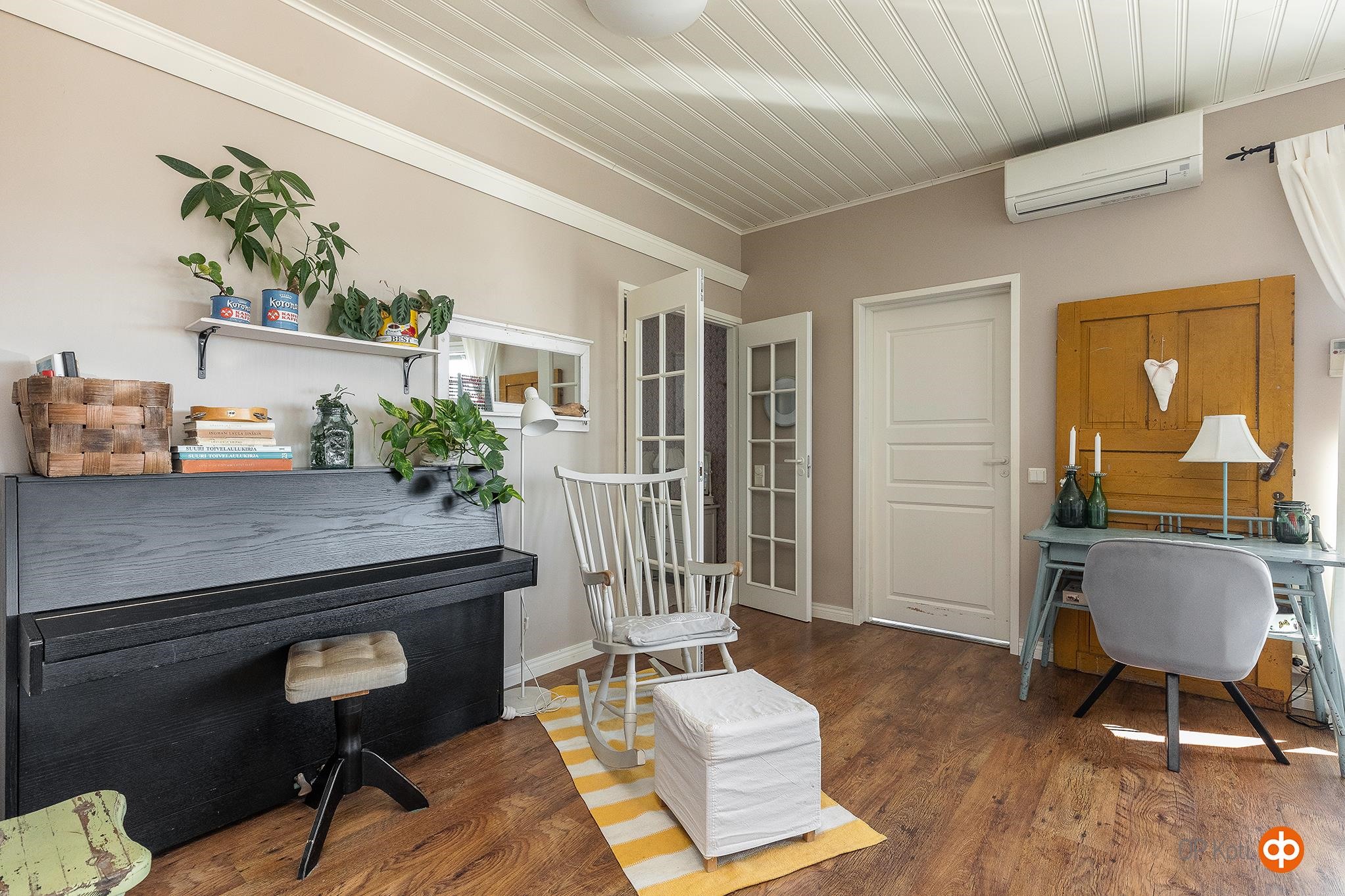 - Maalämpö. Olohuoneessa varaava takka ja viilentävä ilmalämpöpumppu. Ilmalämpöpumppu 2012, huollettu ja puhdistettu säännöllisesti. Takka nuohottu vuosittain, viimeksi 16.4.2026. Maalämpö toteutettu vaakakeruuputkistolla rakennuksen takapihalle, noin 1 metrin syvyyteen.