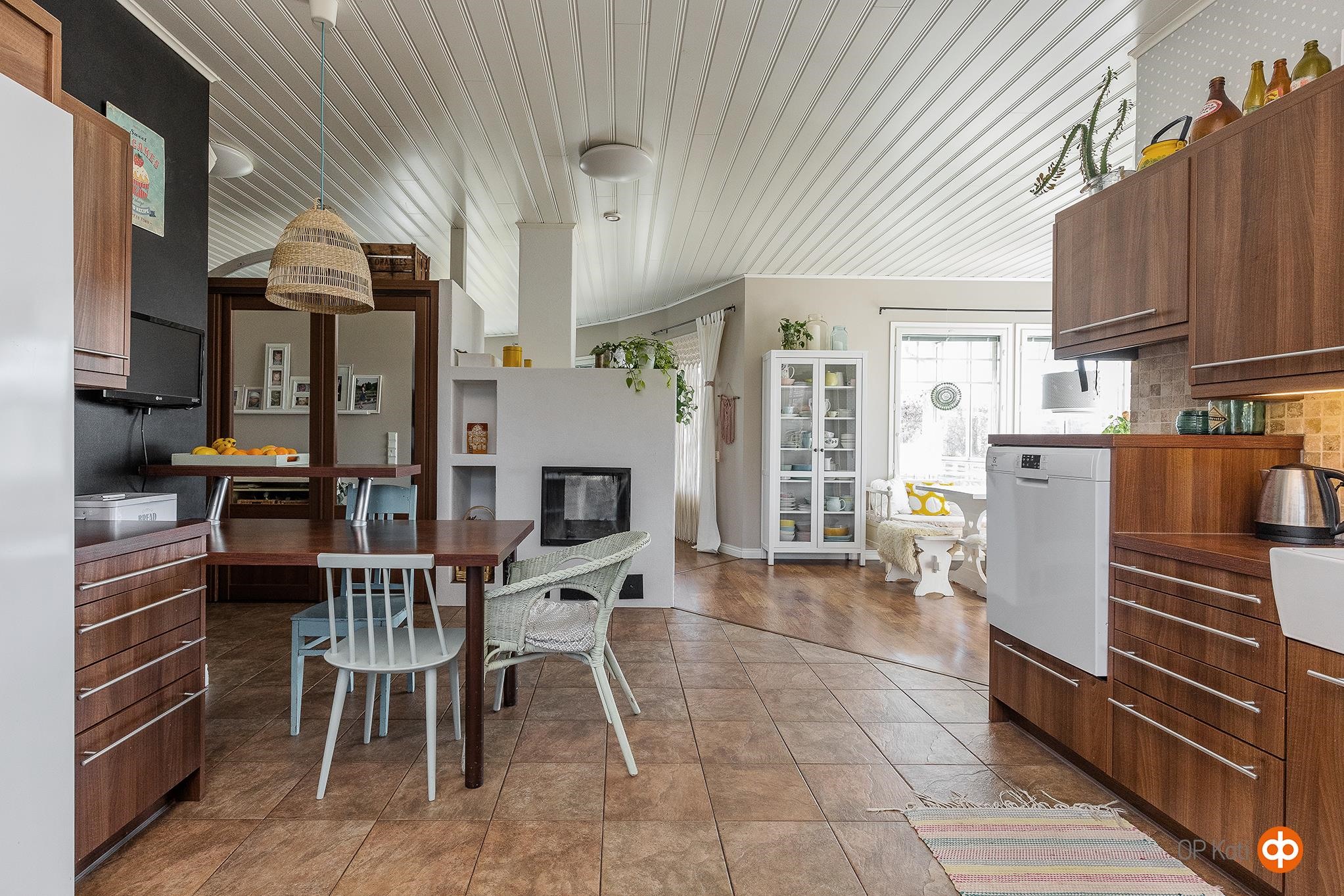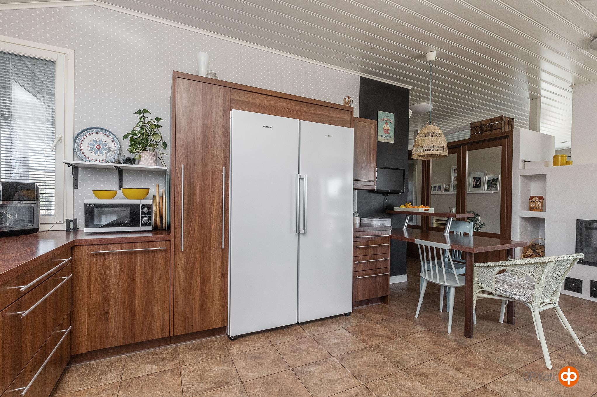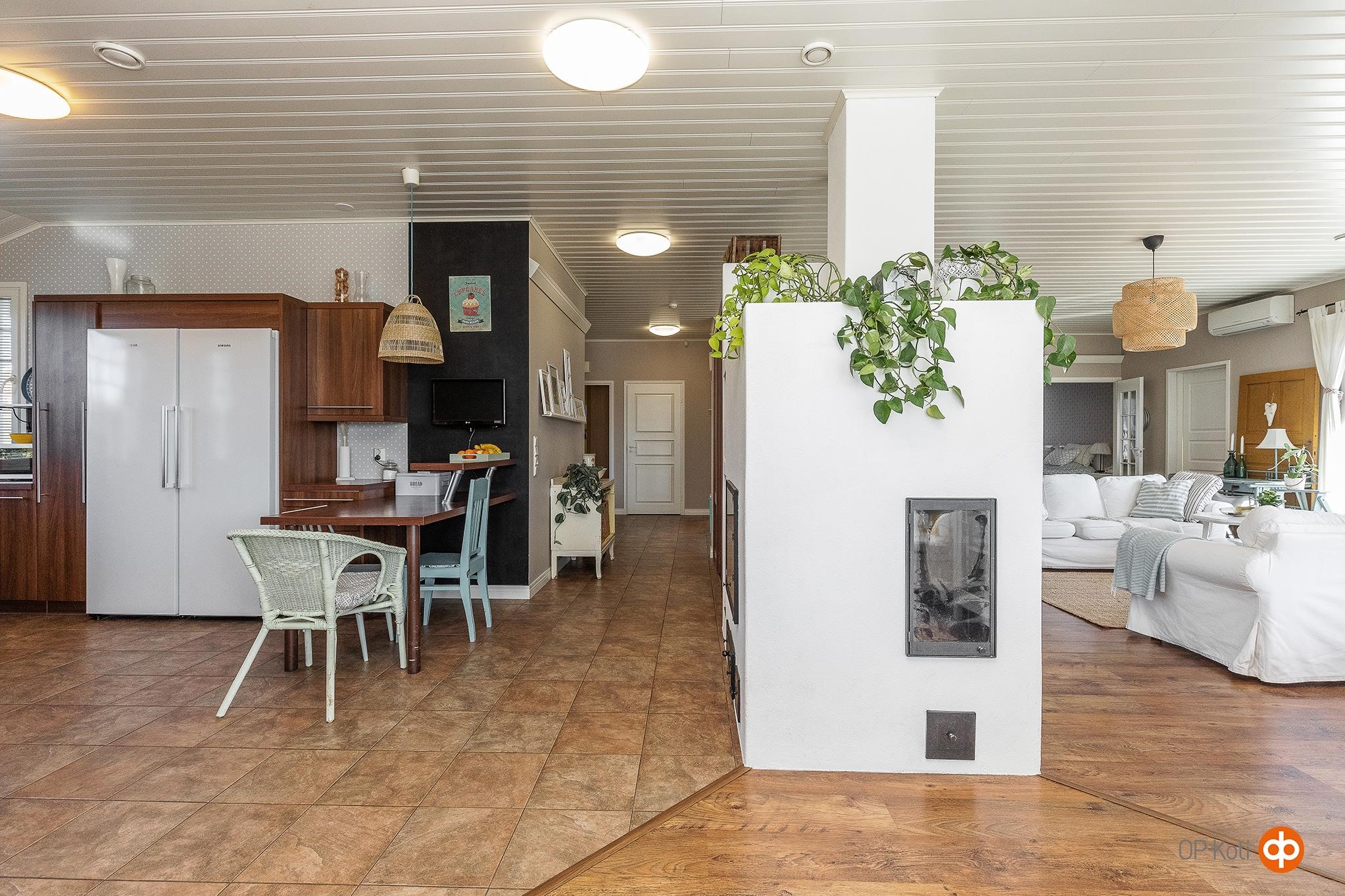 - Jääkaappi, pakastekaappi, erillisuuni, induktioliesi, liesikupu Huippuimuri, astianpesukone, kiinteät valaisimet, pöytätasojen materiaali laminaatti. Keittiökokonaisuus muodostuu suuresta työskentely- ja ruokailutilasta, yhteensä 33,4 m2. Laadukas Puustellin keittiö, jossa reilusti kaapistoja, vetolaatikostoja ja laskutilaa sekä helppohoitoinen laattalattia. Valoisassa ruokailutilassa paikka suuremmallekin ruokapöydälle. Kokonaisuuteen luo tunnelmaa ja lämpöä varaava takka, jonka kolme lasiluukkua aukeavat olohuoneeseen, ruokailutilaan ja keittiiöön.