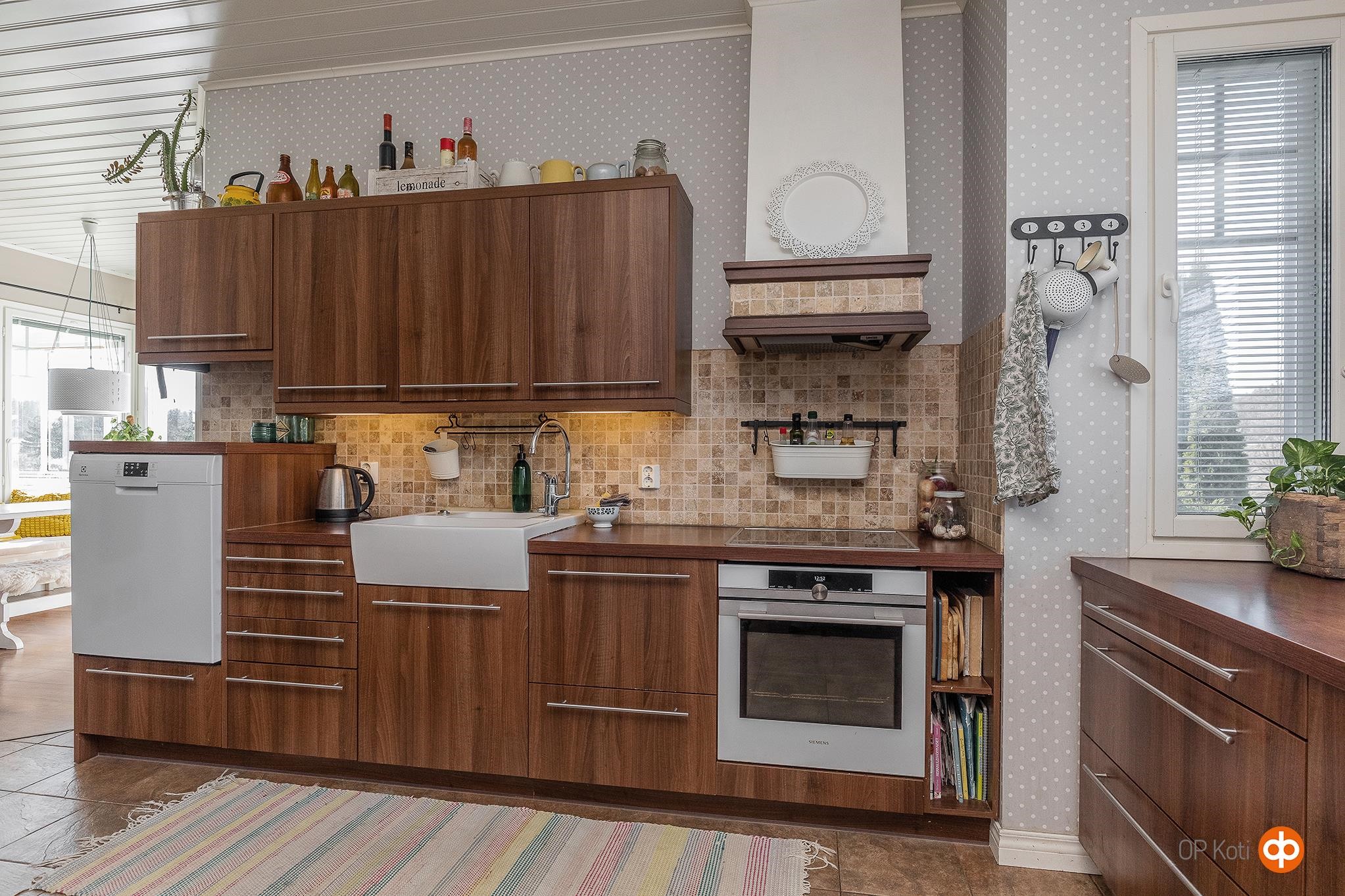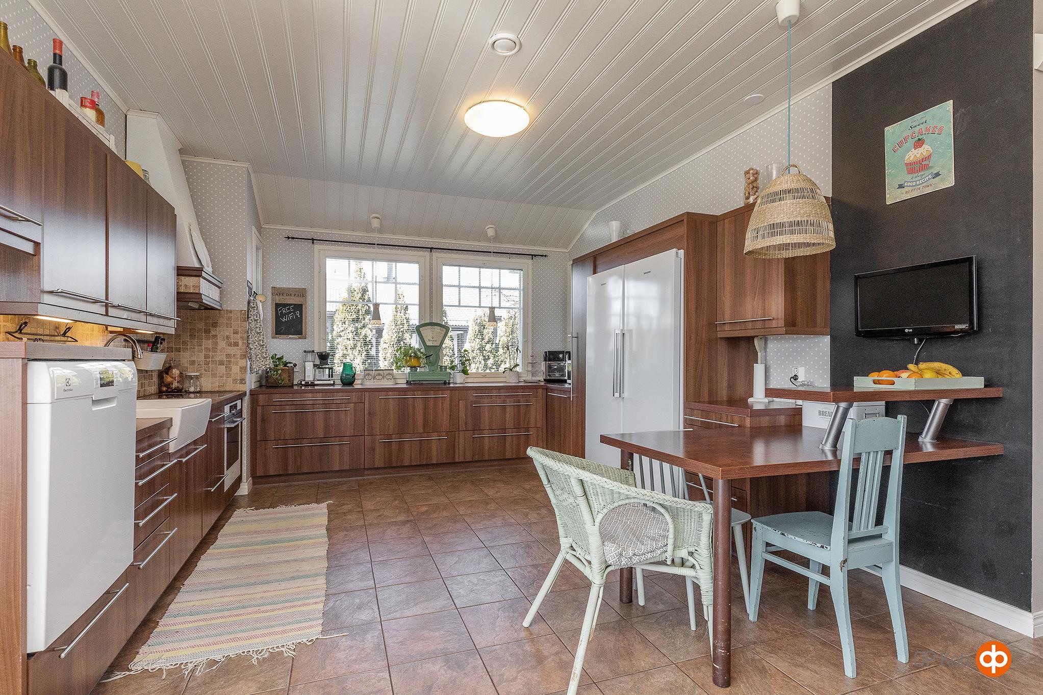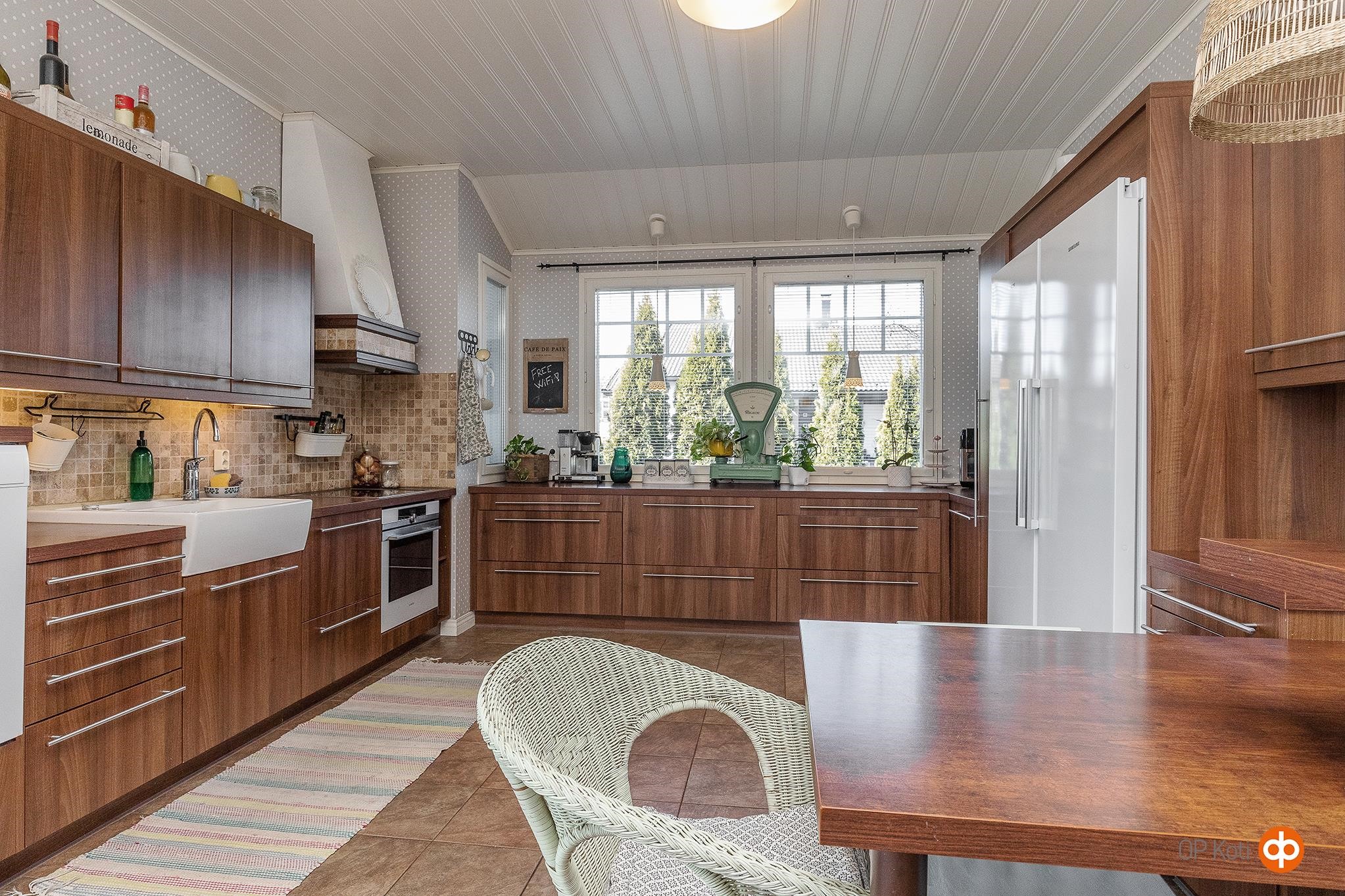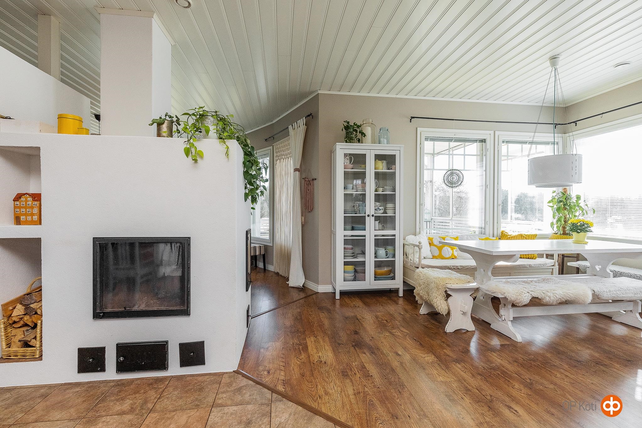 - Jääkaappi, pakastekaappi, erillisuuni, induktioliesi, liesikupu Huippuimuri, astianpesukone, kiinteät valaisimet, pöytätasojen materiaali laminaatti. Keittiökokonaisuus muodostuu suuresta työskentely- ja ruokailutilasta, yhteensä 33,4 m2. Laadukas Puustellin keittiö, jossa reilusti kaapistoja, vetolaatikostoja ja laskutilaa sekä helppohoitoinen laattalattia. Valoisassa ruokailutilassa paikka suuremmallekin ruokapöydälle. Kokonaisuuteen luo tunnelmaa ja lämpöä varaava takka, jonka kolme lasiluukkua aukeavat olohuoneeseen, ruokailutilaan ja keittiiöön.