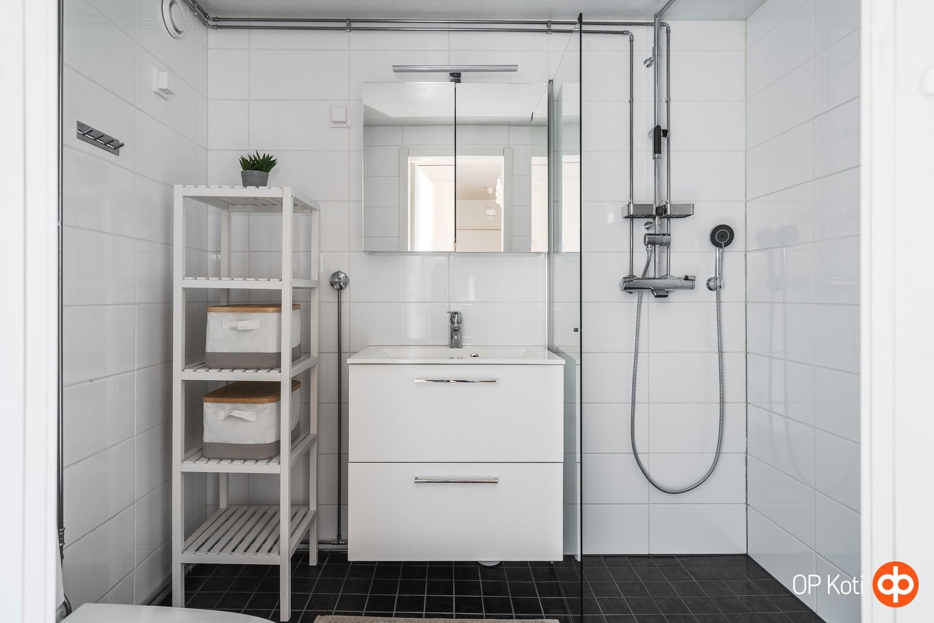 - Kylpyhuoneessa on suihku, peili- ja allaskaapit, pesukoneliitäntä sekä kiinteät valaisimet. Kylpyhuone on saneerattu 2019.