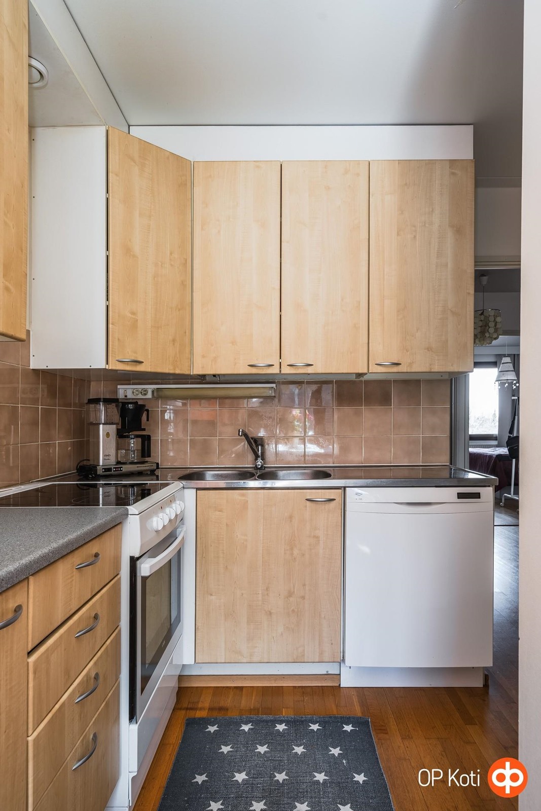 - Keittiön varusteisiin kuuluu jääkaappipakastin, keraaminen liesi, astianpesukone, kaapistot, kiinteät valaisimet. Jääkaappipakastimen alla on kuivunut jälki vuosia sitten tapahtuneesta pienestä vuodosta.
