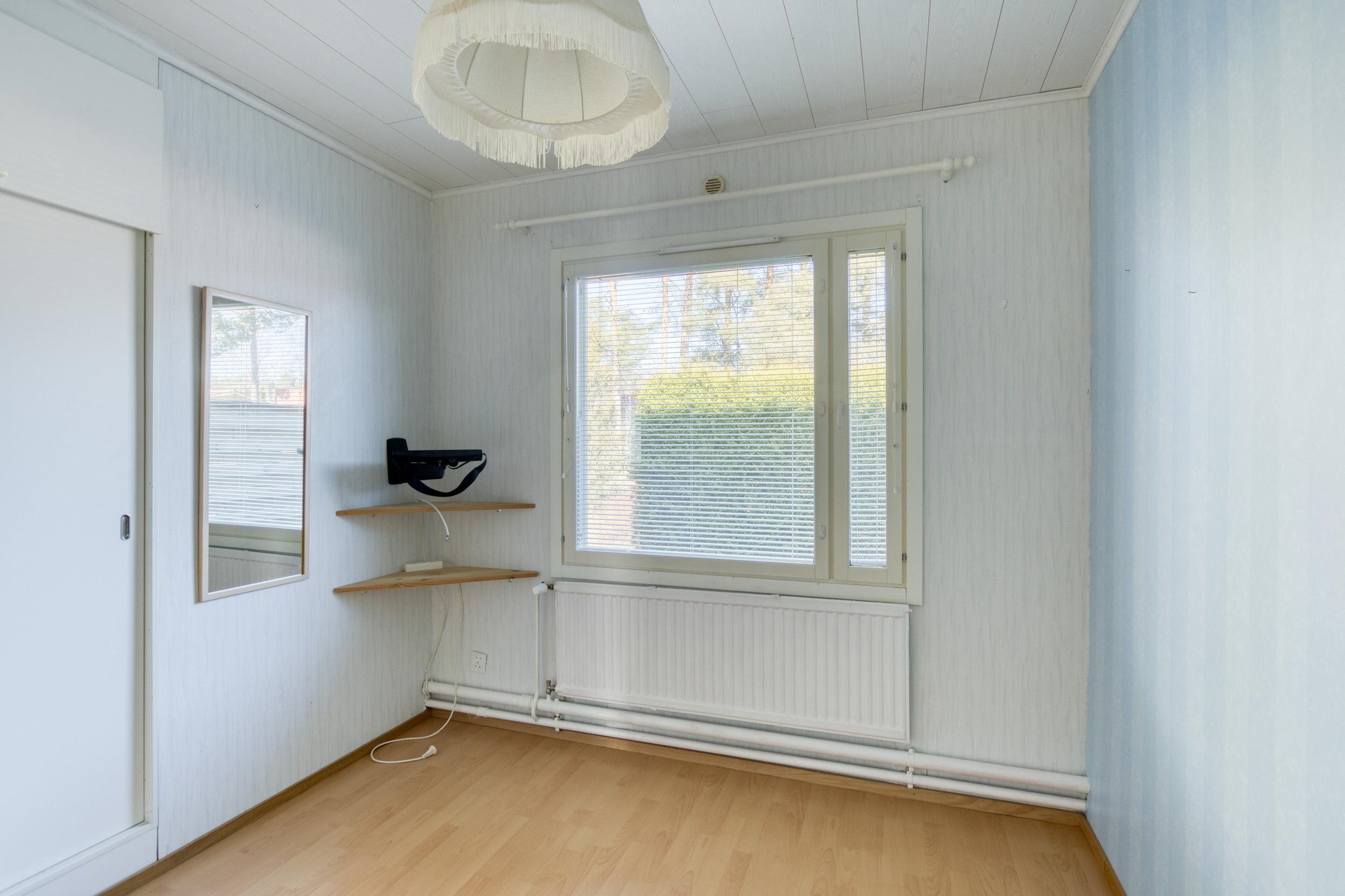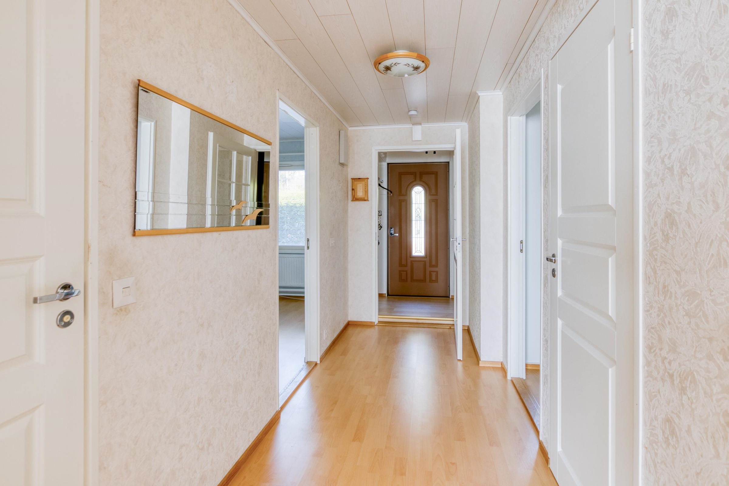 Keittiö: Lattia laminaattia. Olohuone: Lattia laminaattia, seinät tapetoitu. Makuuhuone 1: Lattia laminaattia, seinät tapetoitu. Kodinhoitohuone: Lattia muovimattoa, seinät laatoitettu. Sauna: Lattia laatoitettu, seinät paneloitu. Kylpyhuone: Kokonaan laatoitettu. Eteinen: Lattia laminaattia, seinät tapetoitu. Wc: Lattia laatoitettu, seinät laatta/tapetti.