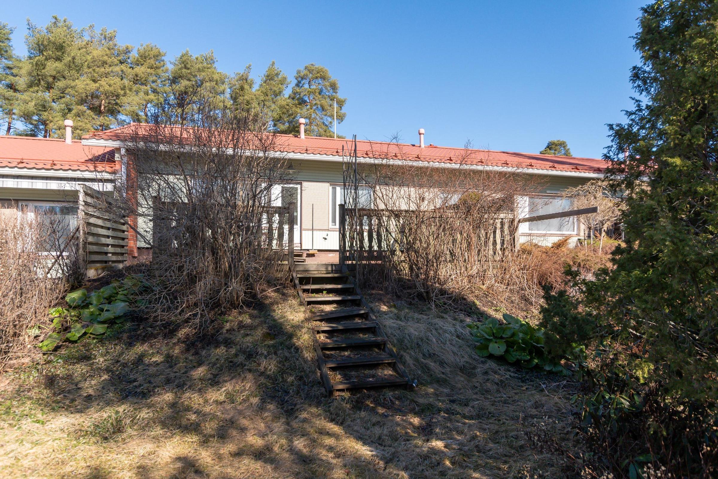 Pohjaratkaisu käsittää olohuoneen, keittiön, kaksi makuuhuonetta, saunan, pesuhuoneen, erillisen wc:n sekä kodinhoitohuoneen. Olohuoneesta on käynti etelän suuntaiselle terassille ja oleskelupihalle, kun taas sisäänkäynti ja etupiha avautuvat pohjoiseen. Keittiössä on kaikki tarvittava arjen ruoanlaittoon, ja kodinhoitohuoneessa on paikka pyykkihuollolle. Kylpyhuone on laatoitettu ja saunassa on sähkökiuas. Säilytystilaa on vaatehuoneessa ja ulkovarastossa, ja huoneistossa on sälekaihtimet.