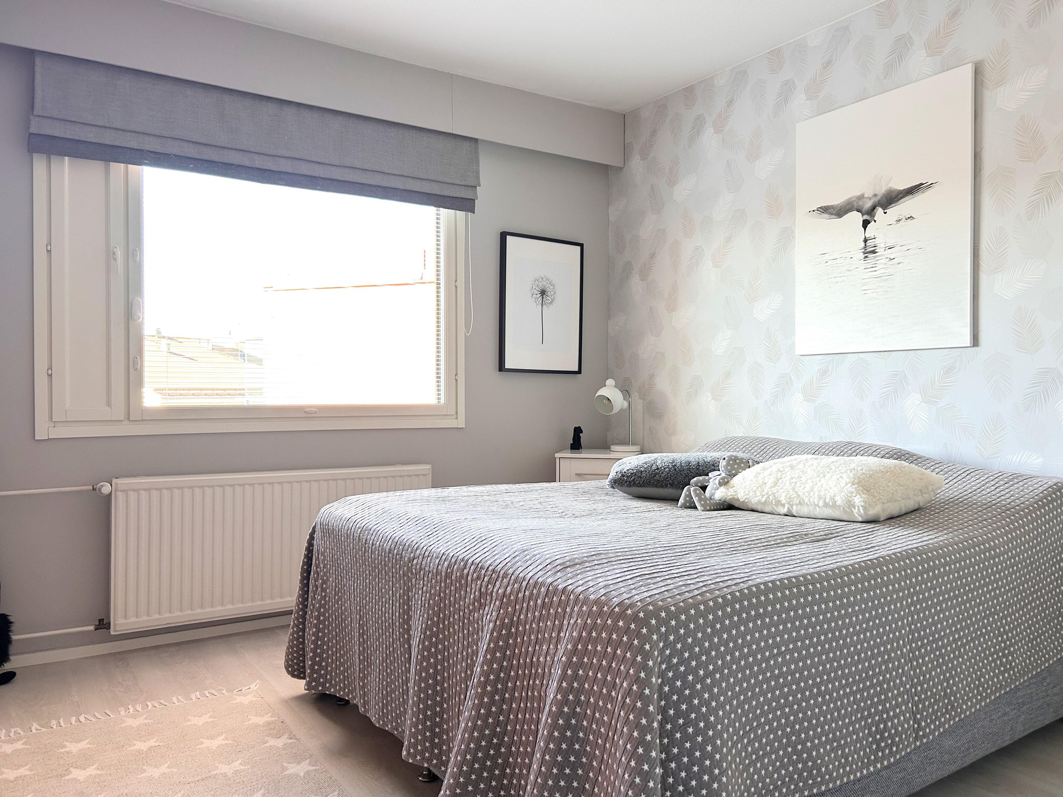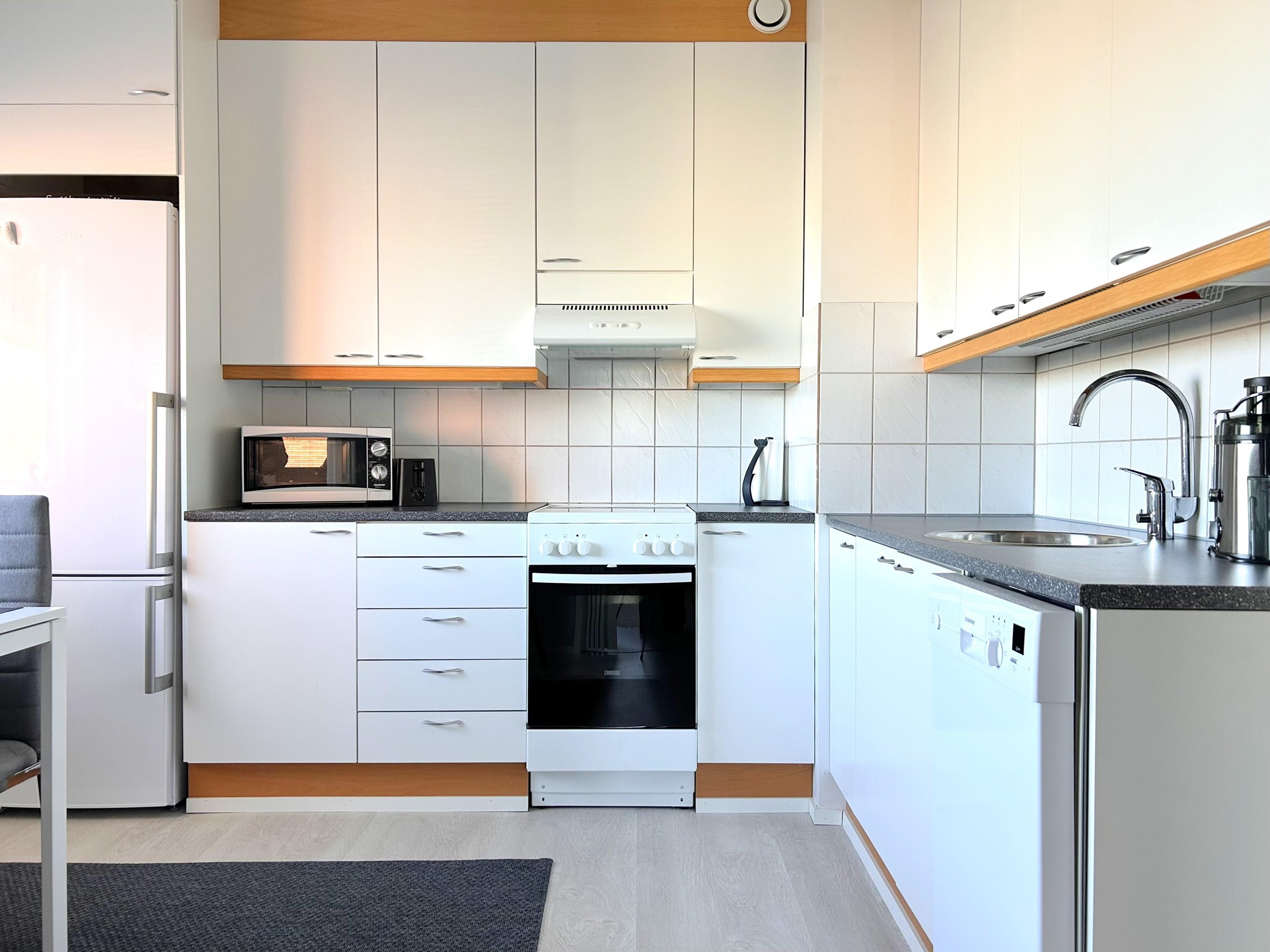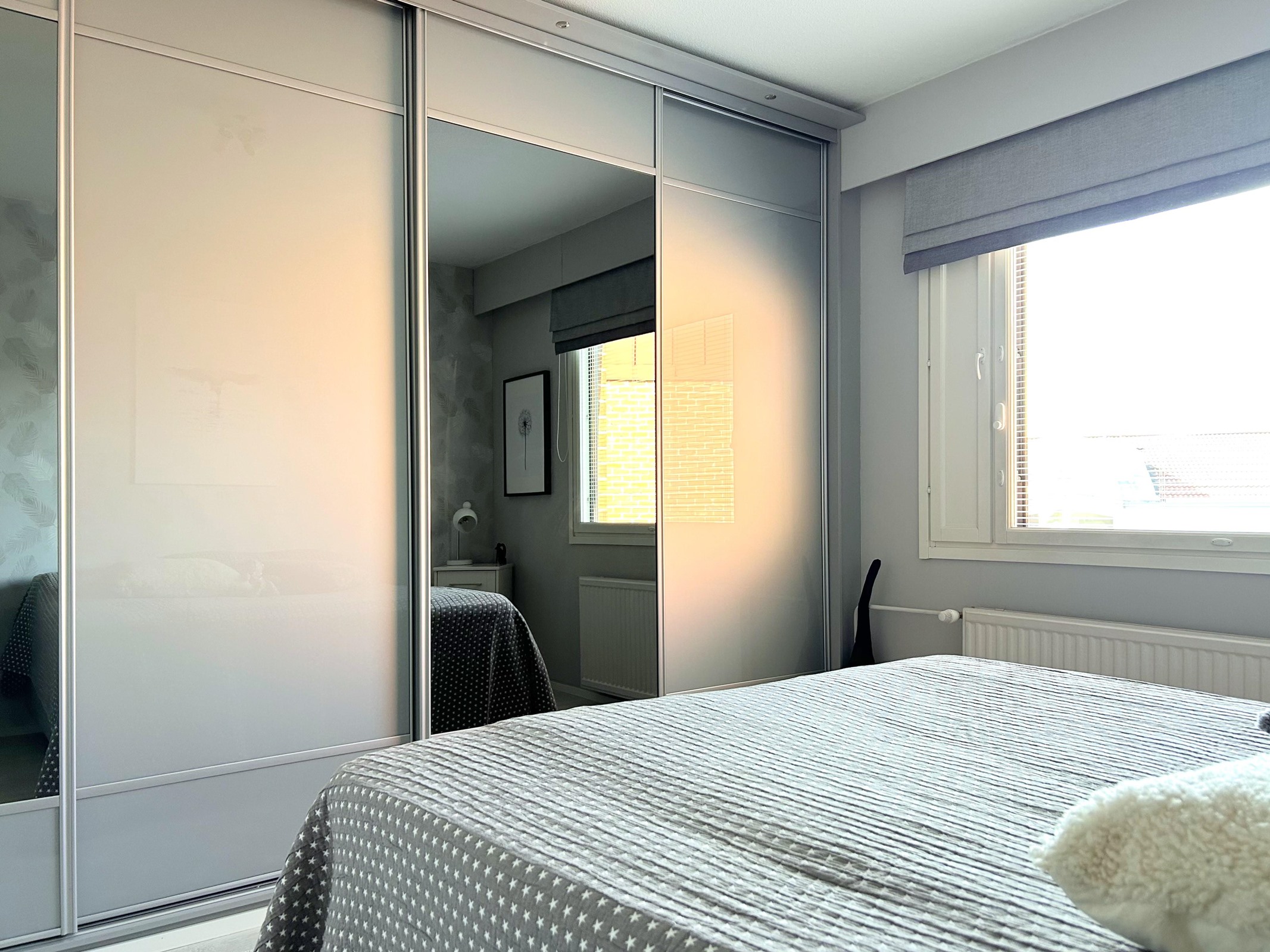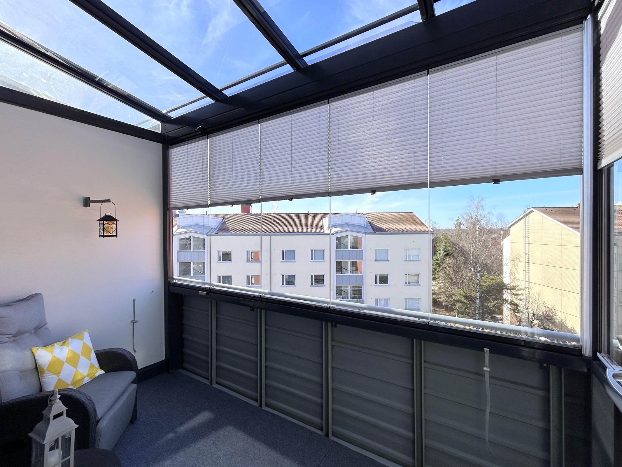 Toimiva pohjaratkaisu. Toimiva keittiö, tilava makuuhuone hyvillä säilytystiloilla ja siisti kylpyhuone tekevät arjesta sujuvaa. Olohuoneessa kiva tehosteseinä ja keittiössä Puustellin valkoiset kaapistot. Upea lasitettu parveke tarjoaa viihtyisän oleskelupaikan pitkälle syksyyn.