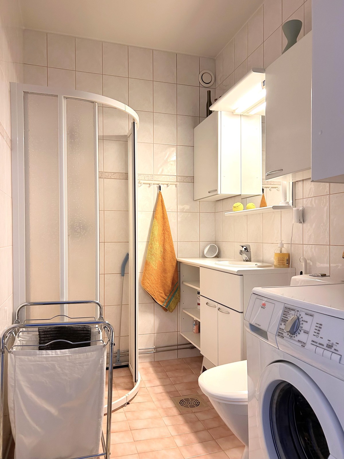 - Laatoitetussa kylpyhuoneessa suihkukaappi, peilikaapisto, allaskaappi ja pesukoneliitäntä.