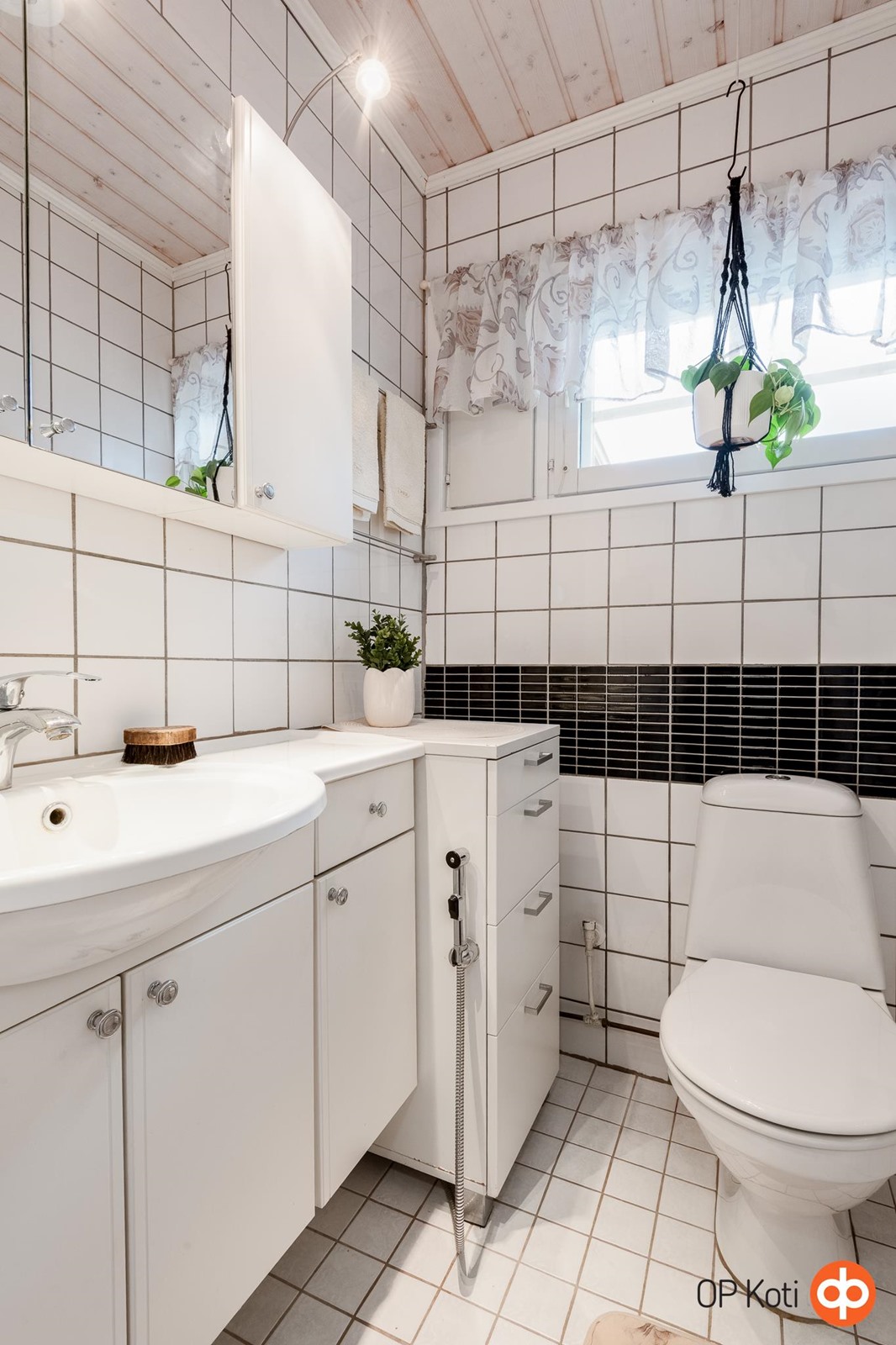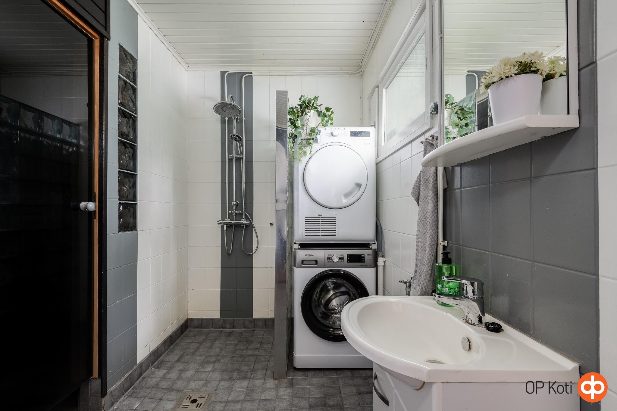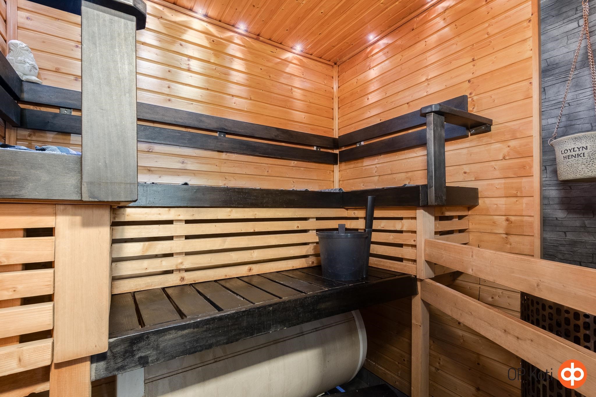 - Sauna, puukiuas, kylpyhuone, erillinen wc, suihku, peilit, peilikaappi, kaapit, pesukoneliitäntä, lattialämmitys, kiinteät valaisimet.