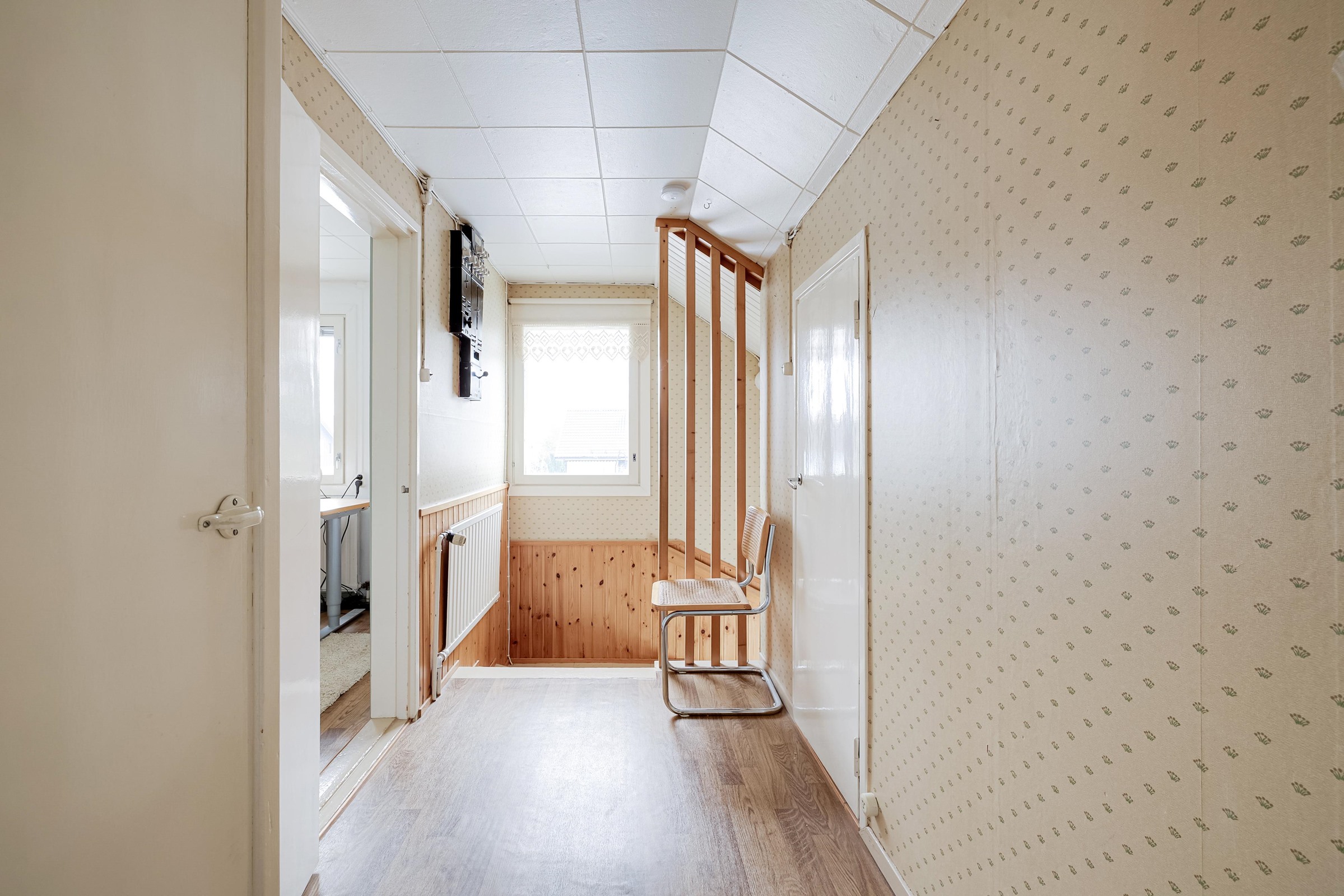 Keittiö: Osa kaapeista alkuperäisiä, linoleumilattia, seinät tapetti ja maali. Olohuone: Muovimatto, seinät tapettia. Makuuhuone 1: Yläkerrassa laminaattilattia, seinät tapetoitu. Makuuhuone 2: Yläkerrassa laminaattilattia, seinät tapetoitu. Kodinhoitohuone: Betonivalulattia, pinnoitettu. Sauna: Laattalattia, seinät paneelia. Kylpyhuone: Laattalattia ja laattaseinät. Eteinen: Muovimatto, seinät tapettia. Wc: Muovimatto, seinät tapettia. Kuisti: Lautalattia, paneeliseinät.
