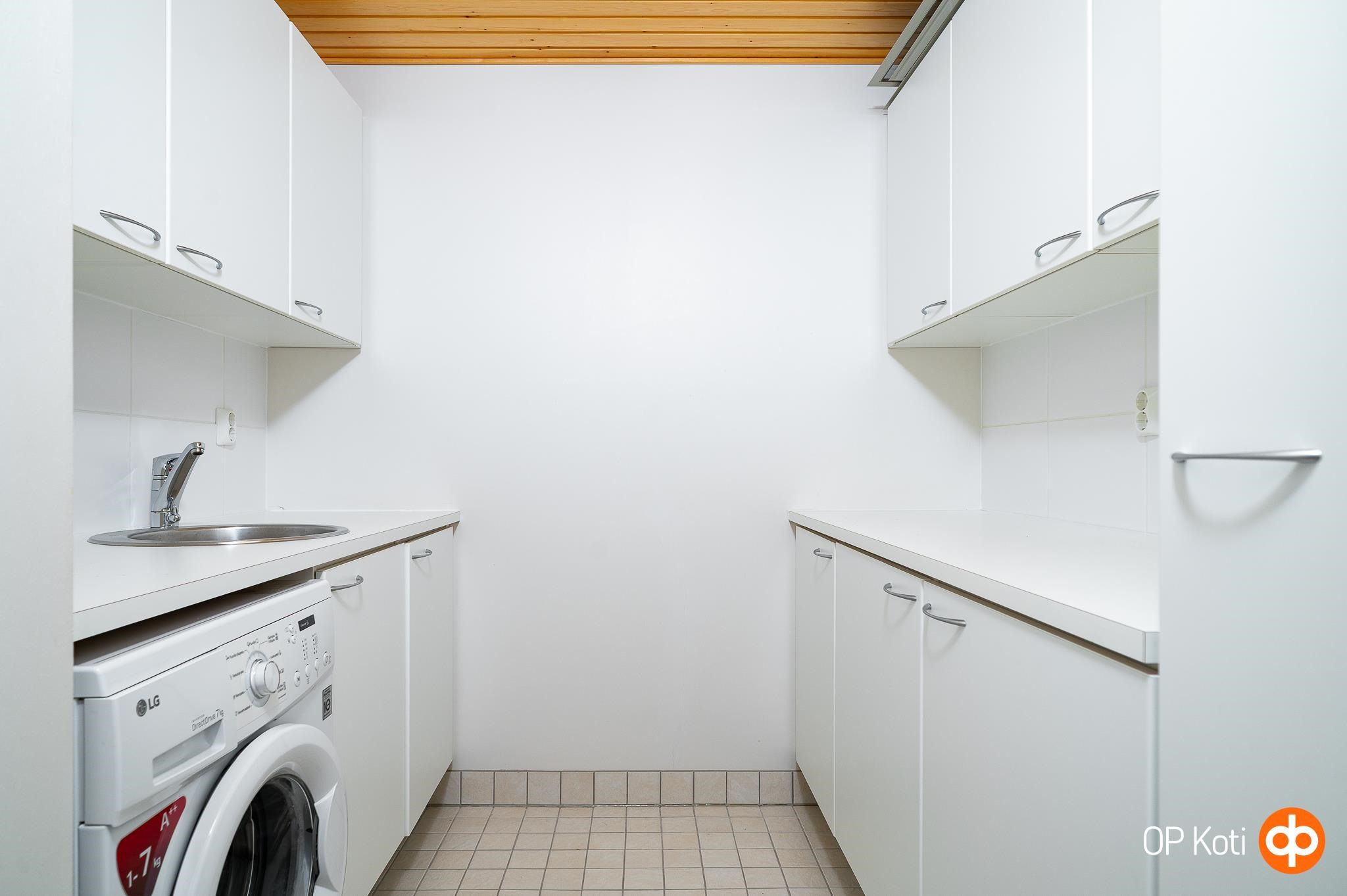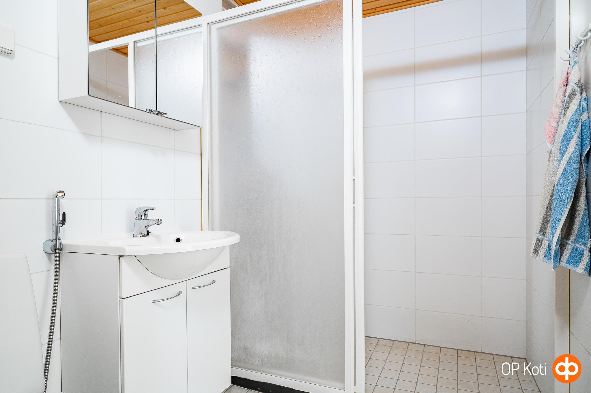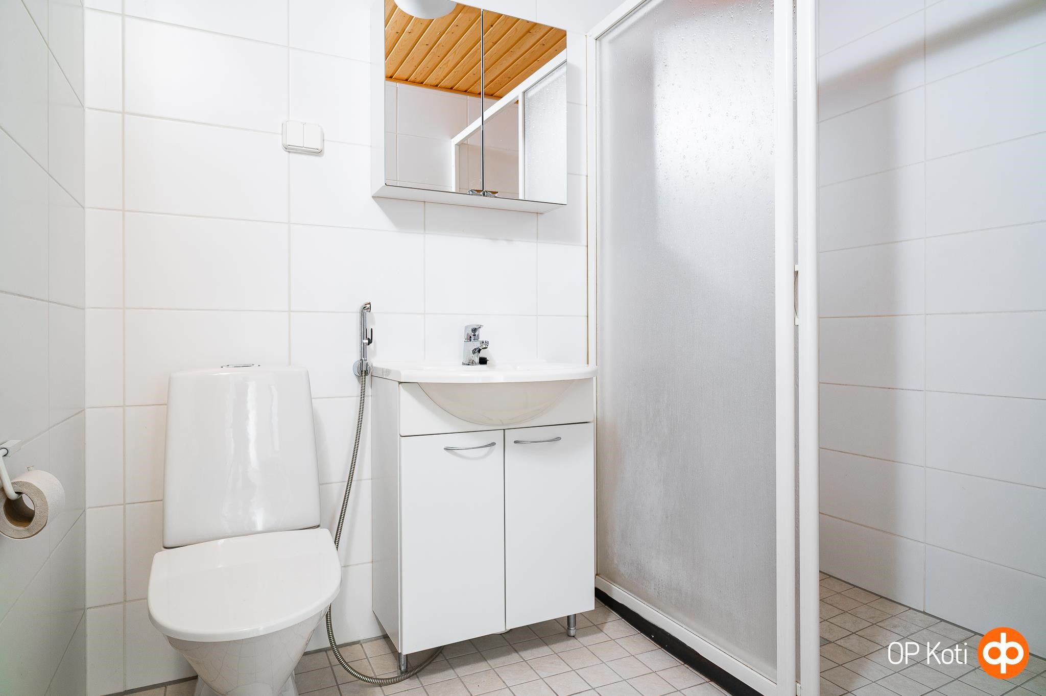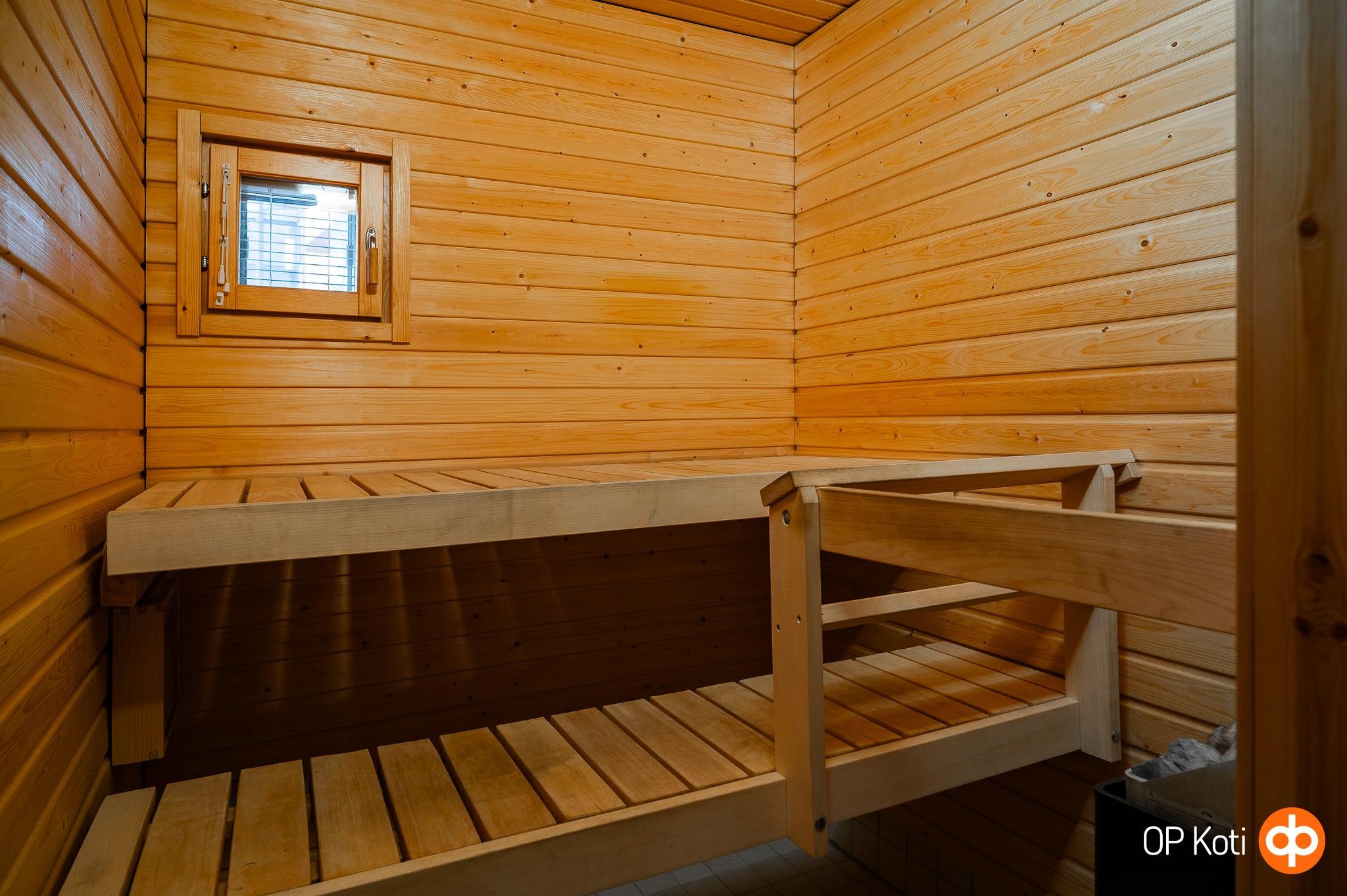 - Sauna, sähkökiuas, kylpyhuone, suihku, suihkuseinä, peilikaappi, allaskaappi, pesukoneliitäntä, lattialämmitys, kiinteät valaisimet.