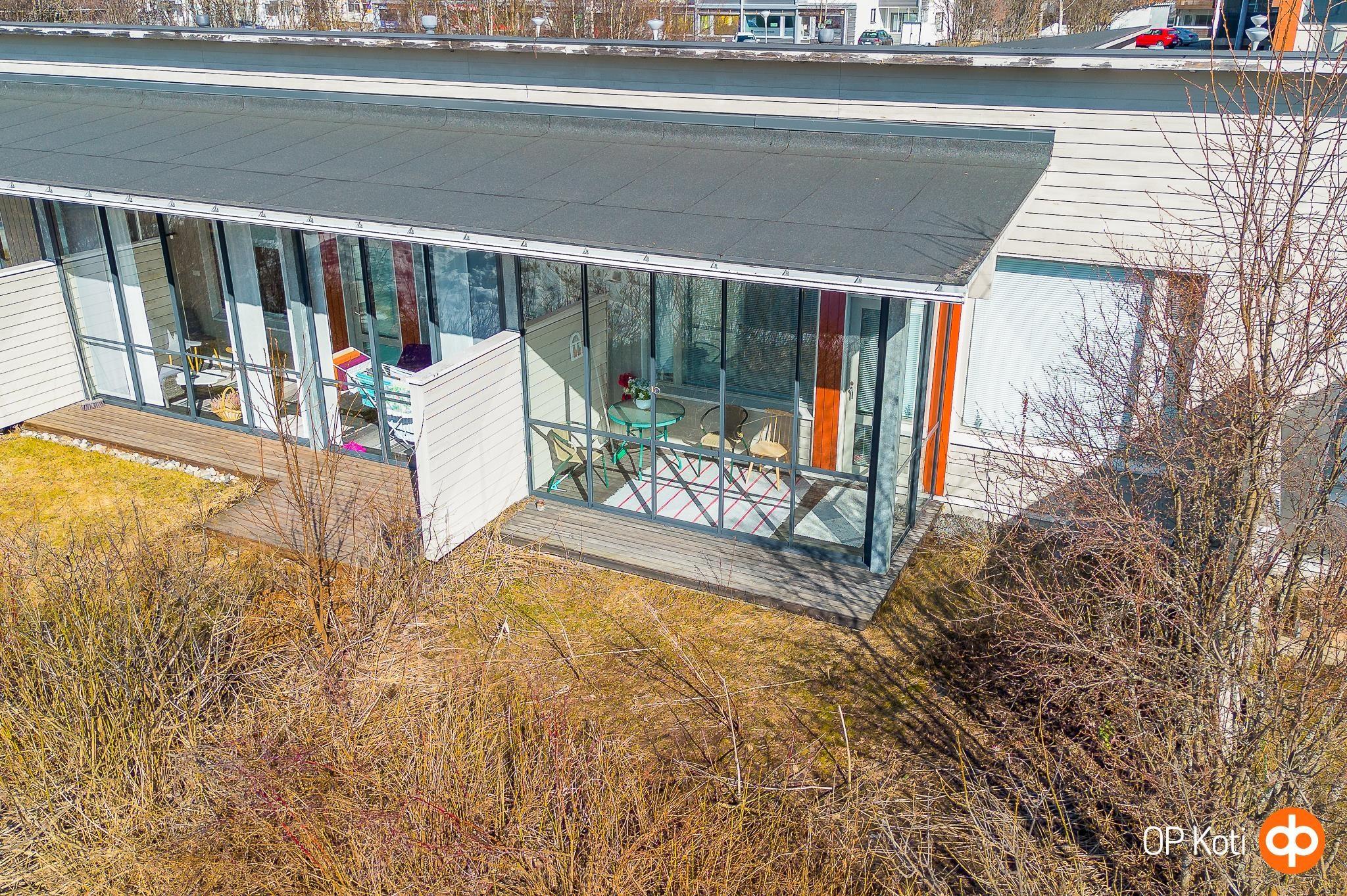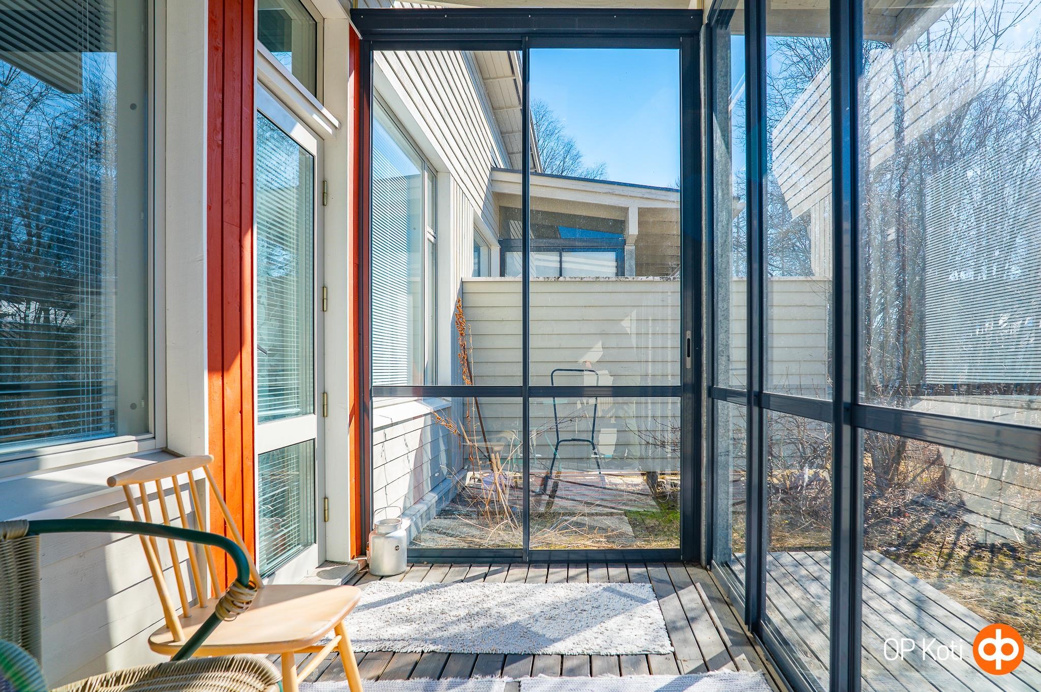 Tämän yksitasoisen kodin pohjaratkaisu tekee liikkumisesta vaivatonta, ja huoneet asettuvat selkeästi arkea tukeviksi: olohuone ja keittiö muodostavat viihtyisän yhteisen tilan, johon mahtuu sekä ruokapöytä että sohvanurkkaus. Keittiössä on hyvin kaappitilaa ja toimiva työskentelytasojen ja kodinkoneiden kokonaisuus ruoanlaittoa varten. Tilavassa kylpyhuoneessa pyykinpesukoneelle on oma paikkansa, ja oma sauna tuo iltoihin rauhallisen hetken. Olohuoneesta avautuu kulku lasitetulle terassille, joka pidentää käyttökelpoista kesäkautta pitkälle syksyyn. Pensasaidalla rajattu piha-alue tarjoaa mukavasti yksityisyyttä, tilaa oleskeluun, pienen hyötypuutarhan tai lasten leikeille, ja oma ulkovarasto helpottaa kausitavaroiden säilyttämistä.