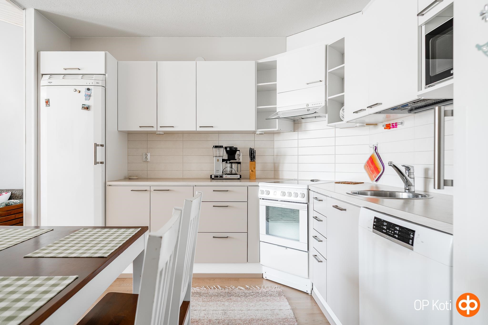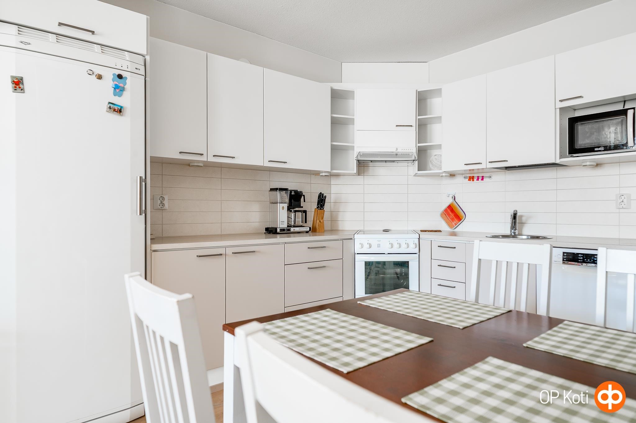 - Jääkaappi, pakastekaappi, lattialiesi, keraaminen liesi, liesituuletin, astianpesukone, kaapistot, kiinteät valaisimet.