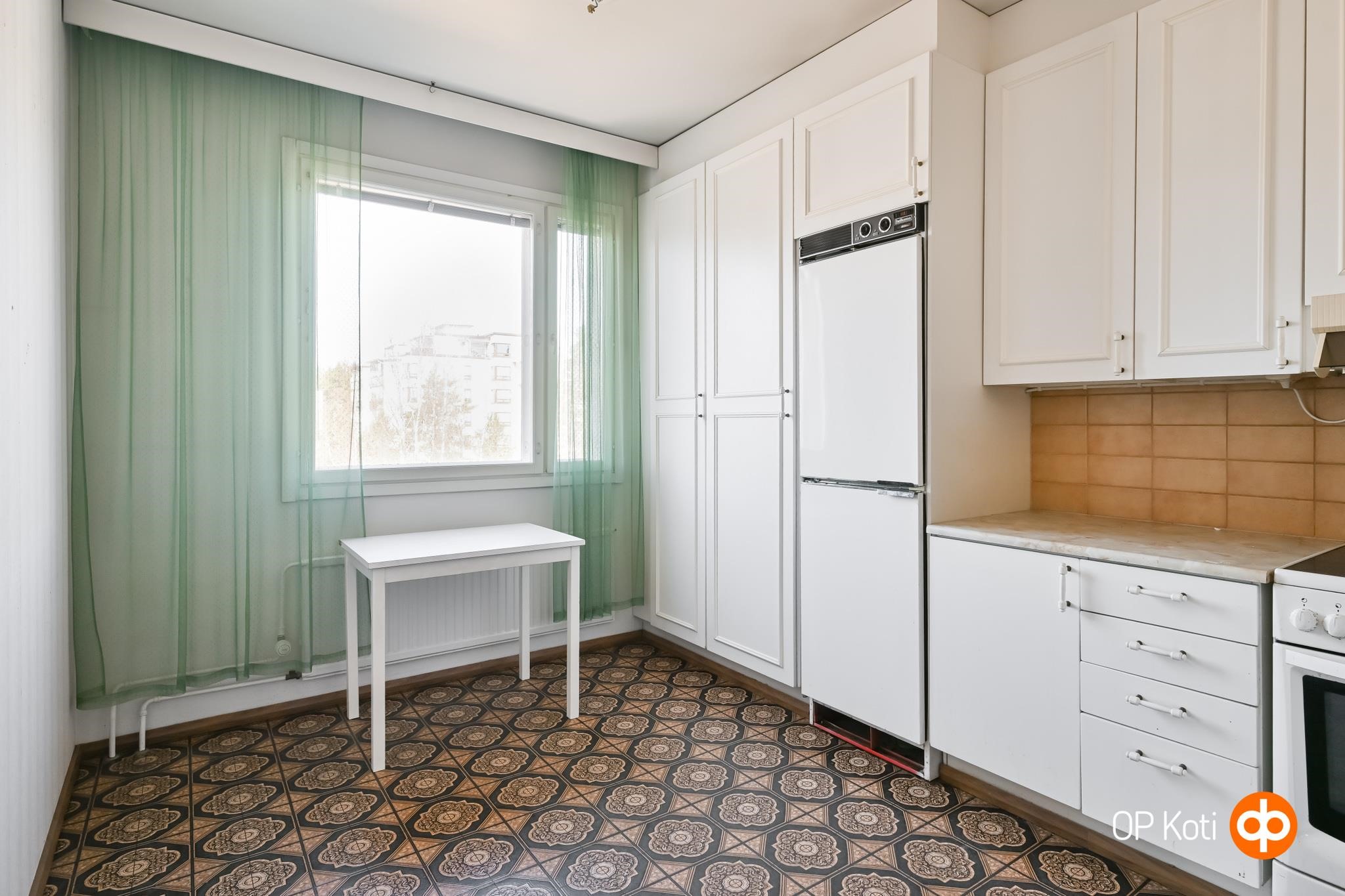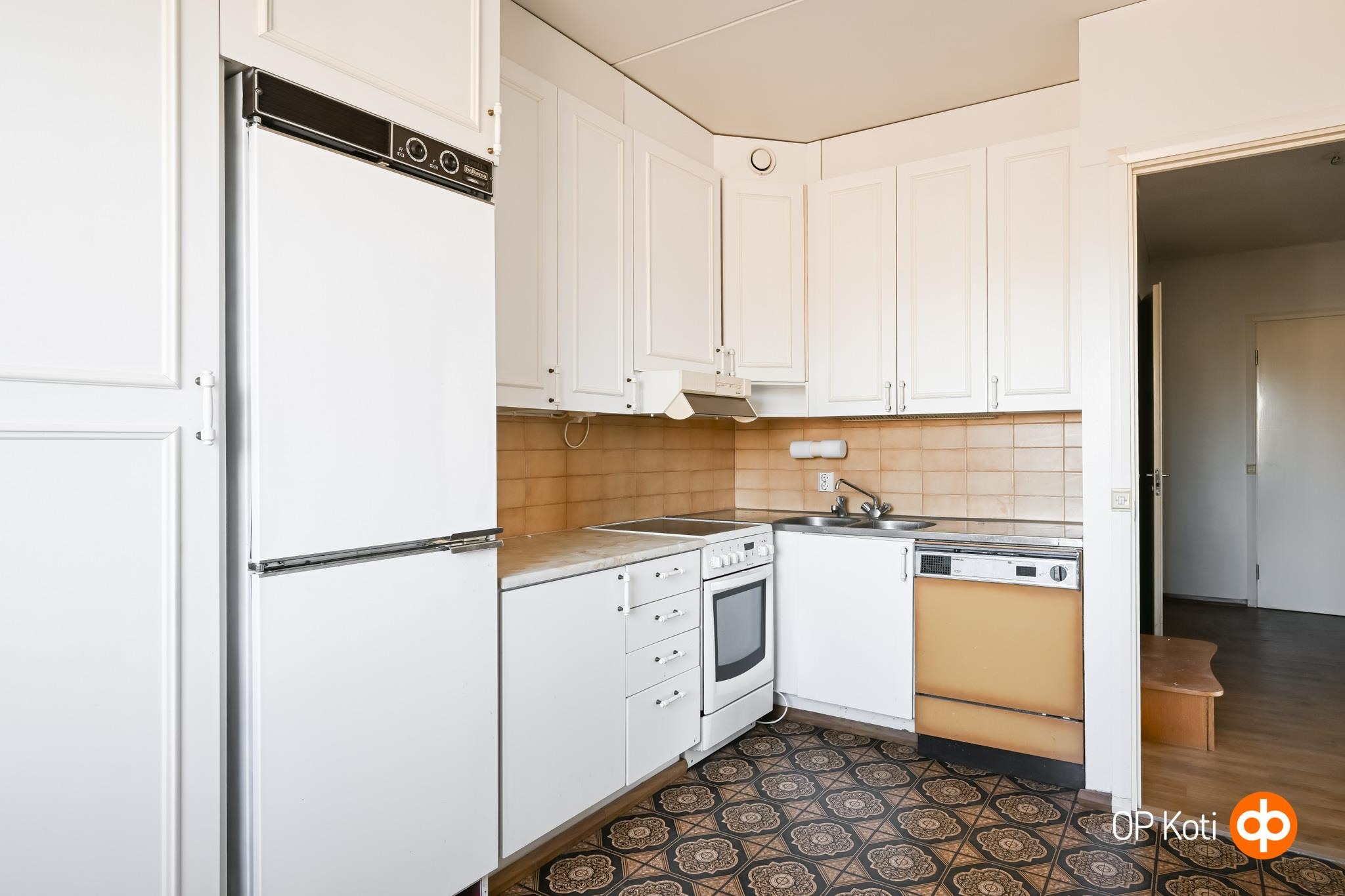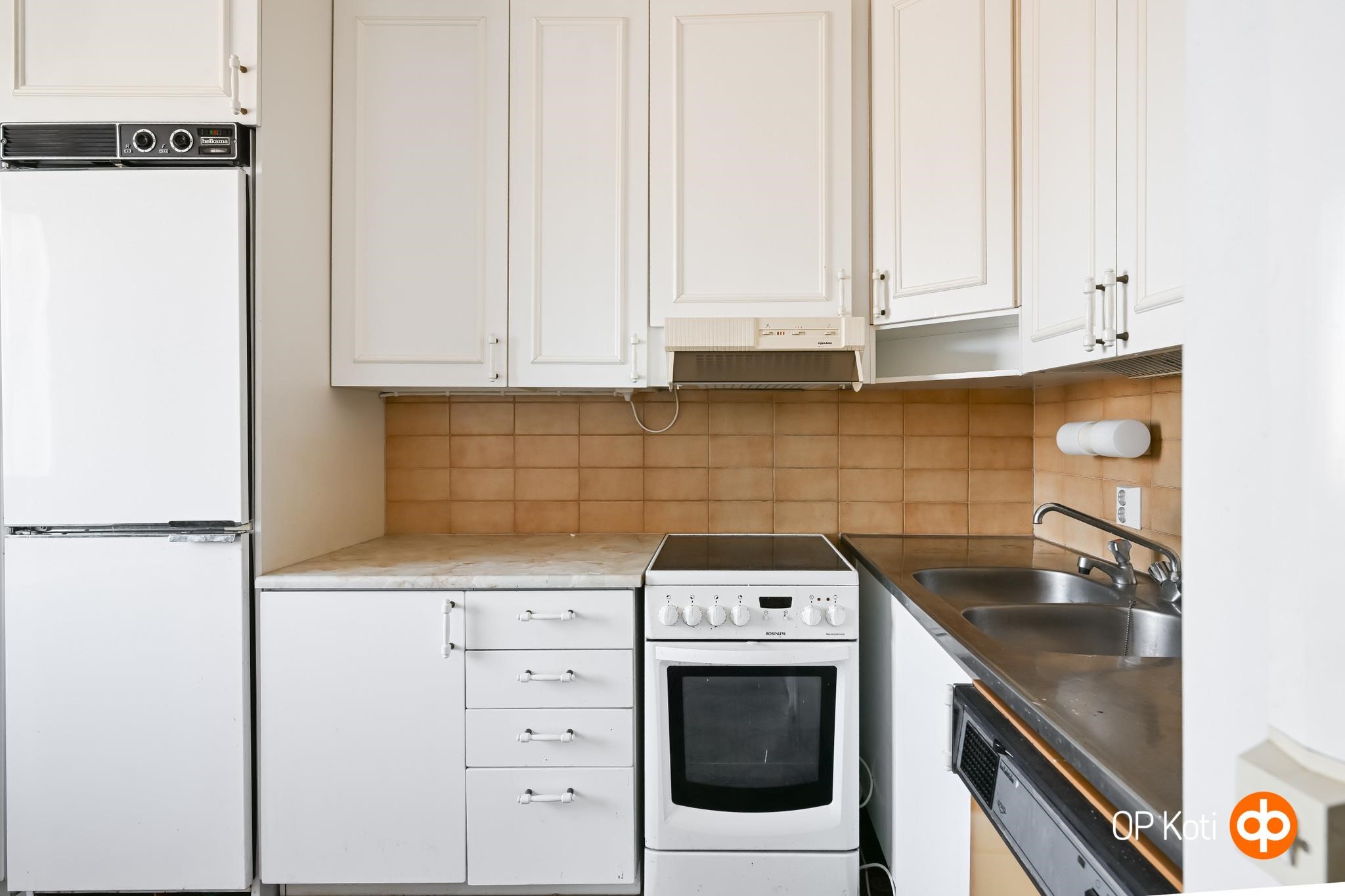 - Jääkaappipakastin, keraaminen liesi, liesituuletin (aktiivihiili), astianpesukone, kaapistot, kiinteät valaisimet. Keittiö on pinnoiltaan alkuperäinen, kaapinovia on päivitetty (vuosi ei tiedossa)