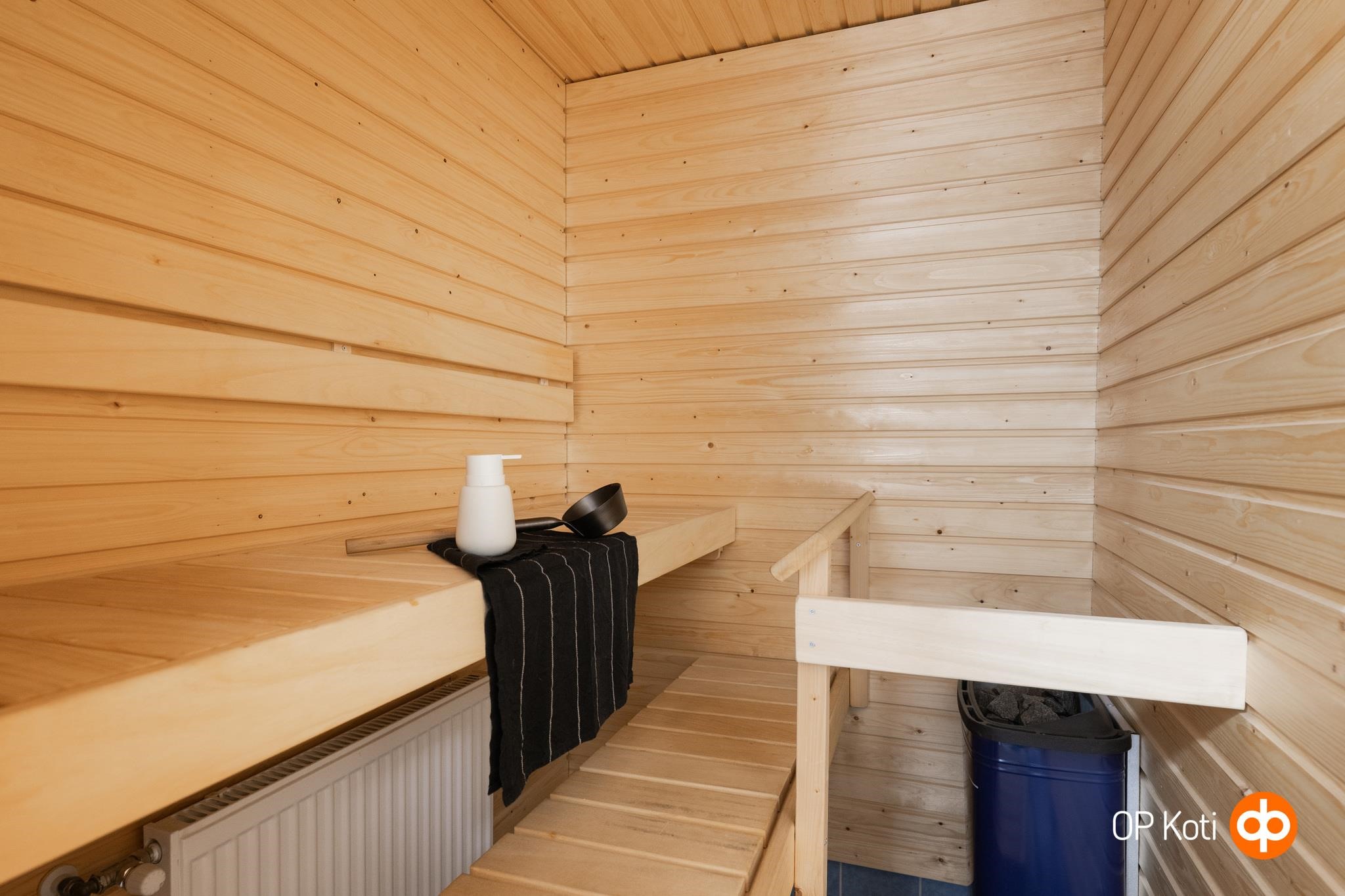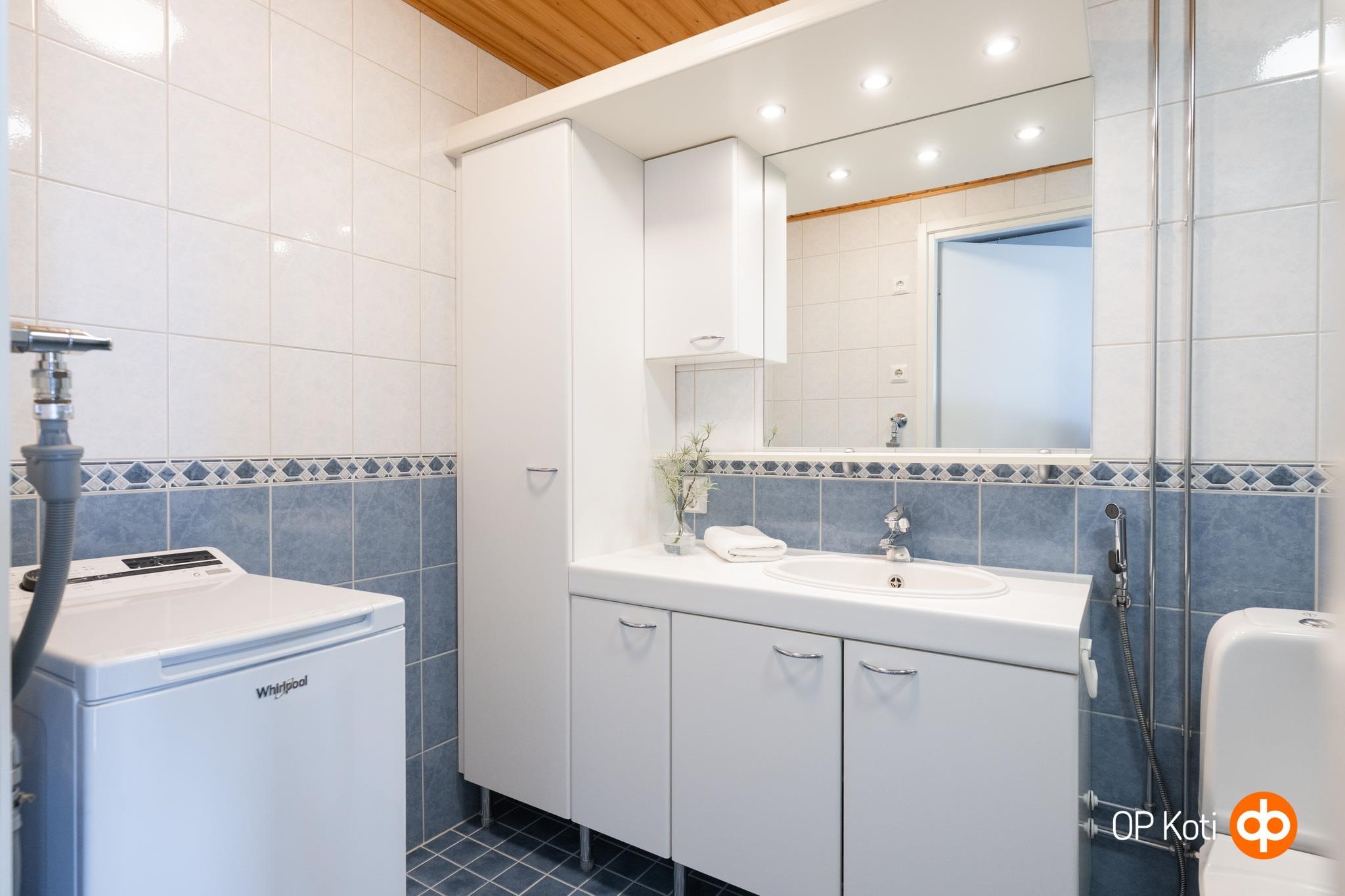 - Sauna, sähkökiuas, kylpyhuone, suihku, suihkuseinä, kaapit, allaskaappi, pesukoneliitäntä, lattialämmitys (sähköinen mukavuuslattialämmitys), kiinteät valaisimet.