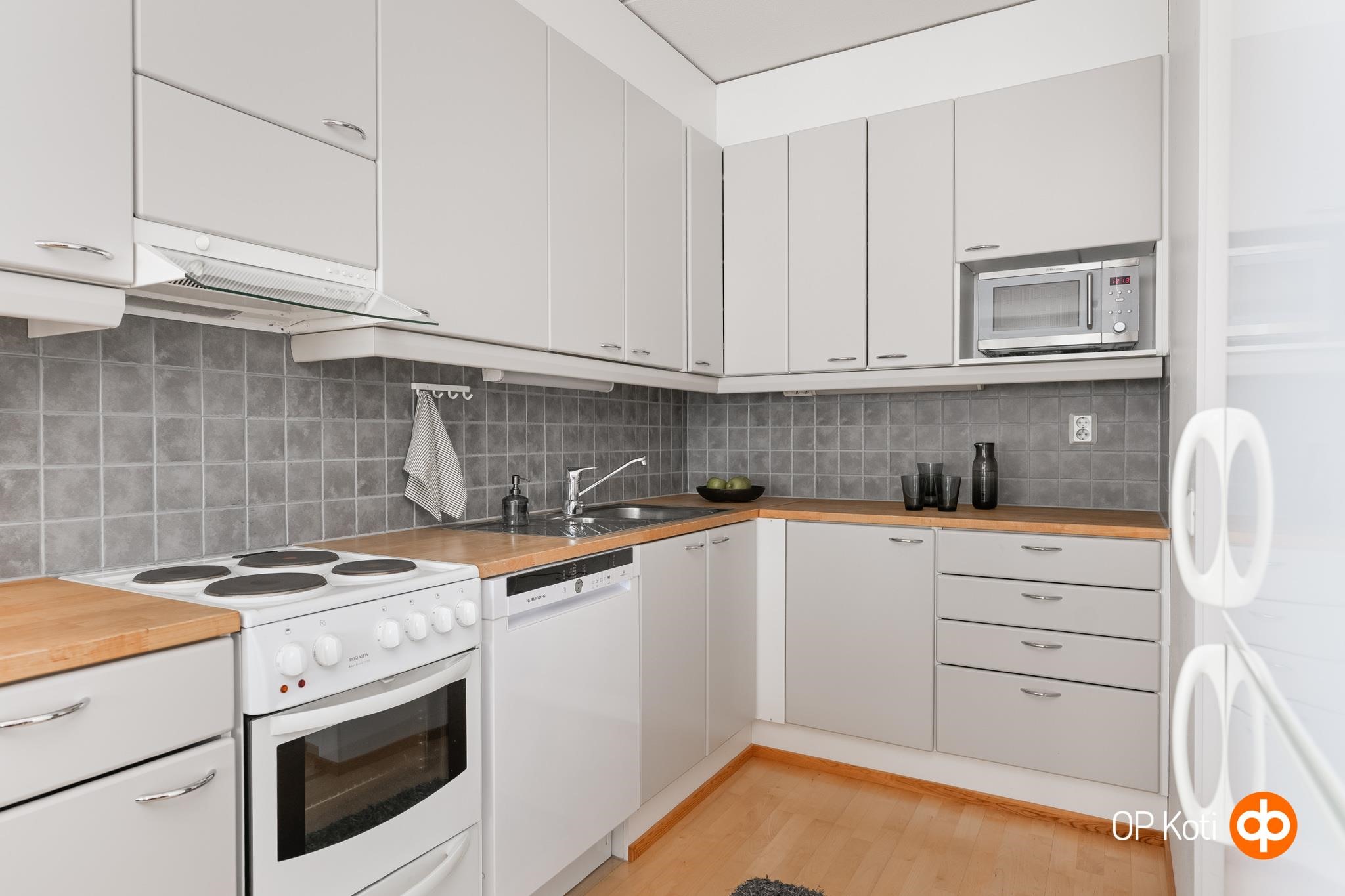 - Jääkaappipakastin, sähköliesi, liesikupu, astianpesukone, kaapistot, kiinteät valaisimet.