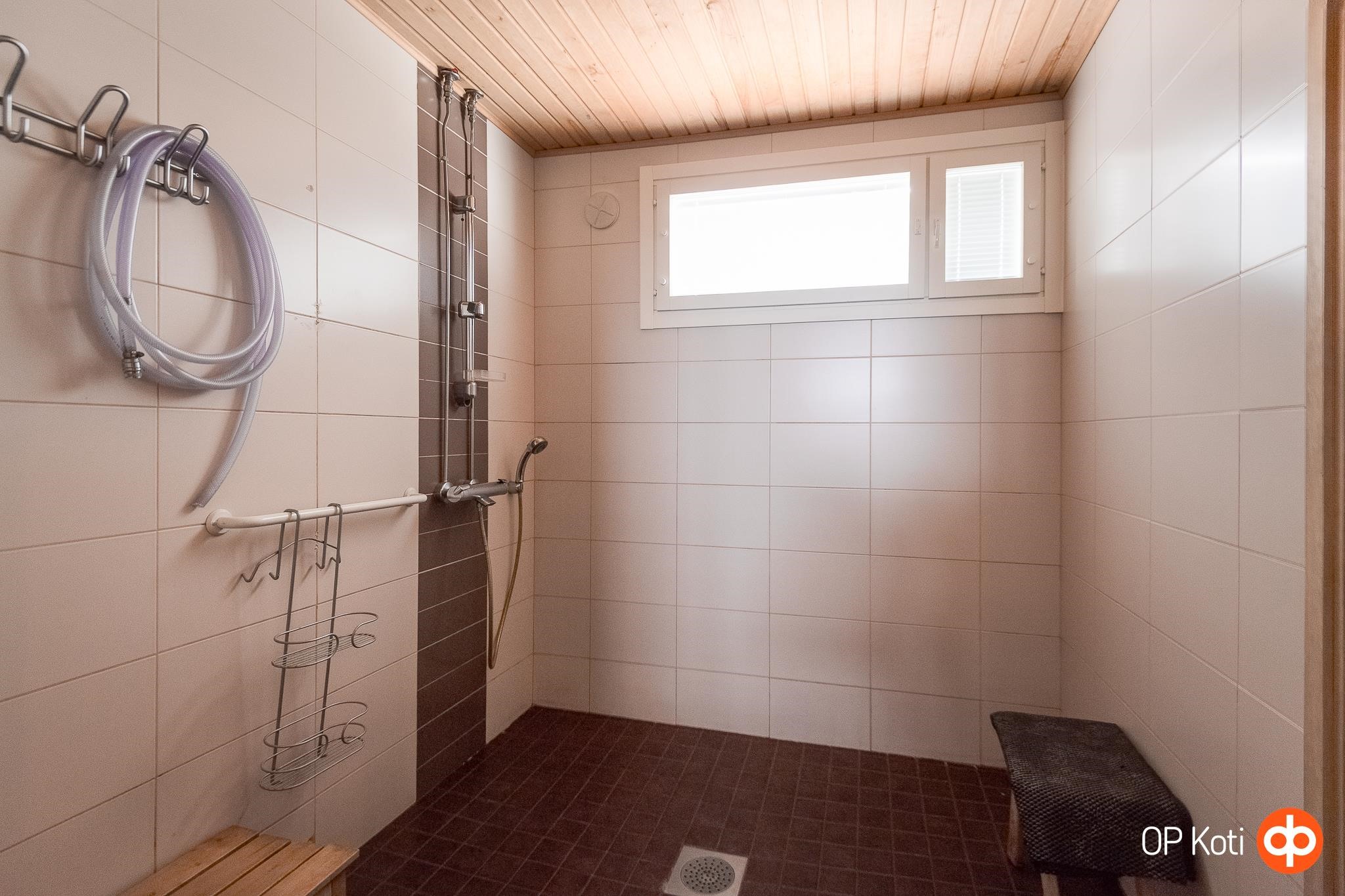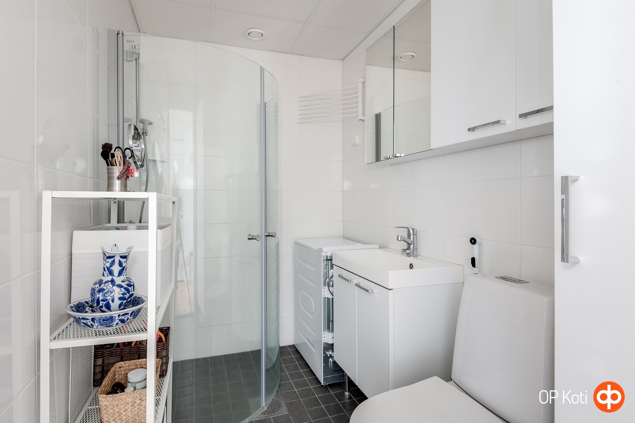 - Kylpyhuone, suihku, suihkukaappi, peilikaappi, kaapit, allaskaappi, pesukoneliitäntä, lattialämmitys, kiinteät valaisimet. Pesutilat uusittu 2019.