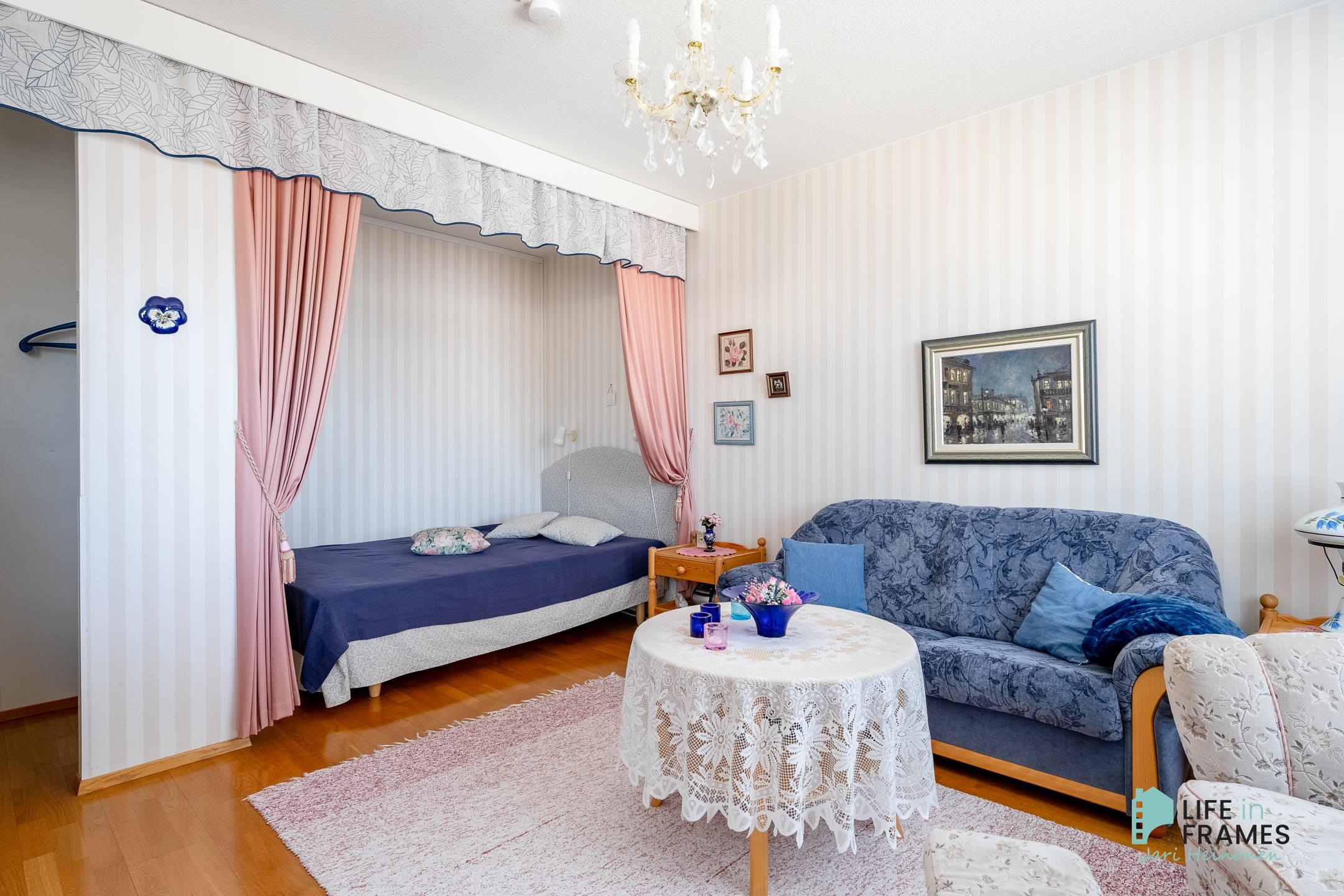 Keittiö: Parketti, maali. Olohuone: Parketti, tapetti. Kylpyhuone: Laatta, kaakeli.