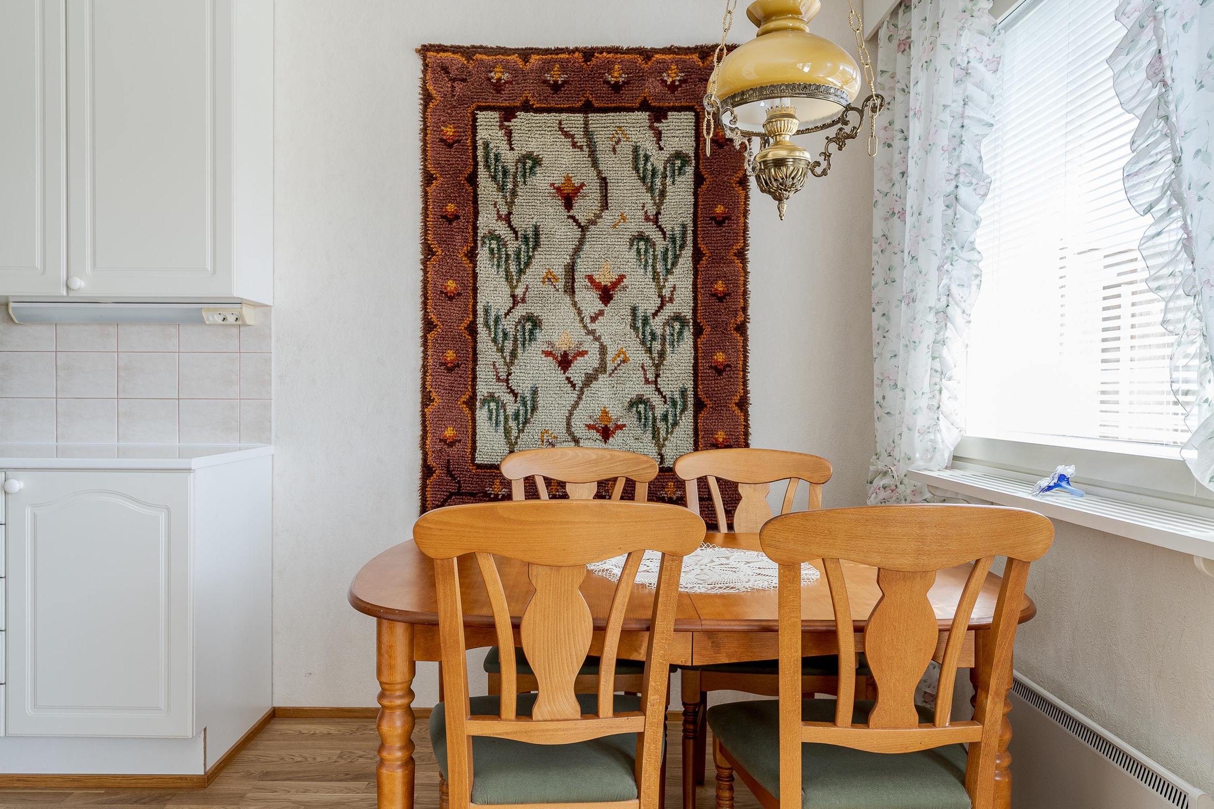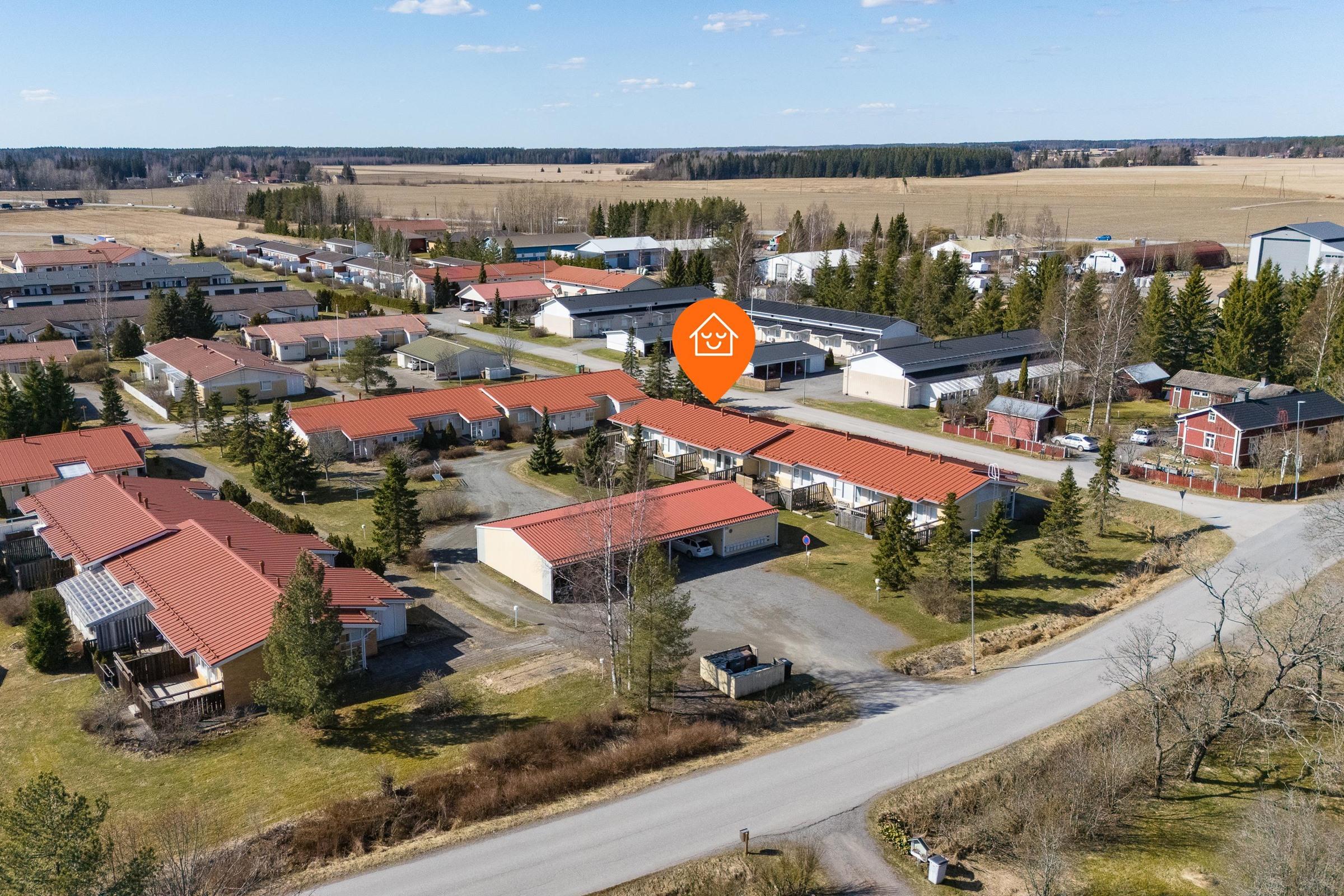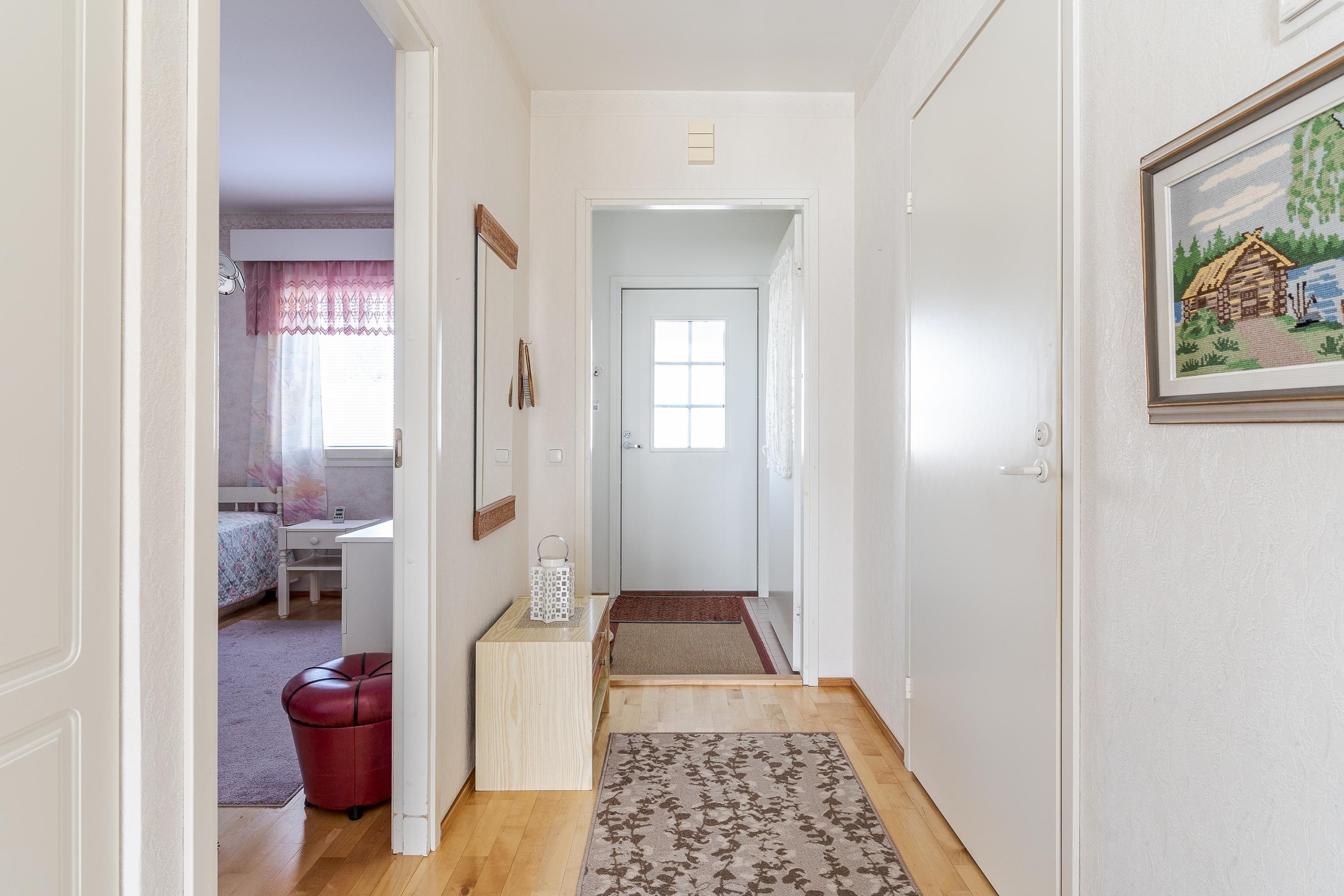 Kodin pohjaratkaisu on käytännöllinen: olohuone ja keittiö muodostavat arjen yhteisen tilan, jossa on helppo seurustella ja laittaa ruokaa yhtä aikaa. Makuuhuoneessa on tilaa sekä sängylle että säilytykselle, ja erillinen vaatehuone helpottaa arkea. Kylpyhuone on kokonaan laatoitettu, siellä on lattialämmitys ja liitäntä pyykinpesukoneelle. Oma sauna tuo kotiin rauhallisen rentoutumispaikan. Parkettilattiat, tuulikaappi ja ulkovarasto viimeistelevät kokonaisuuden.