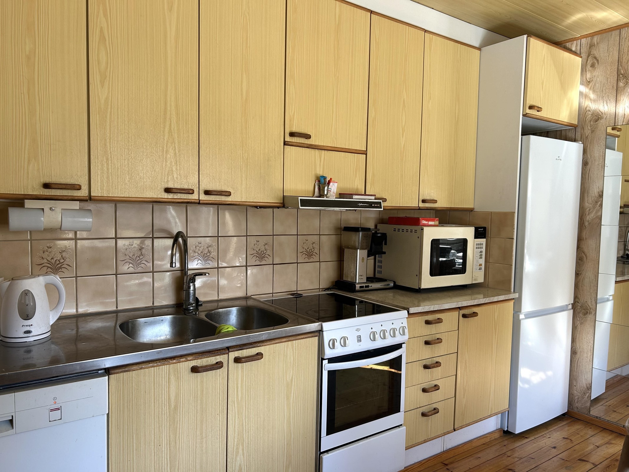 - Jääkaappipakastin, lattialiesi, keraaminen liesi, liesituuletin, astianpesukone, kaapistot, kiinteät valaisimet, pöytätasojen materiaali laminaatti.