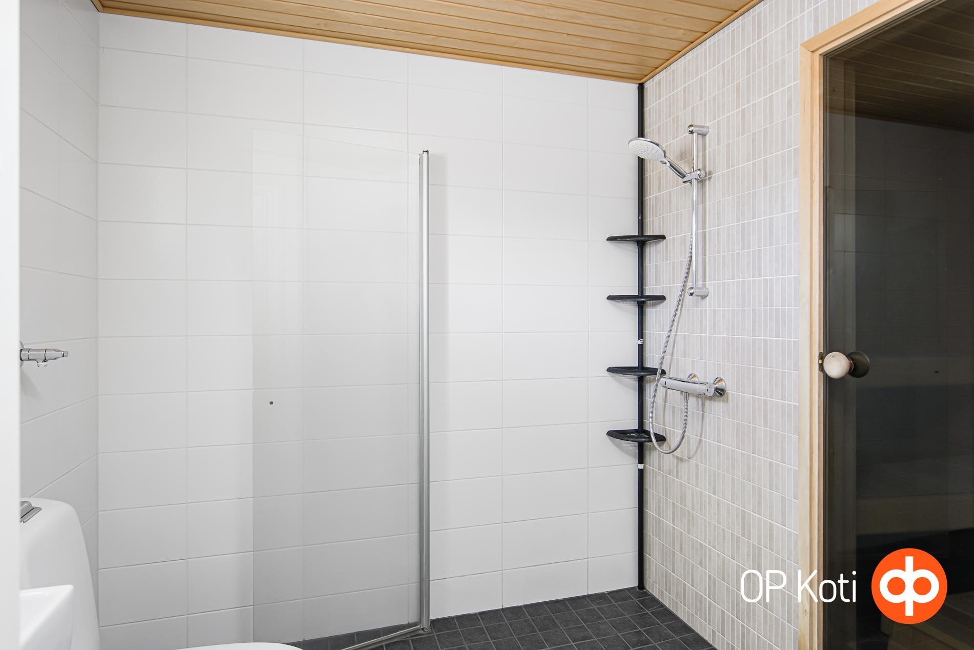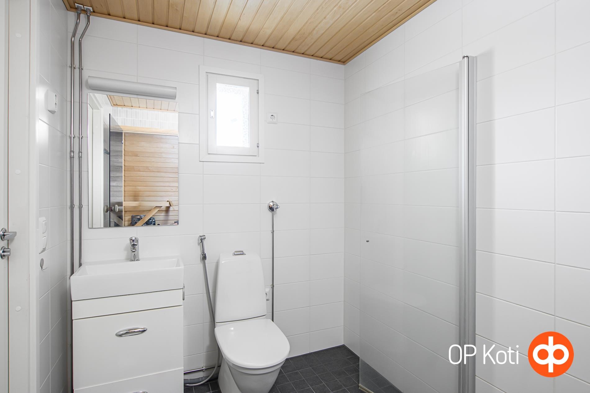 - Sauna, sähkökiuas Pilarikiuas, kylpyhuone, suihku, suihkuseinä, peilit, allaskaappi, pesukoneliitäntä, kiinteät valaisimet.